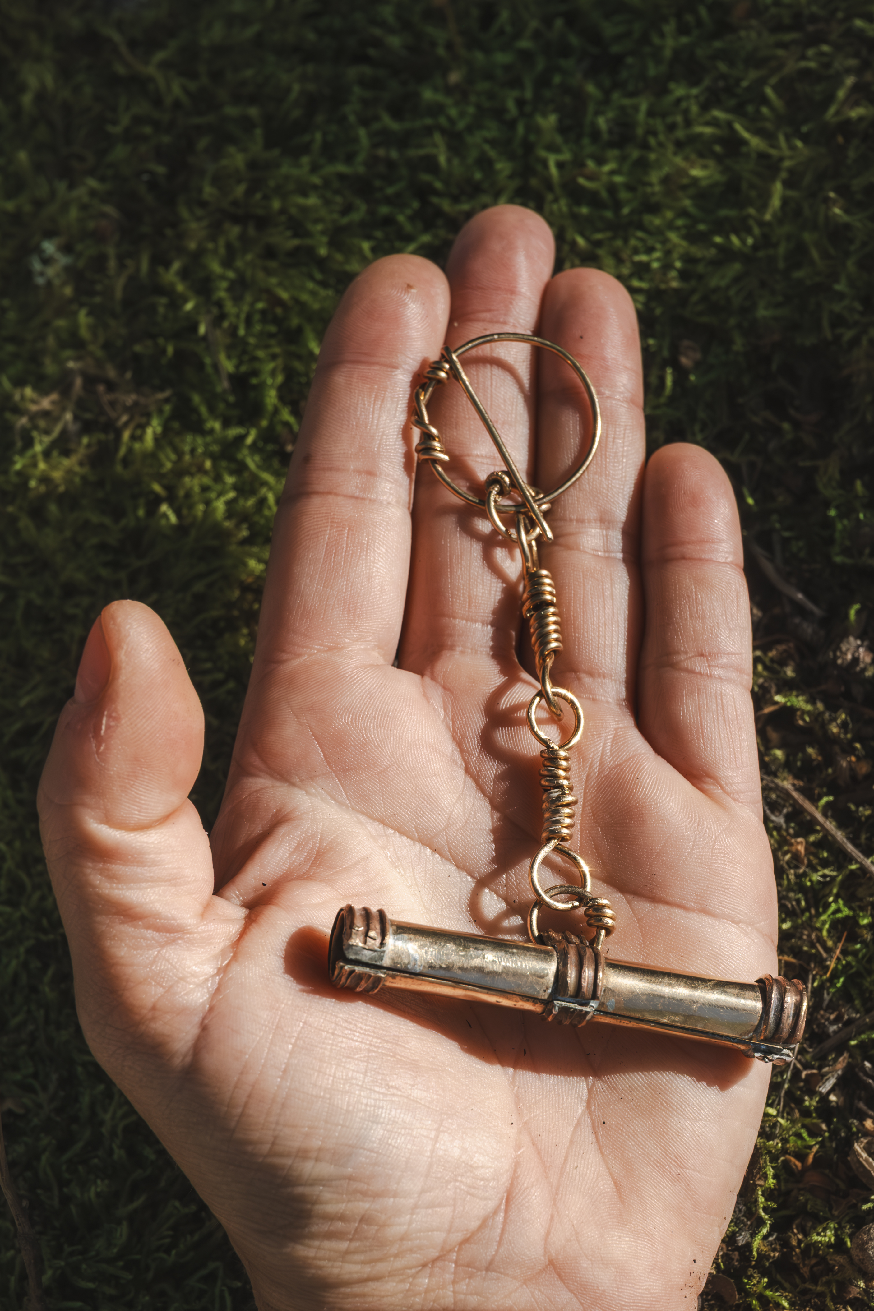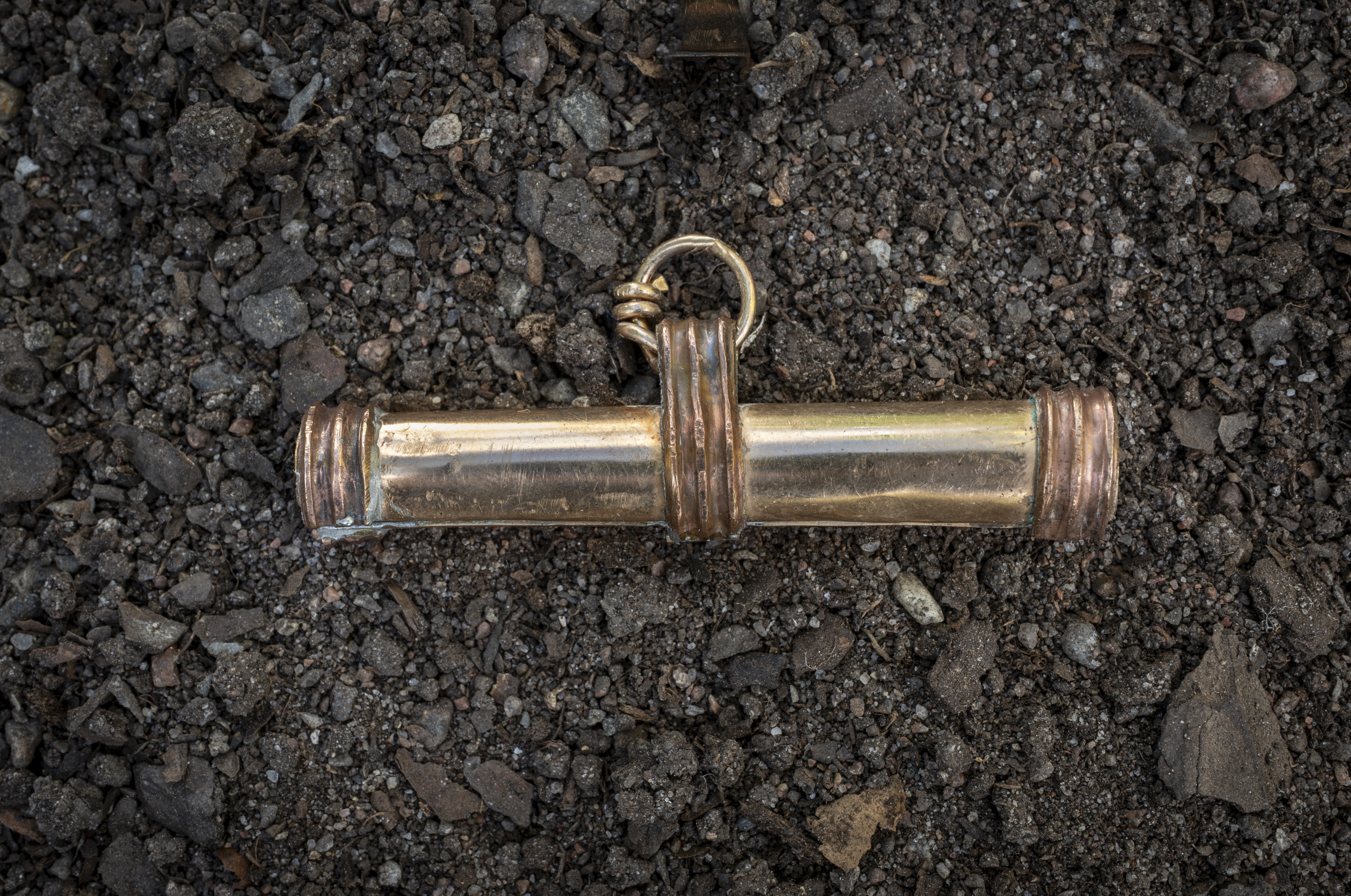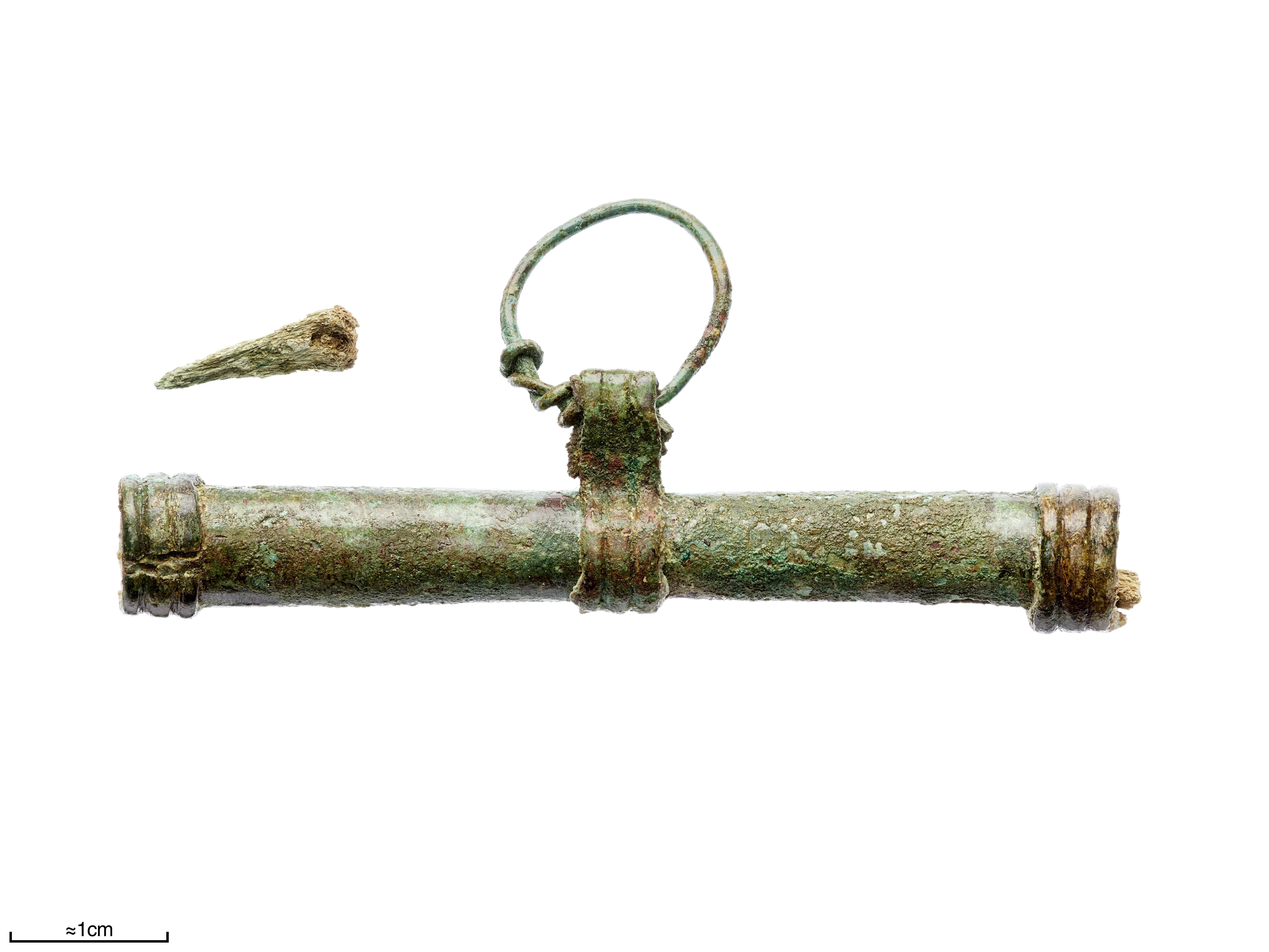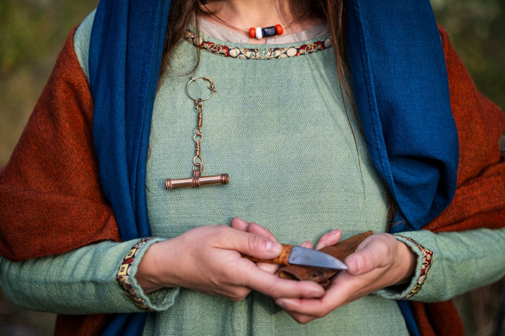 In grave A28, a very small and simple bronze ring brooch was found, as well as a needle case together with fragments of a bronze chain/links. All grave finds were at the height of the woman’s chest/waist. Since the grave lacks buckle double brooches, my interpretation is that the ring brooch functioned as a tool buckle that was attached to the dress and carried the needle case via a chain. Similar solutions with a small ring brooch, chain and tool such as a needle case or key are common finds in women’s graves on Gotland during the Viking Age. When I read archaeological reports about other excavations in the area around Sollentuna, I discovered that a very similar needle case and chain were found in a smaller grave field just a few hundred meters from the one I am recreating. This one is also dated to the Viking Age.
