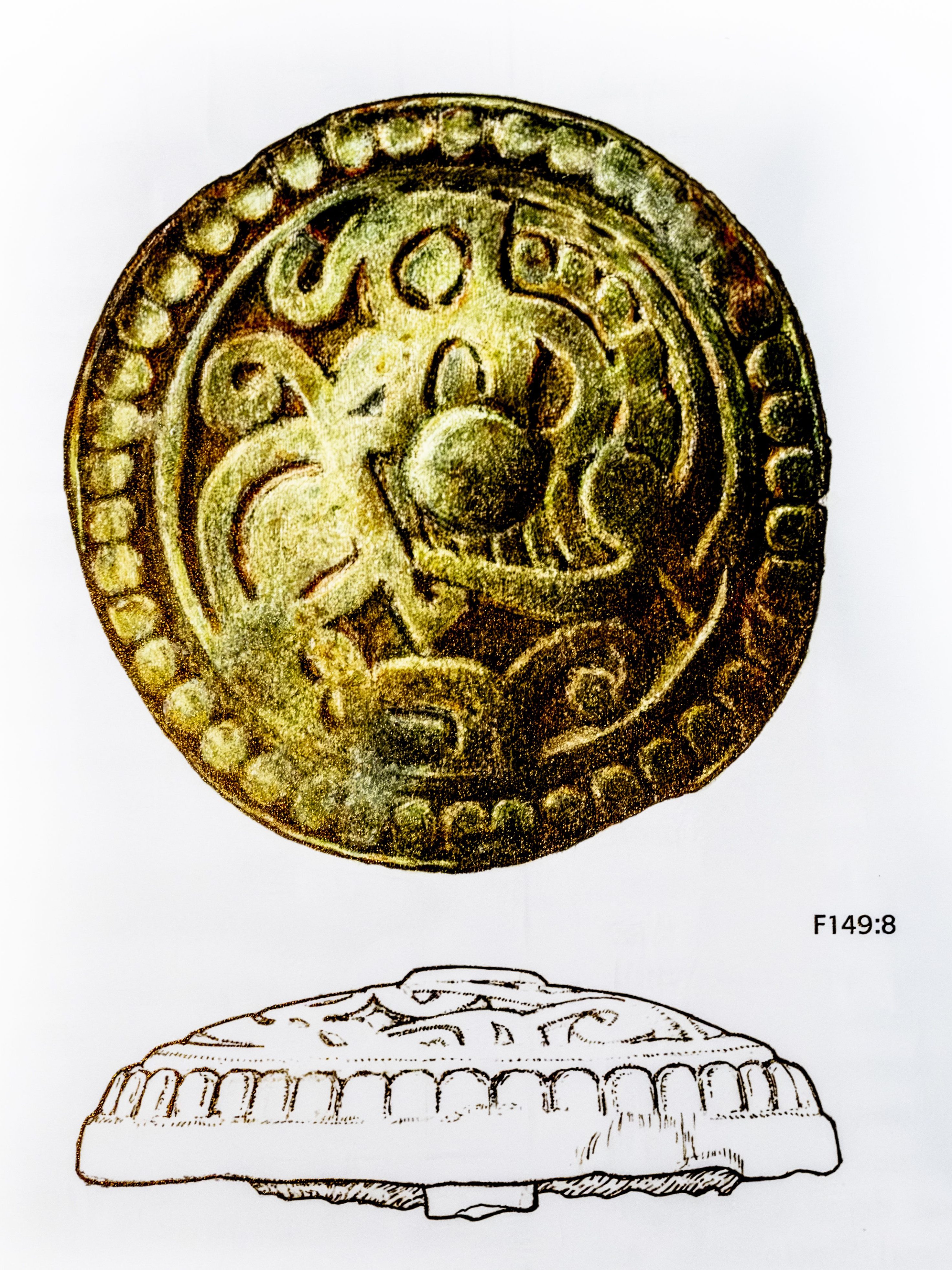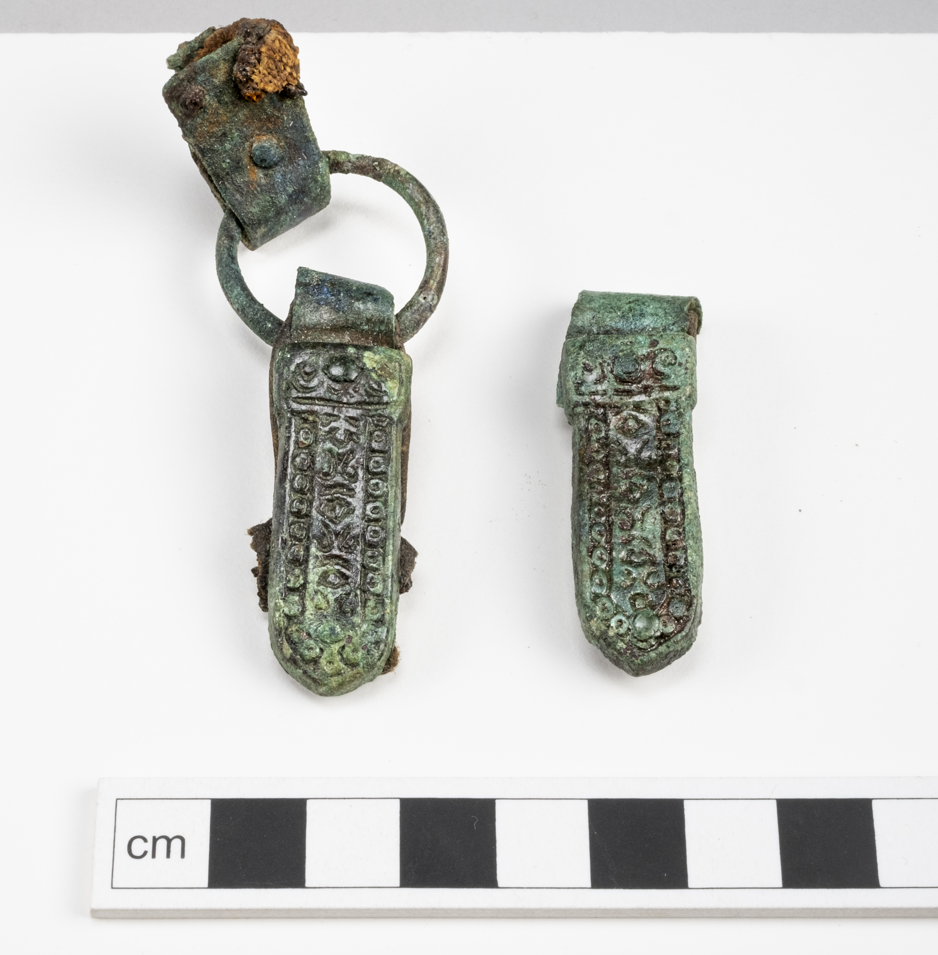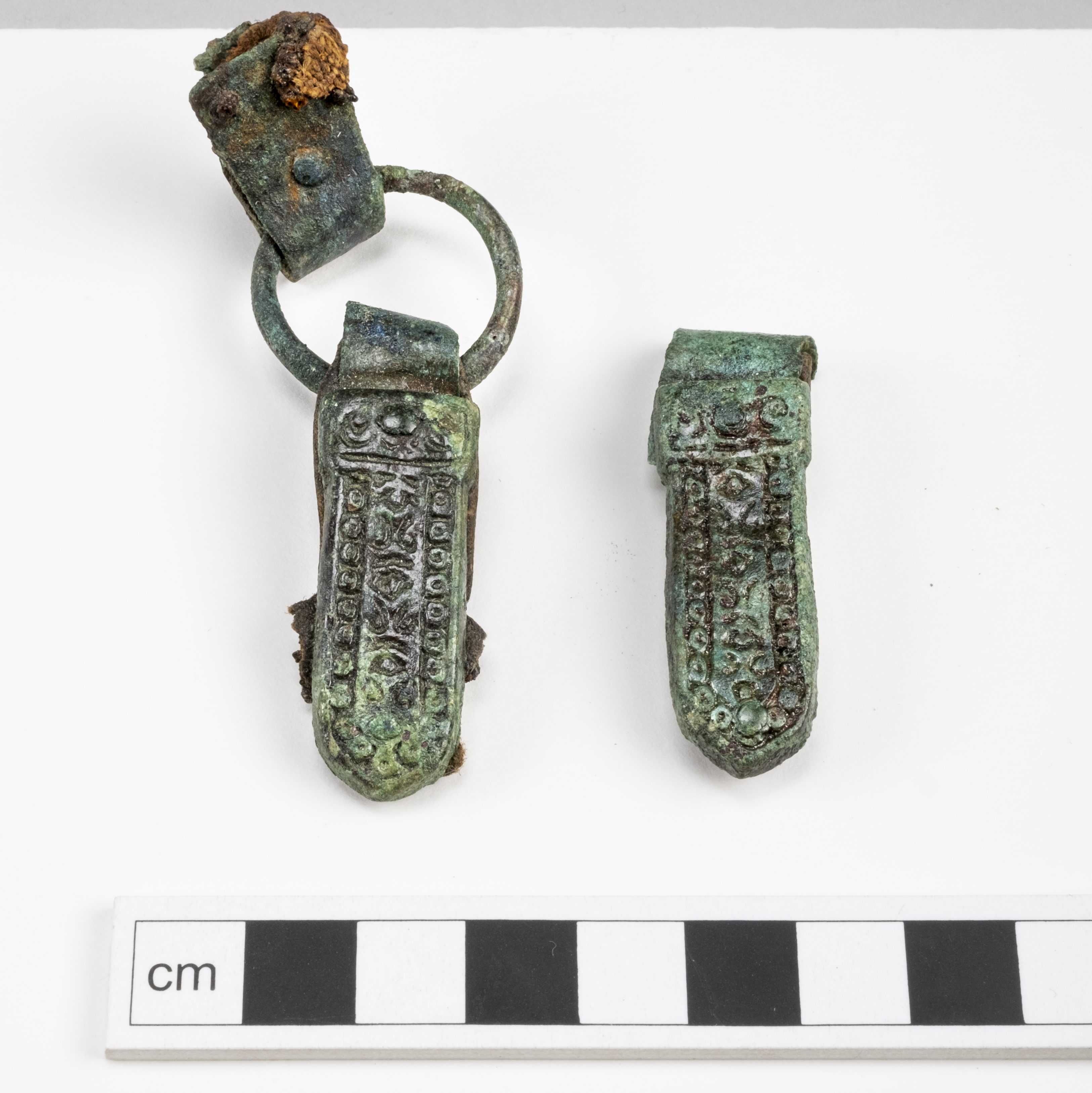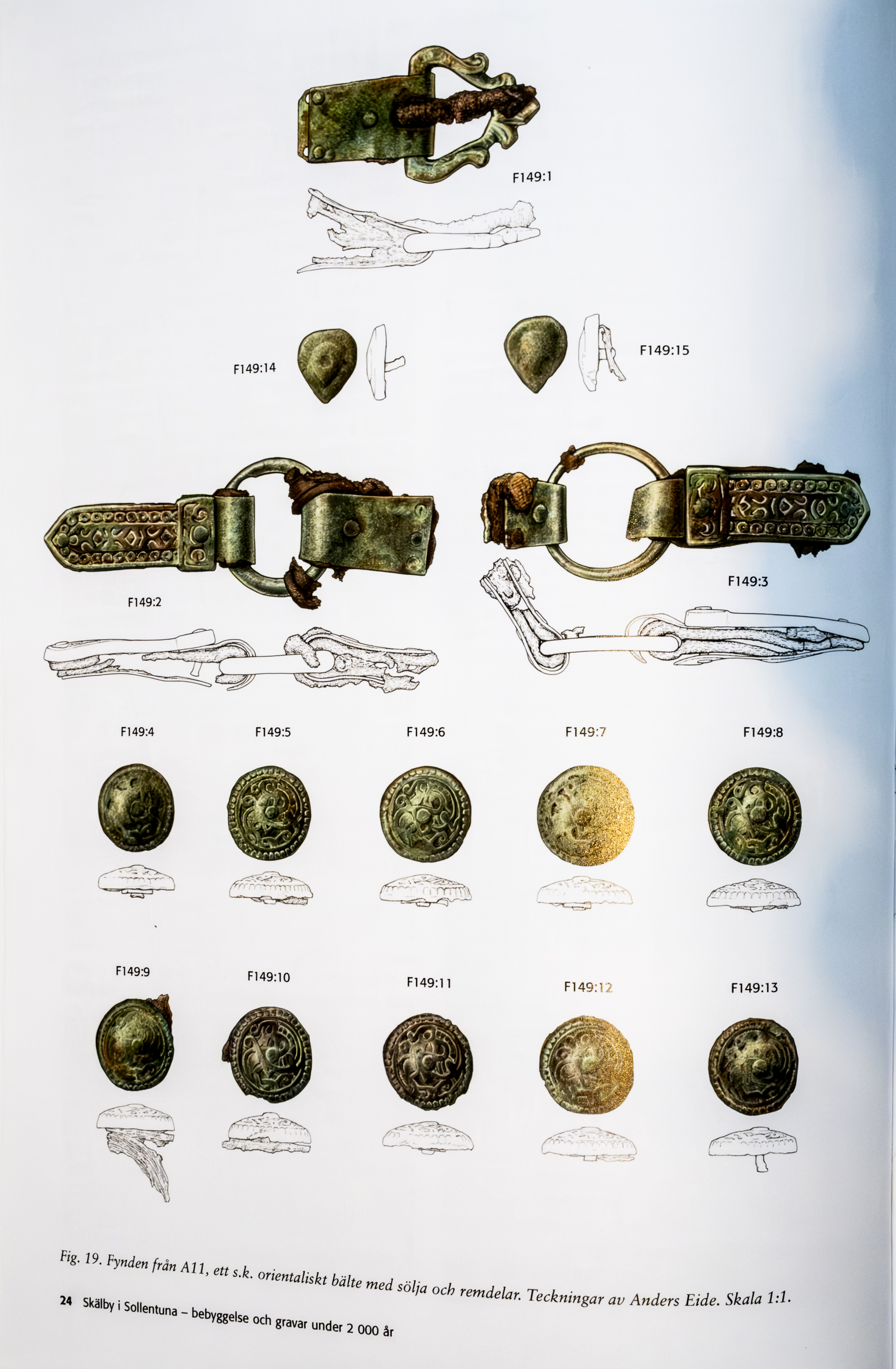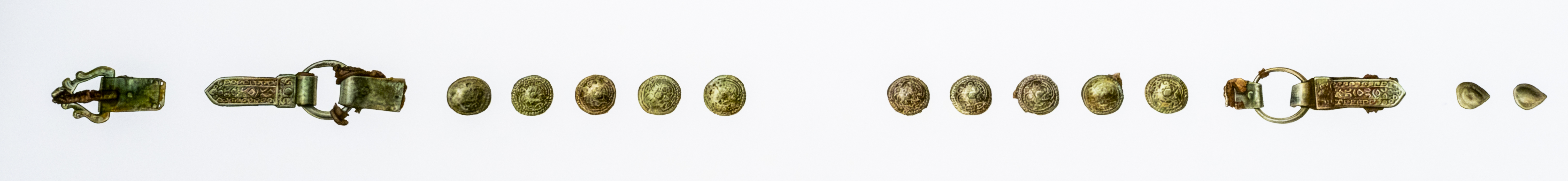 The round fittings have Nordic animal ornaments, the strap fittings and the buckle plant ornaments and the two heart-shaped ones are typically Eastern fittings, probably made in the Orient.