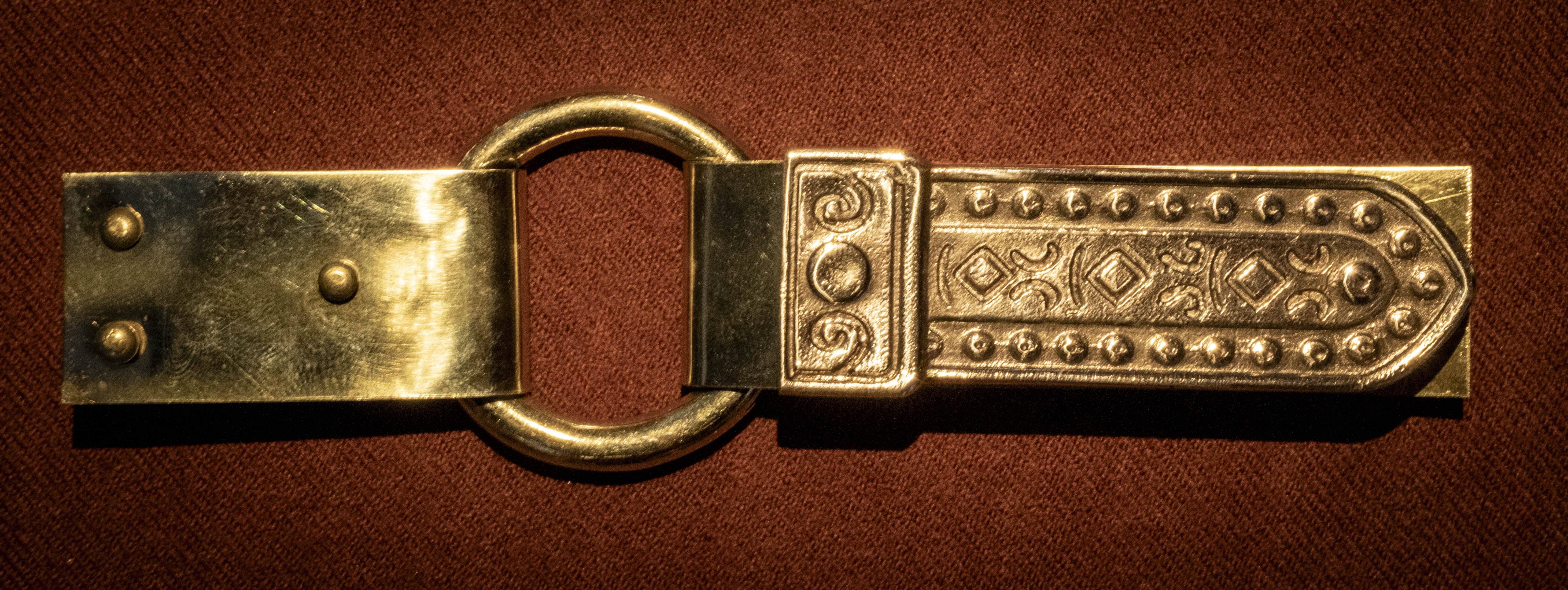 The belt in grave A11 is truly magnificent with 10 round fittings, 2 heart-shaped fittings, two interconnected strap fittings with bearing rings and a buckle in bronze/copper alloy.
