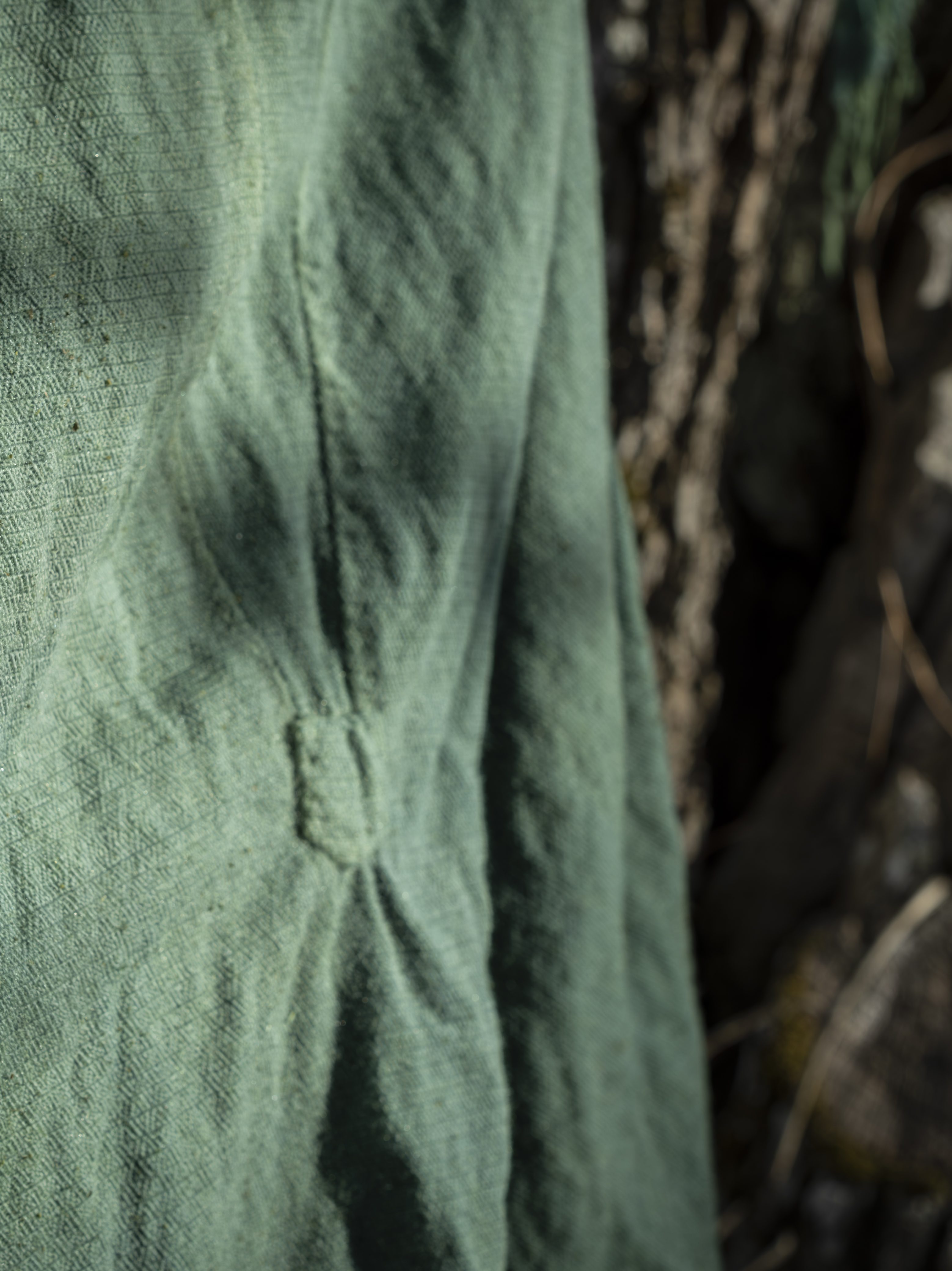 After sewing, I first plantdyed the tunic yellow with reseda and then a second dye with indigo. The result was a mint green shade. Not exactly the color I had in mind, but the fun thing about plantdyeing is that the shades don’t always turn out as you’d expect. Since green requires two dyeings, it’s still a fitting color for someone from the upper class of the Viking Age.