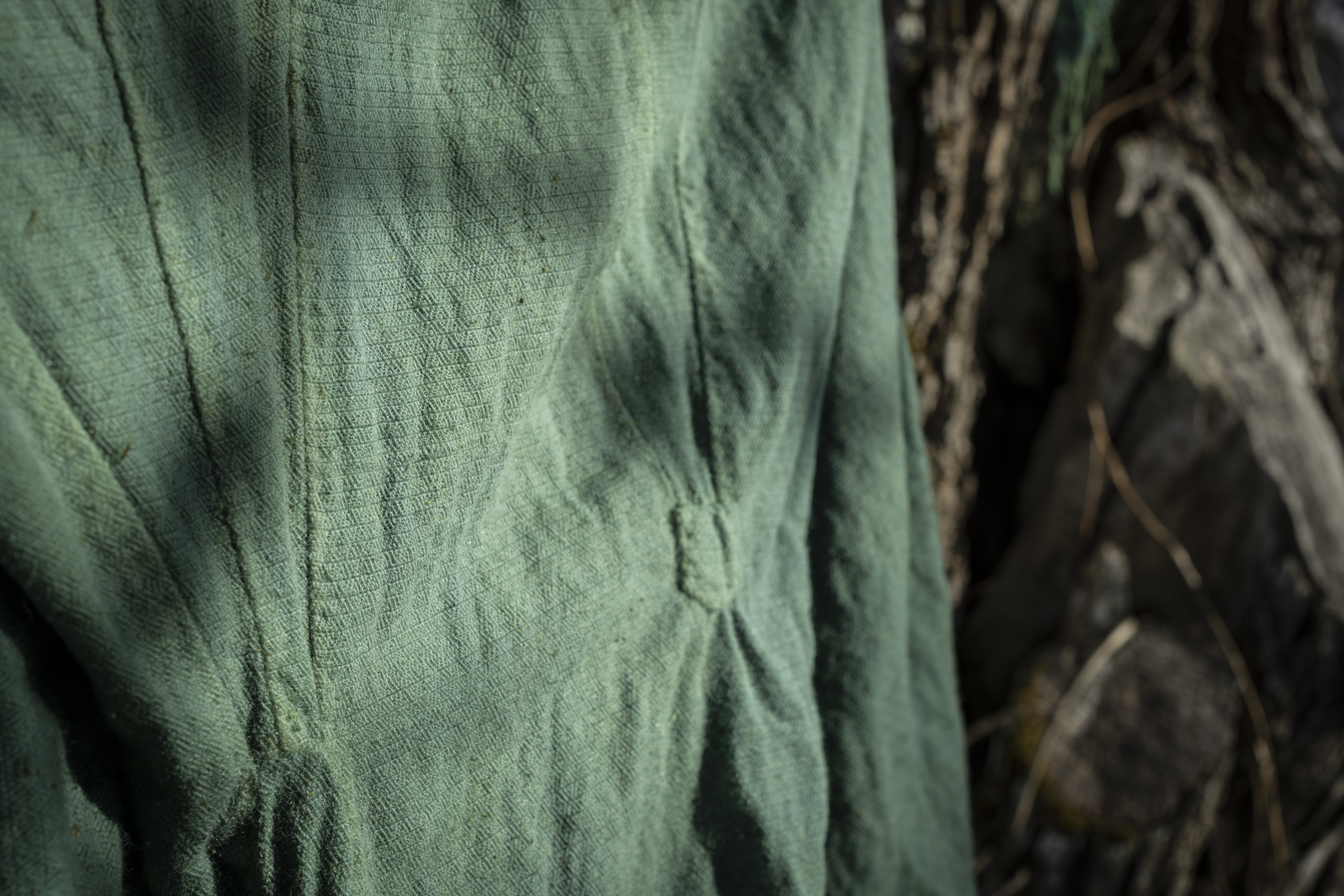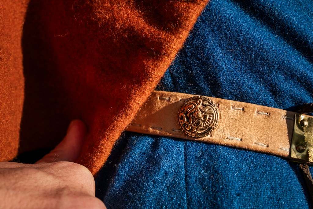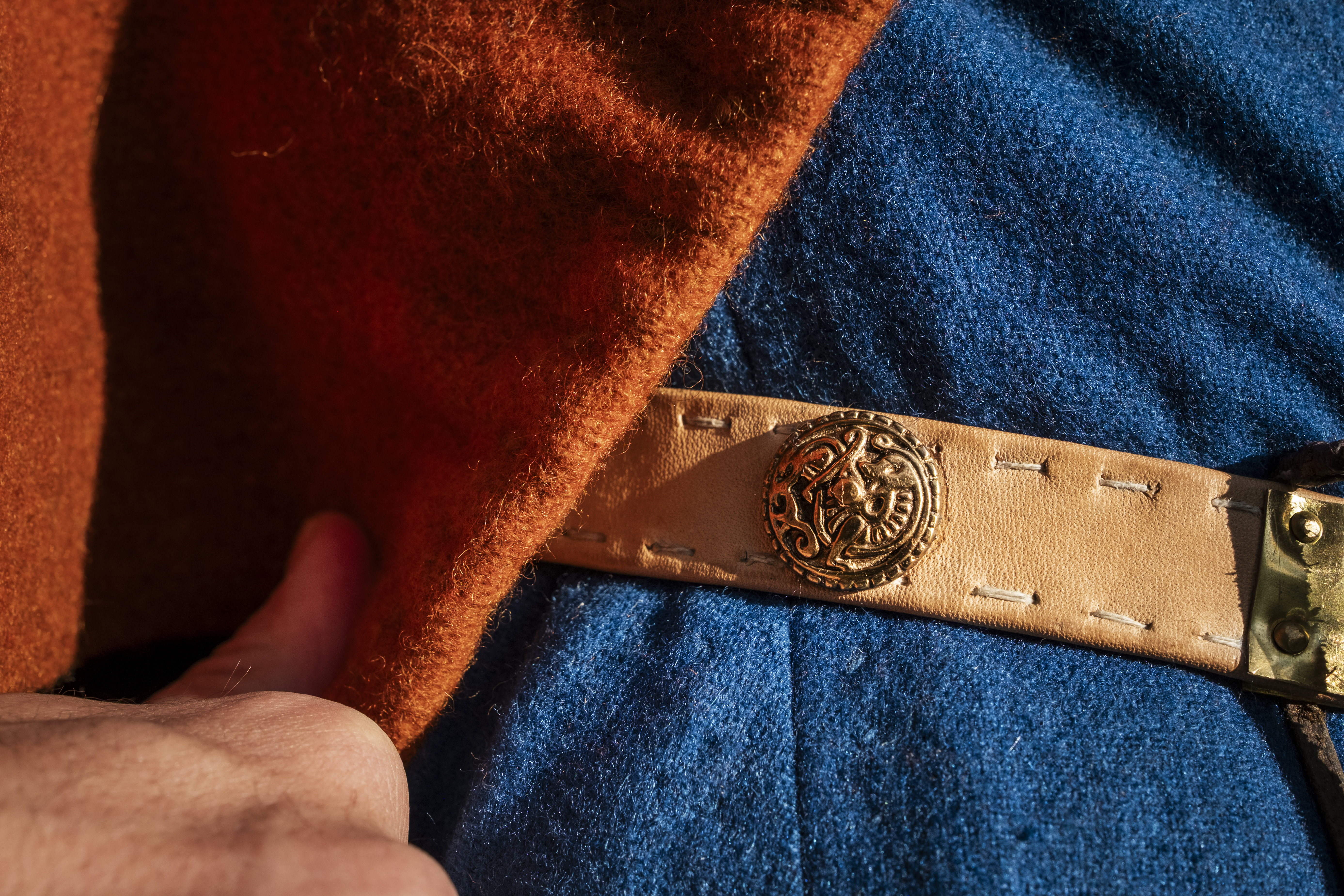 I chose to sew the trousers without a foot as it makes the construction easier, which was tricky to put together anyway. The find has seams that twist from the back along the legs to the front, creating a very tight fit. My trousers turned out really tight, but the construction, together with the elasticity of the 2/2 twill, means that they are surprisingly easy to move in. You can squat and probably ride in them. The fabric quality matches quite well with most textile finds from the city layers in Sigtuna from the beginning of the 11th century. Since the original has loops for a belt, I chose to weave a simple, narrow belt with sun-bleached linen thread with a small bronze buckle. All of these are interpretations are based on the very few archaeological finds we have of Viking Age trousers in Scandinavia, and I wish I had more and better sources to base my work on.