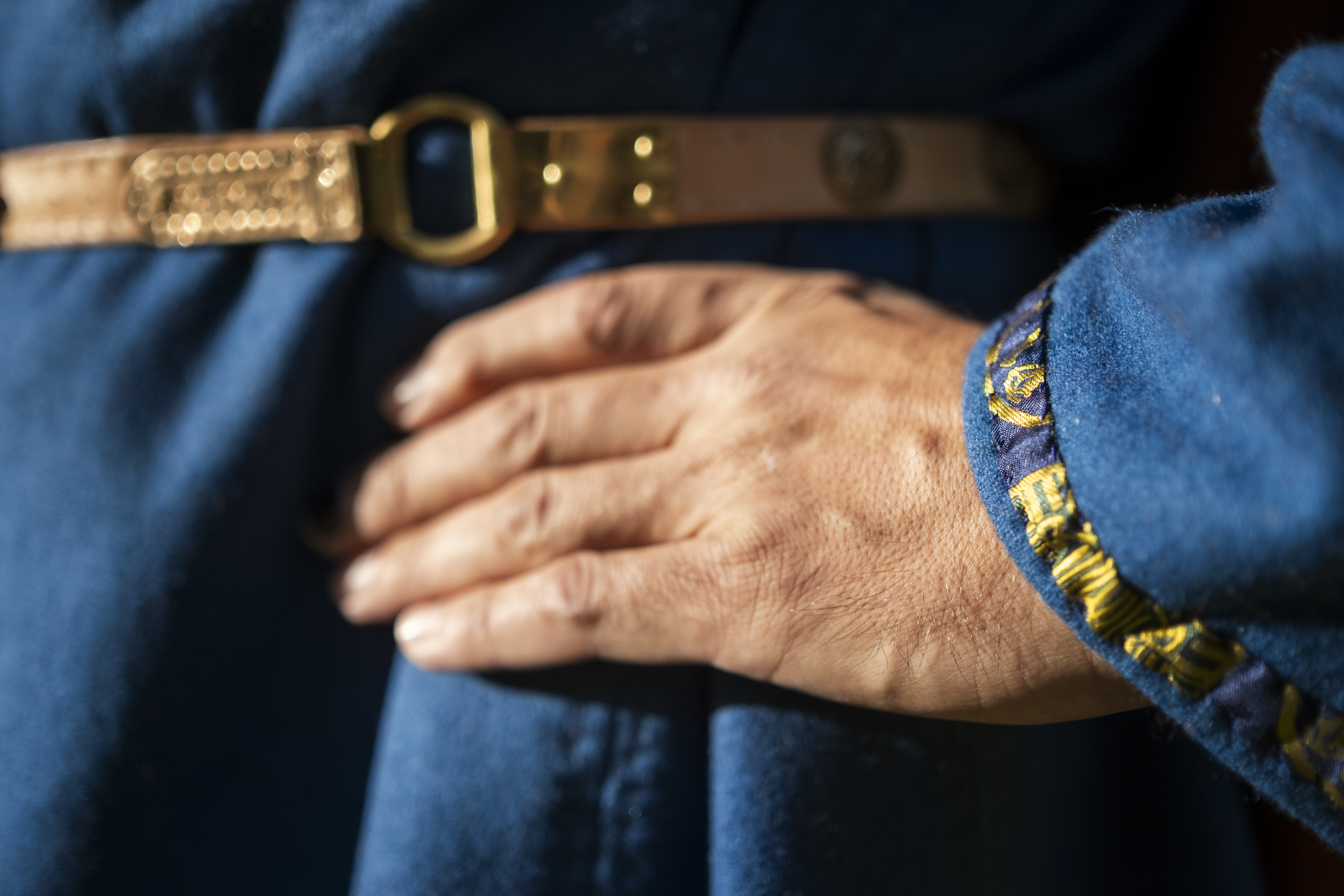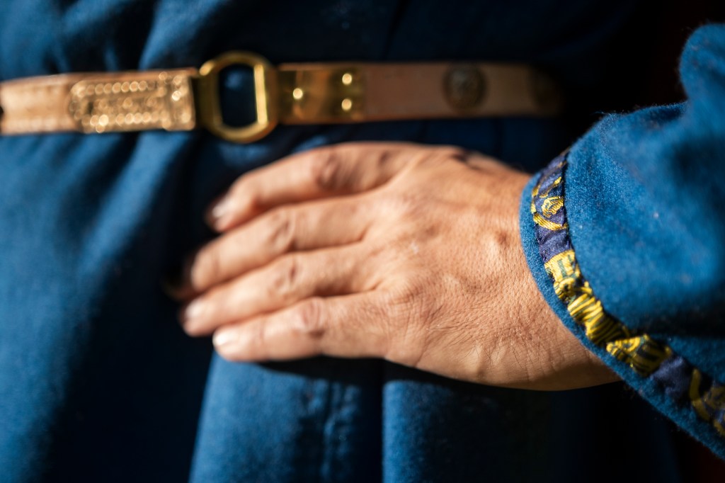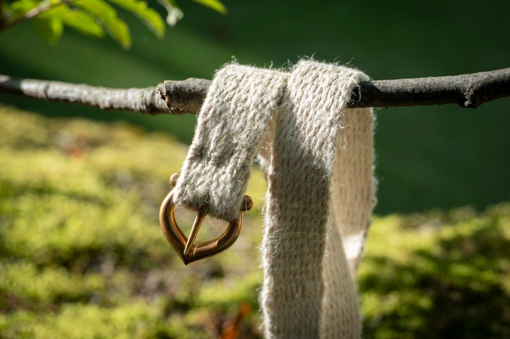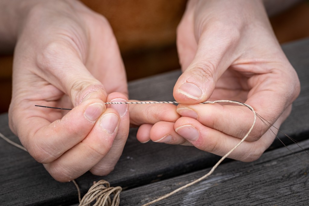 I chose to sew the trousers without a foot as it makes the construction easier, which was tricky to put together anyway. The find has seams that twist from the back along the legs to the front, creating a very tight fit. My trousers turned out really tight, but the construction, together with the elasticity of the 2/2 twill, means that they are surprisingly easy to move in. You can squat and probably ride in them. The fabric quality matches quite well with most textile finds from the city layers in Sigtuna from the beginning of the 11th century. Since the original has loops for a belt, I chose to weave a simple, narrow belt with sun-bleached linen thread with a small bronze buckle. All of these are interpretations are based on the very few archaeological finds we have of Viking Age trousers in Scandinavia, and I wish I had more and better sources to base my work on.