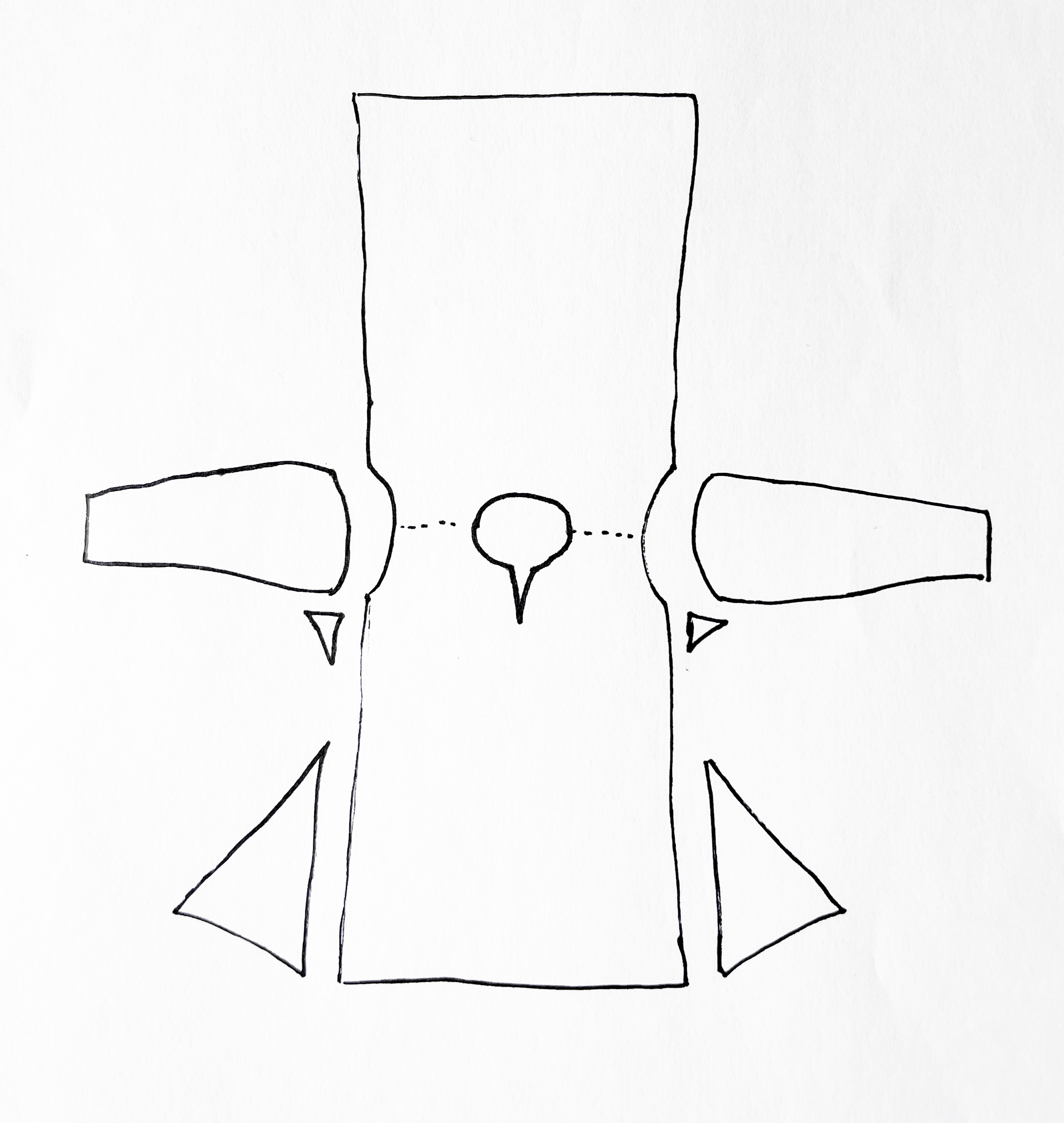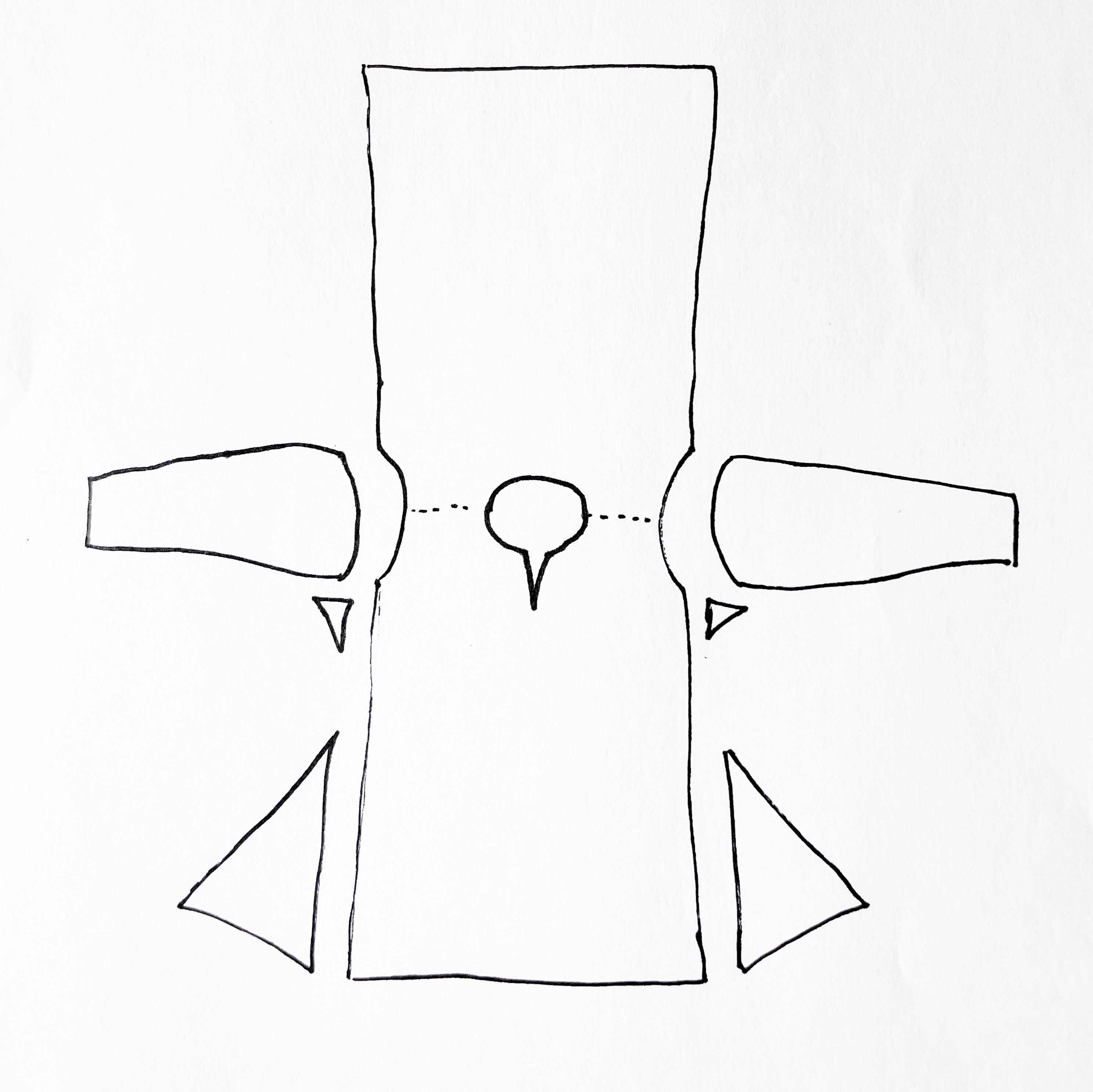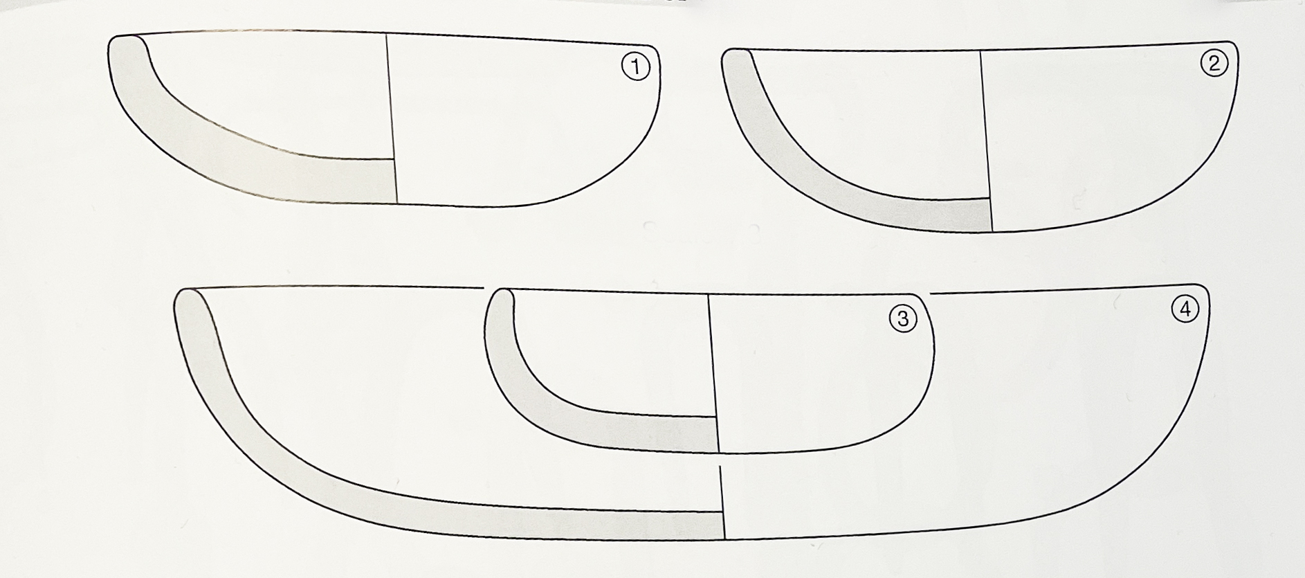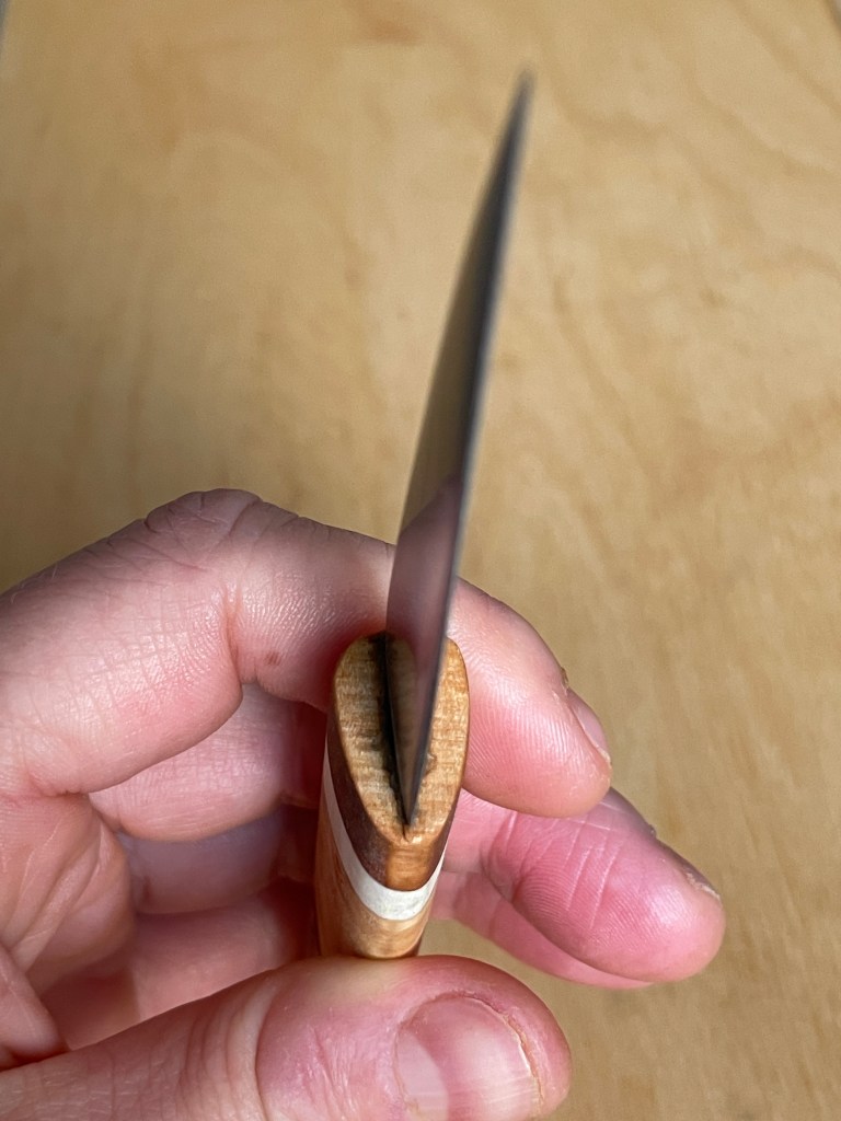 After looking at the originals, I enlisted the help of my friend Peter Johnsson and discussed the likely shape of the knife blade, edge and handle based on what were common shapes during the Scandinavian Viking Age. Below is a schematic diagram showing how the back of the knife blade is straight but dips slightly downwards towards the tip and how the entire edge is triangular shaped. The handle should be slightly flat at the top and oval-rounded at the bottom to fit comfortably in the hand. Although no remains of handle rivets have been found, I chose to join my knife handle and blade with brass rivets and a small brass plate.