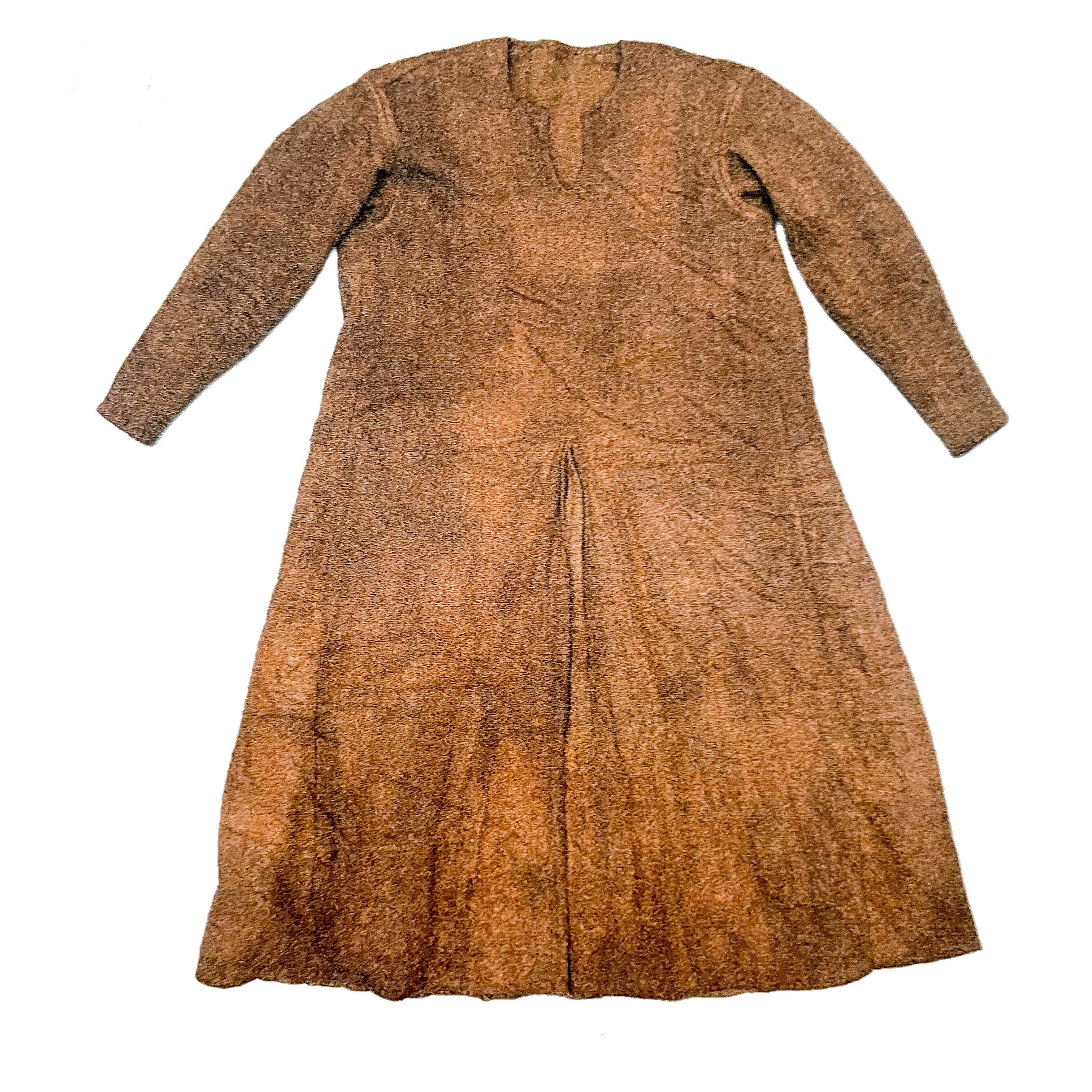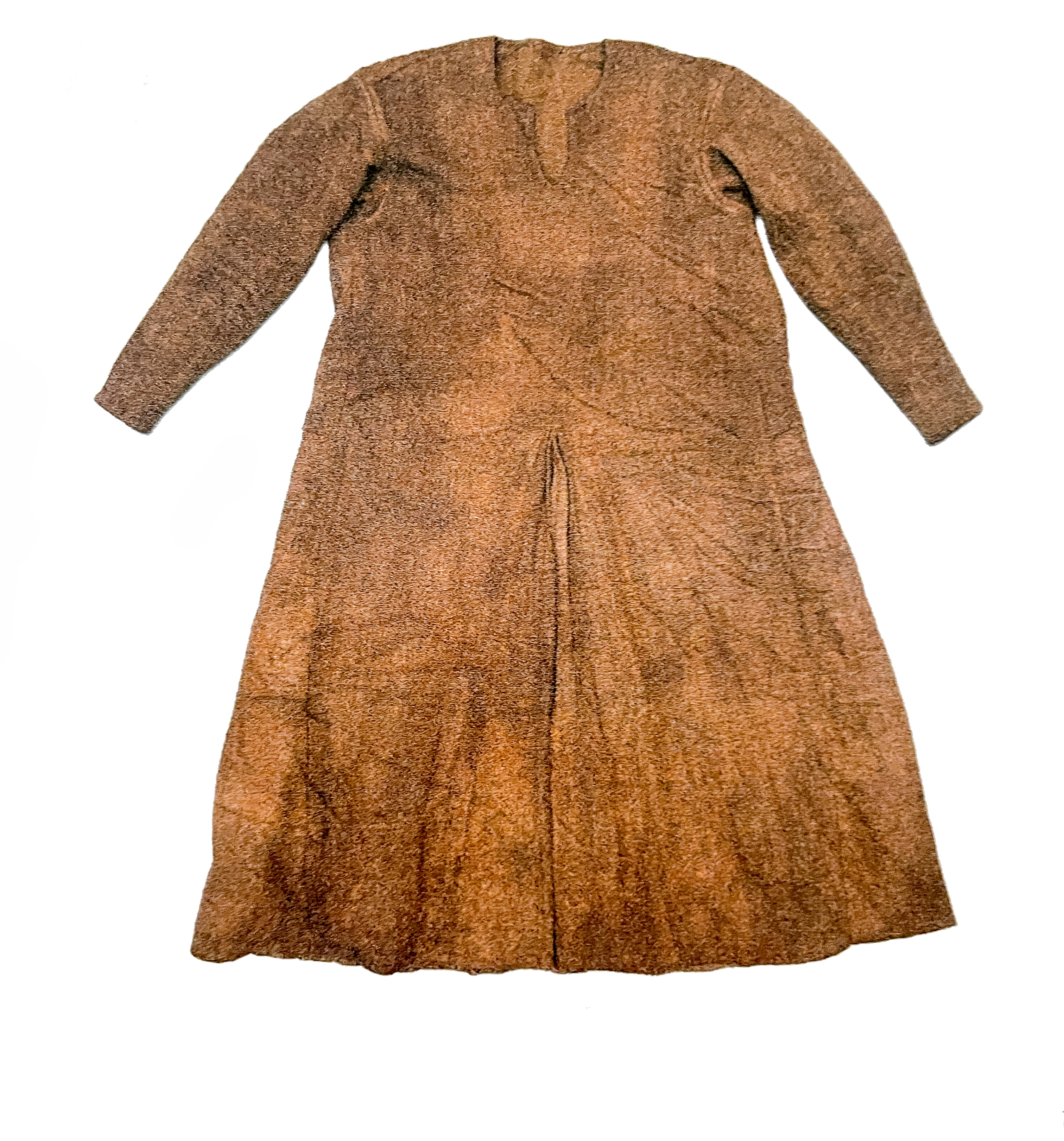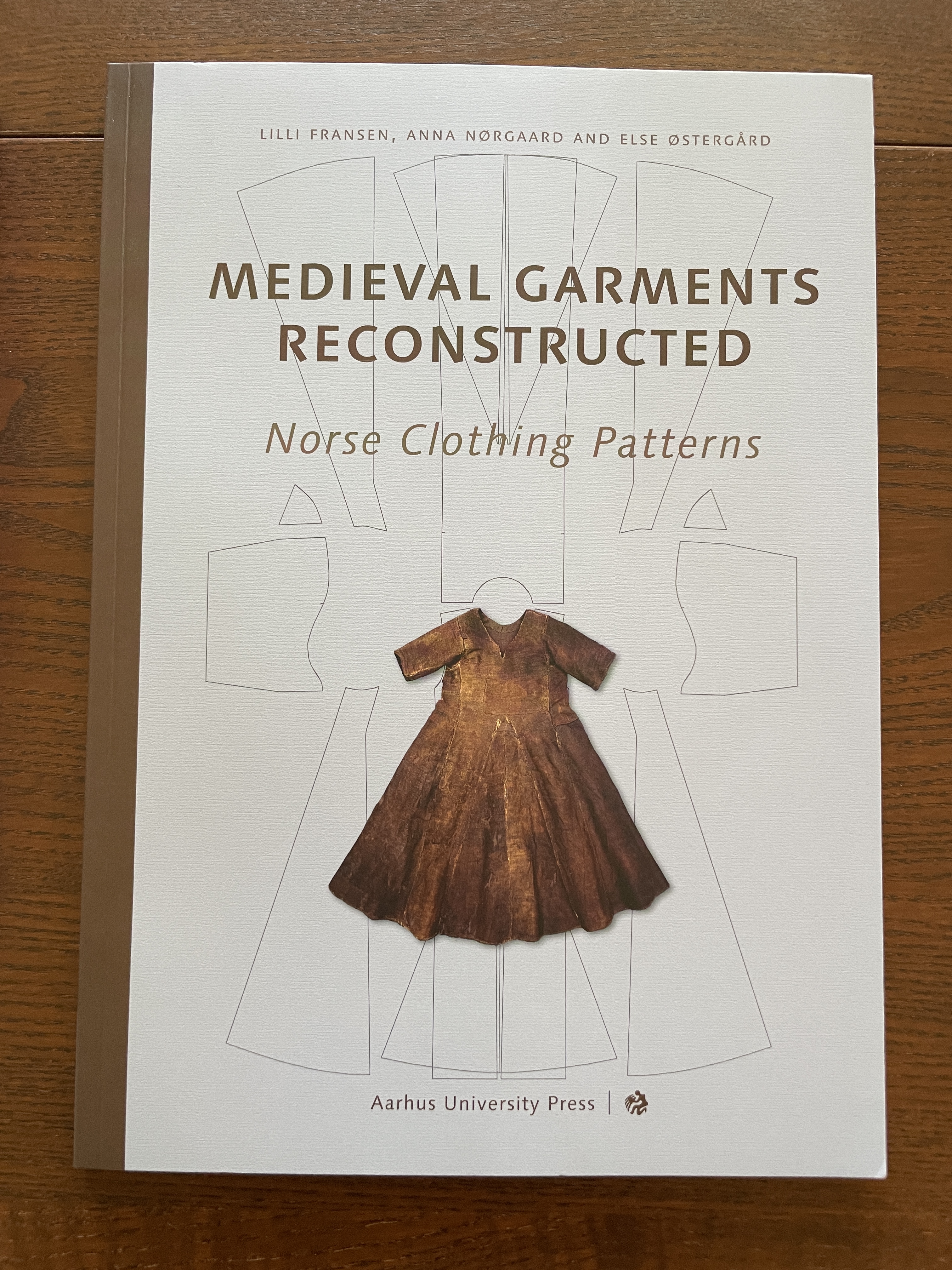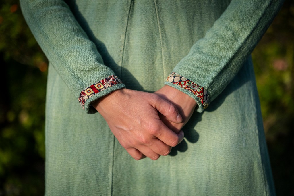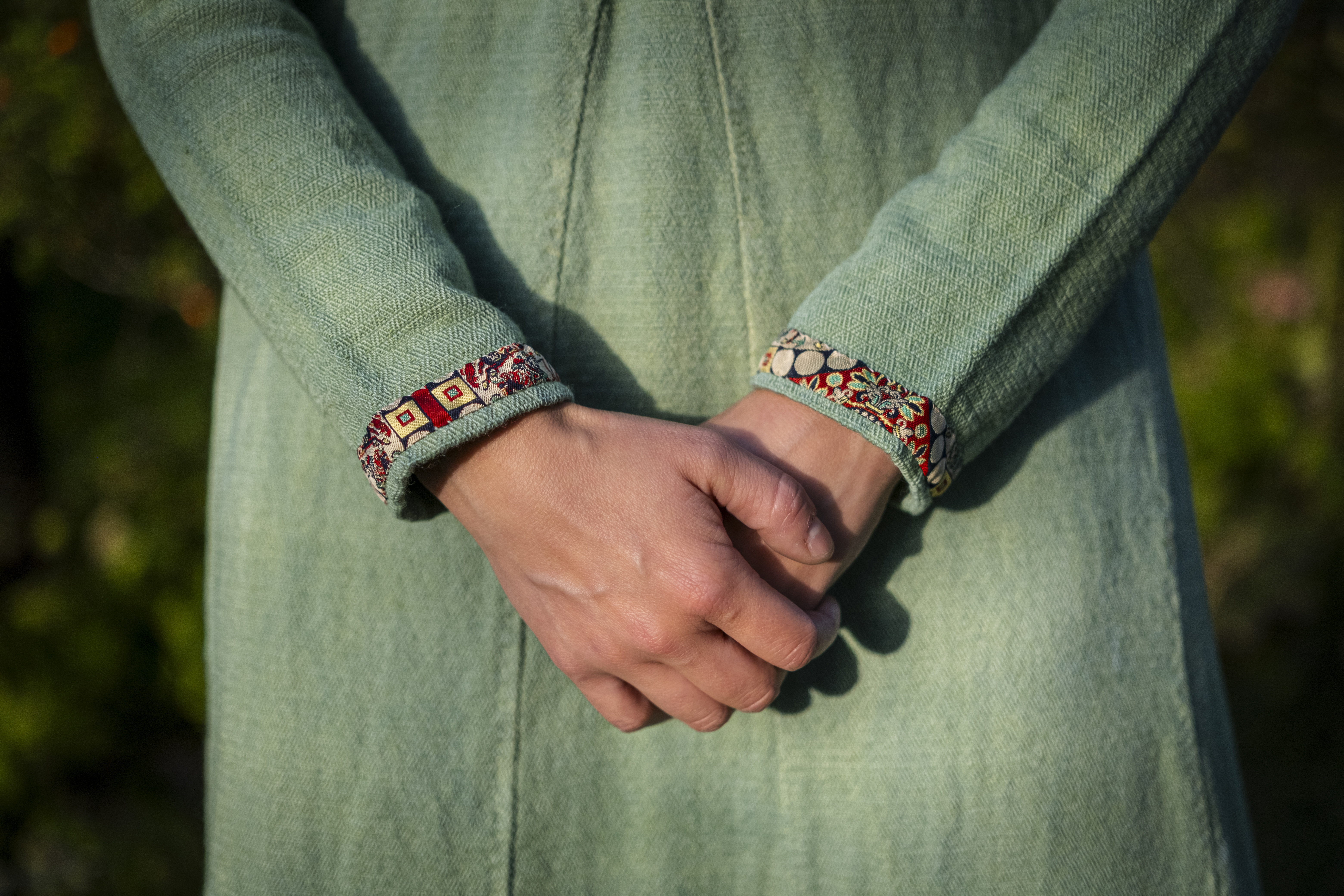 When the fabric was finished, I handsew a long-sleeved, floor-length dress with a round neckline, in rectangular pieces with four gussets. Initially, I had planned to only have gussets on the sides, but since I was limited by the width of the fabric of 70 cm and wanted to avoid more than a handful of fabricwaste, I added gussets at the front and back for greater mobility. The fabric was a challenge to sew in as it is stiff and thread-tight but at the same time easily scratches at the edges. Therefore, I chose to sew small reinforcements at the top of the gussets. Such reinforcements also appear on some of the tunics from Herjolfnäs in Greenland. (Thanks to the gussets, the dress can be worn well into pregnancy, which was probably a practical requirement during the Iron Age.)