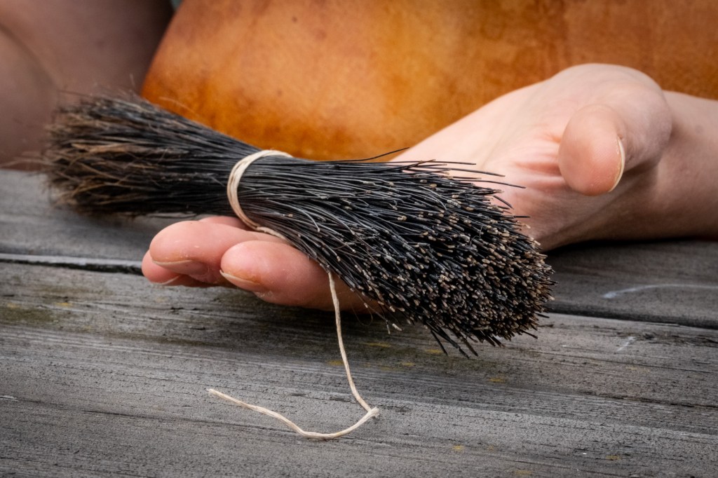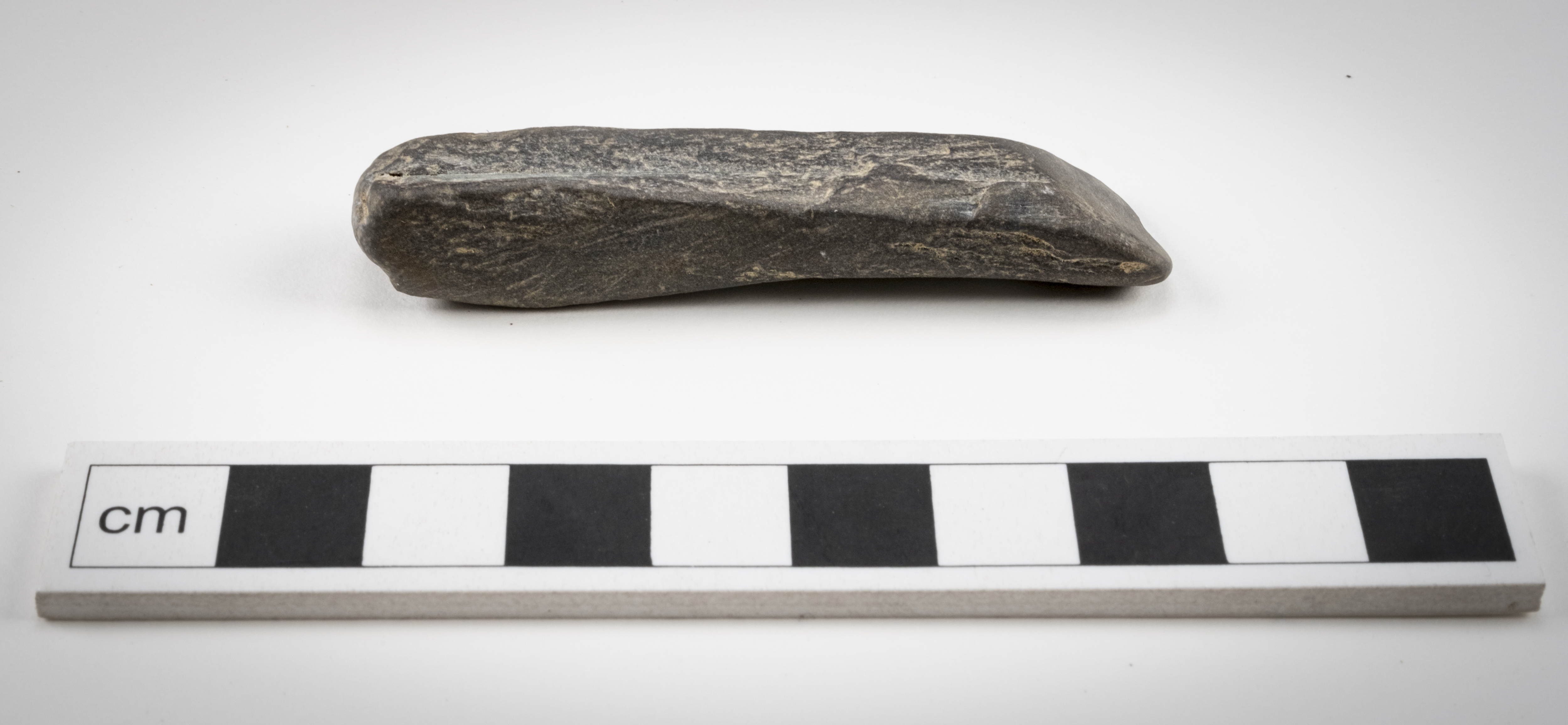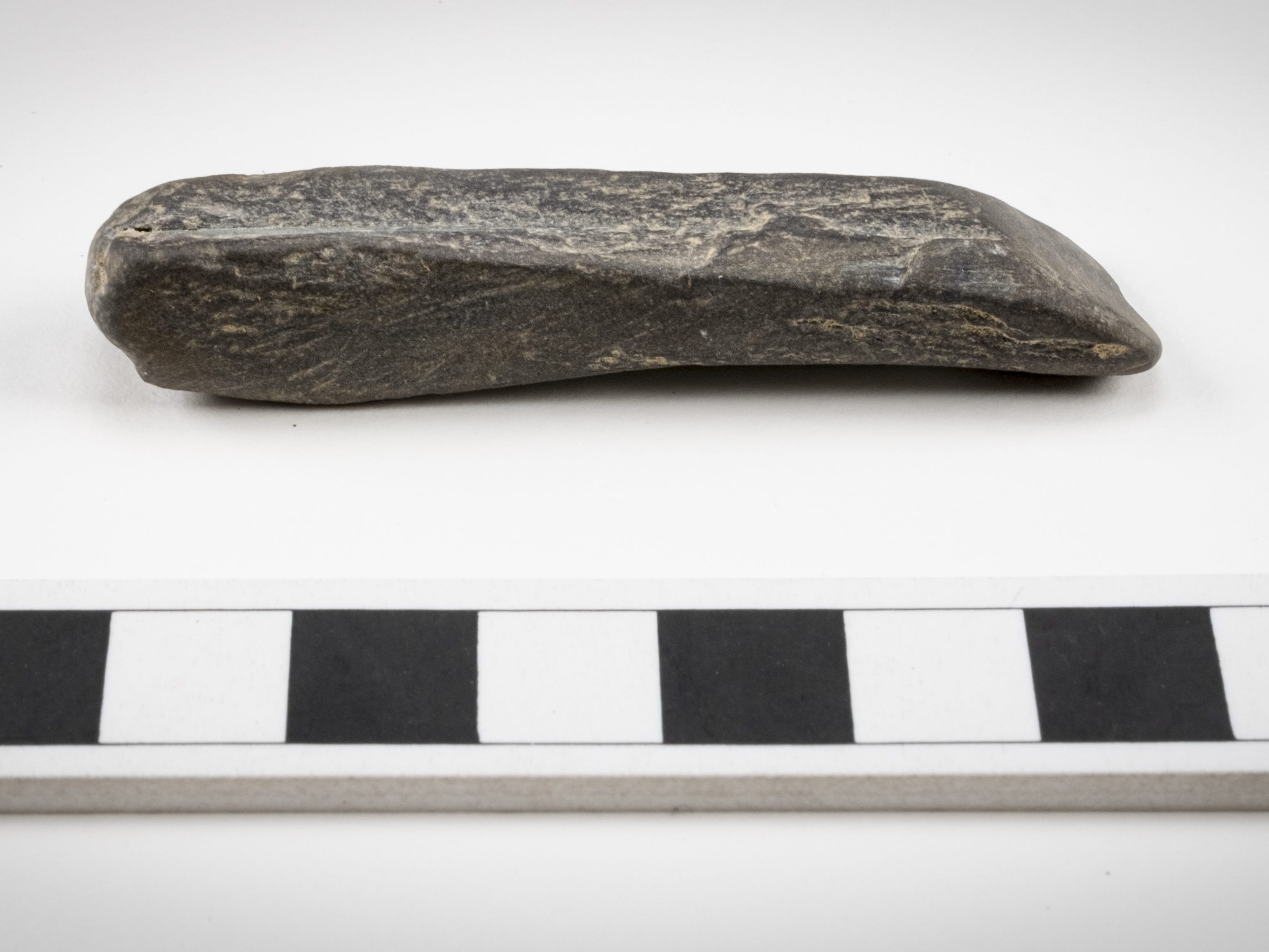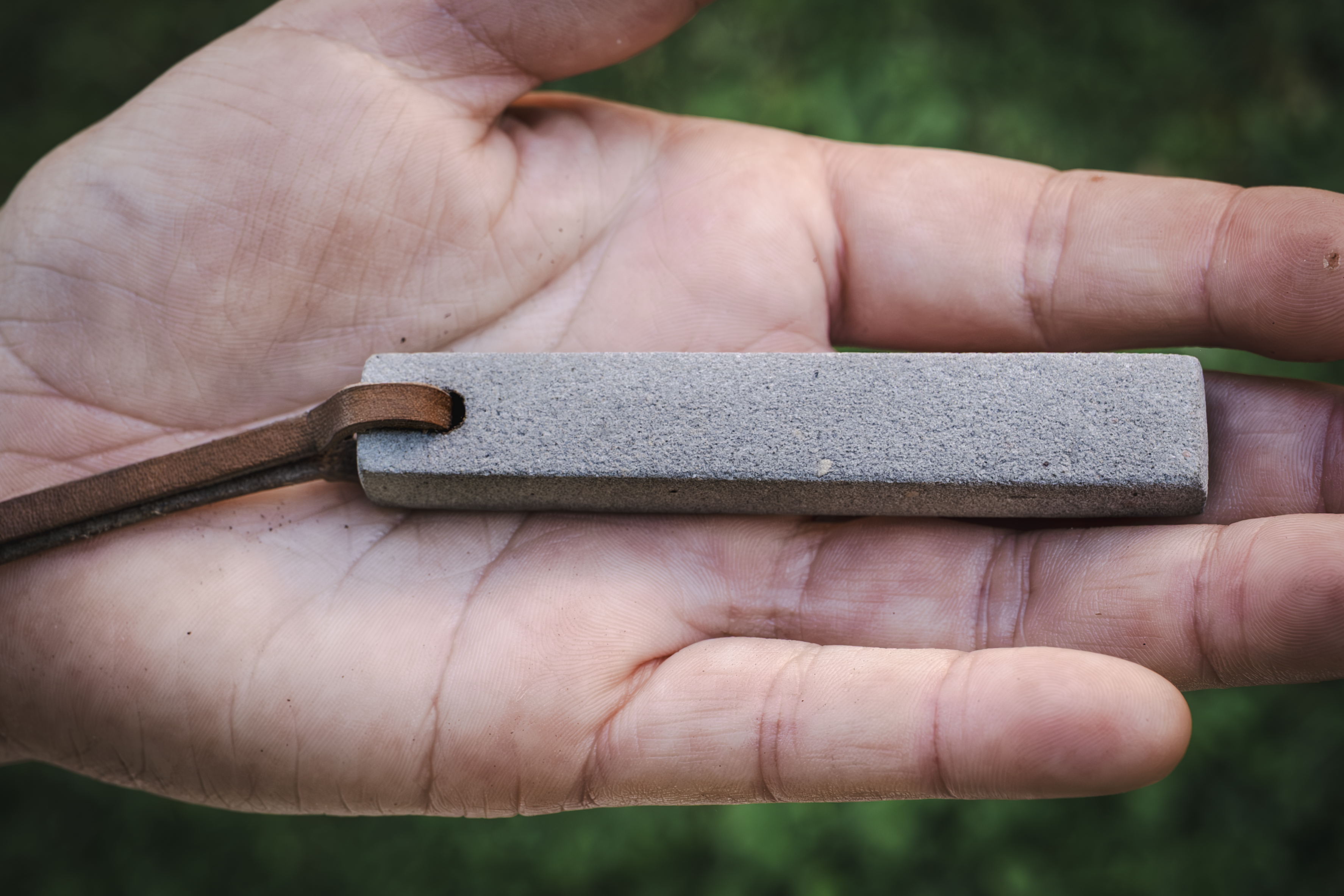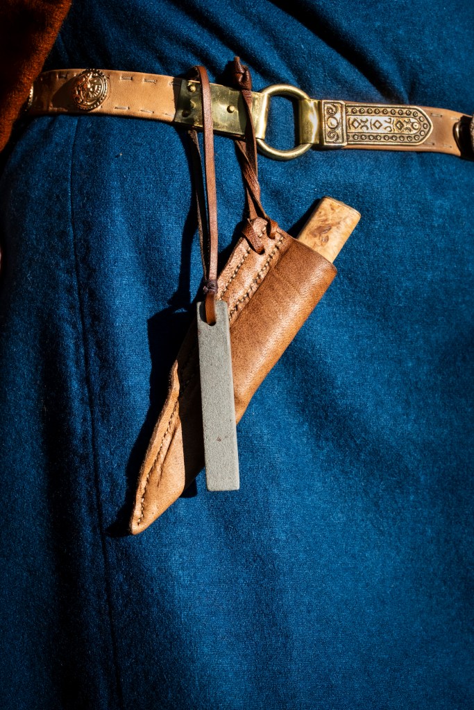 If you have a knife, you also need a whetstone to keep your edges sharp. In grave A11 there was a very well-used whetstone, about 6 cm long. When I looked closer at it in the Historical Museum’s collection, my interpretation was that it had broken and had originally been longer. Whetstones are a common archaeological find from the Viking Age and are often 7-10 cm long with a drilled hole that makes it possible to hang it on your belt. That’s why I chose to buy a whetstone with a drilled hole, 8 cm long in slate.