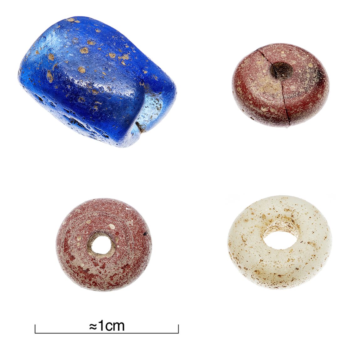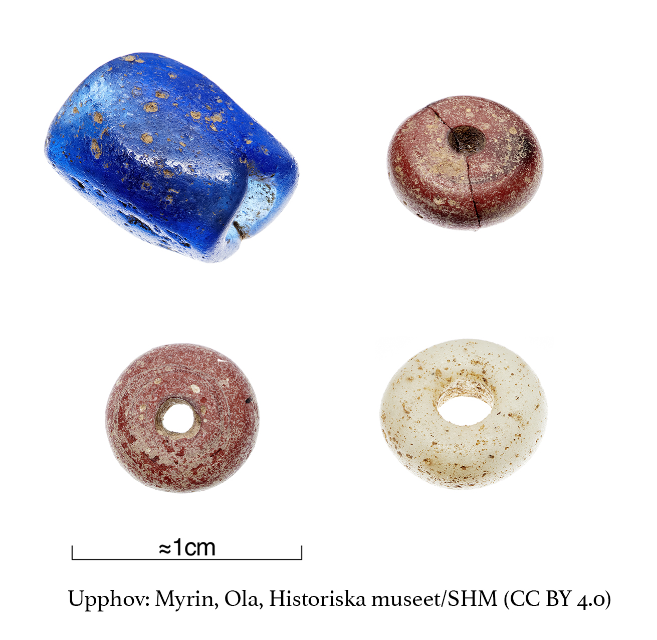 The grave was damaged so it probably contained more grave goods from the beginning but what remained were two red opaque glass beads, a white opaque glass bead and a blue faceted glass bead. She also had a bronze needle case in the same model as found at Birka, among other places.