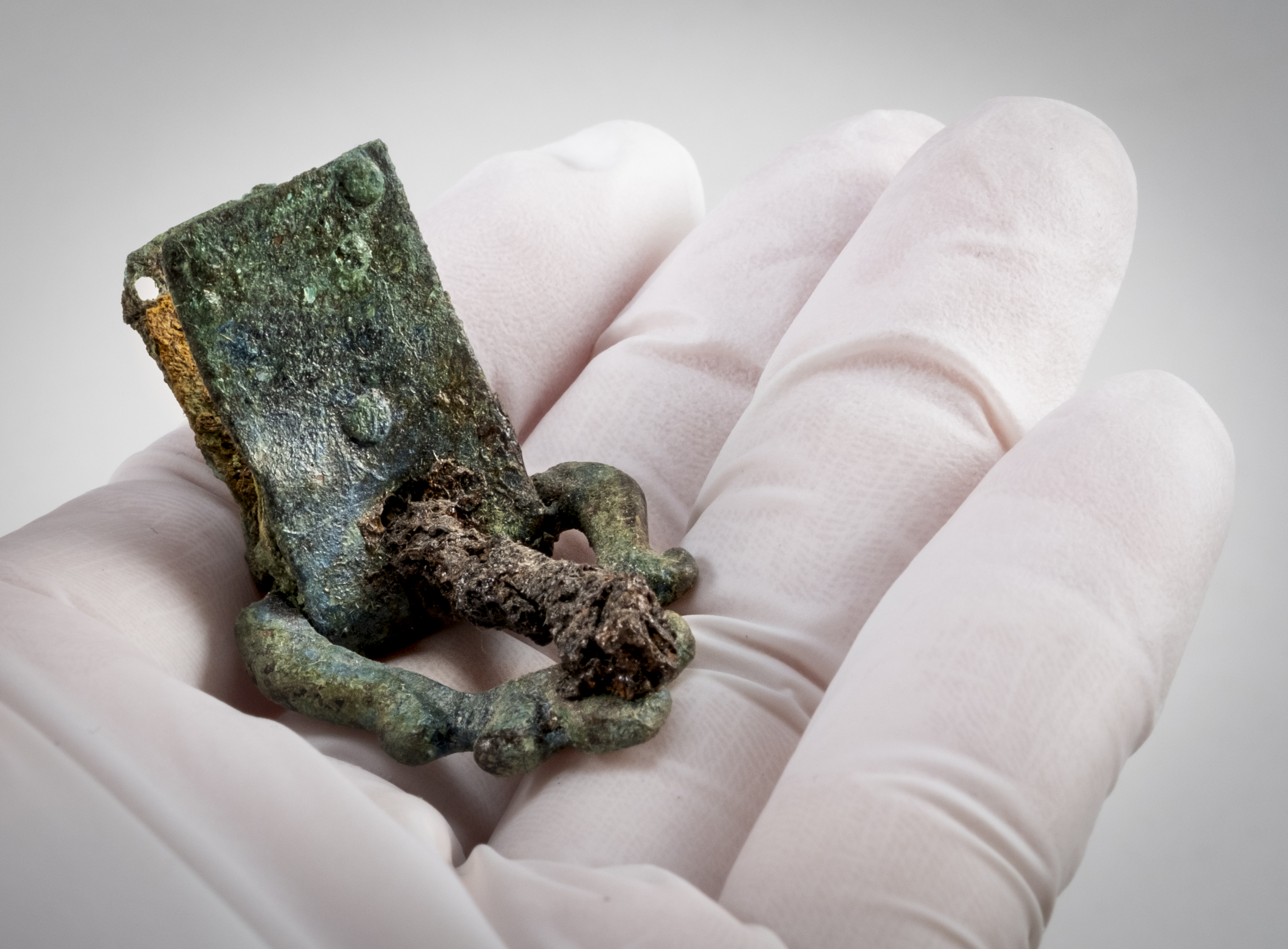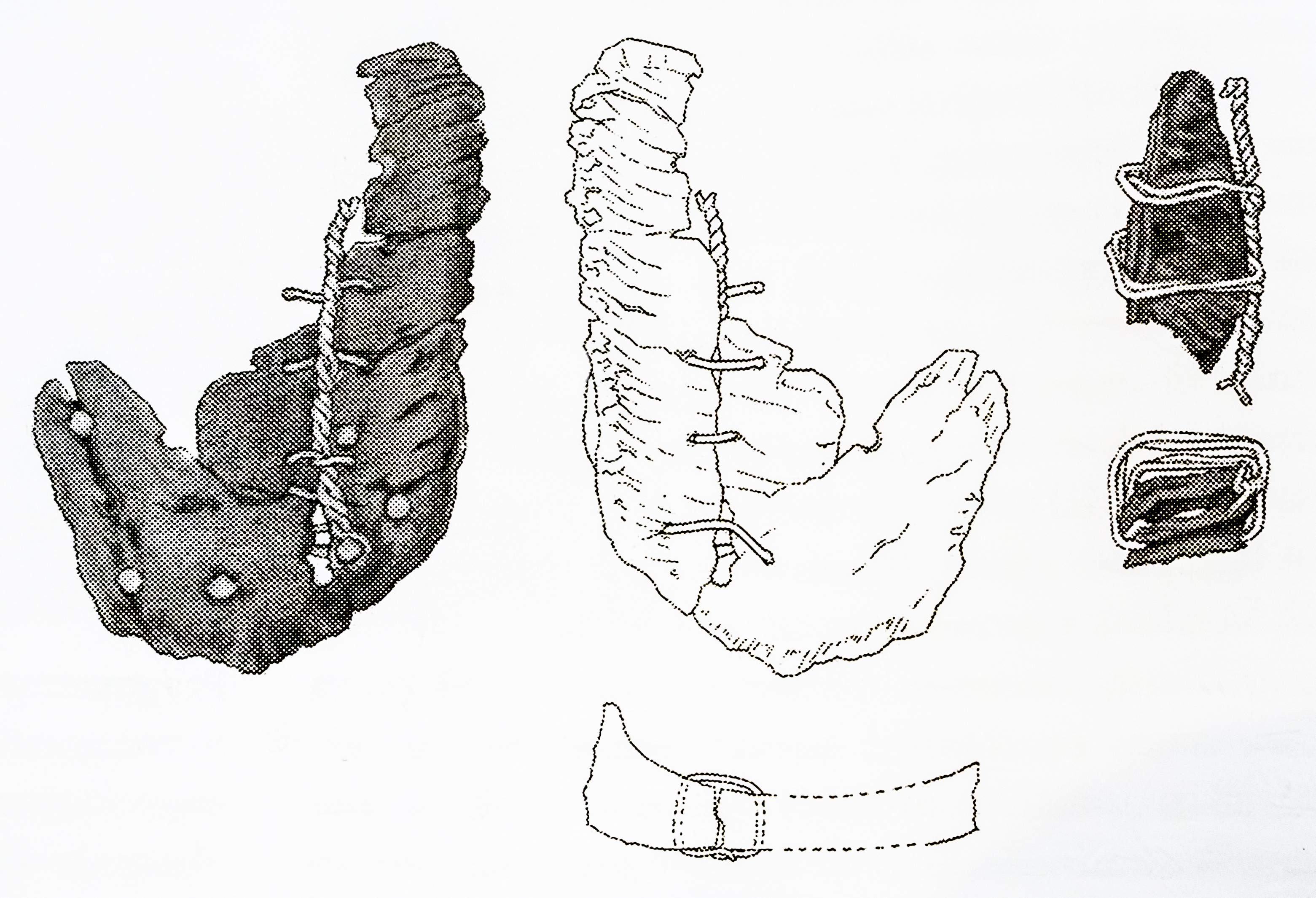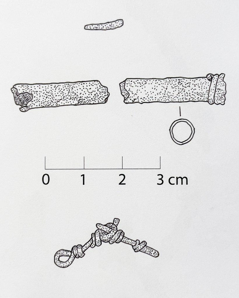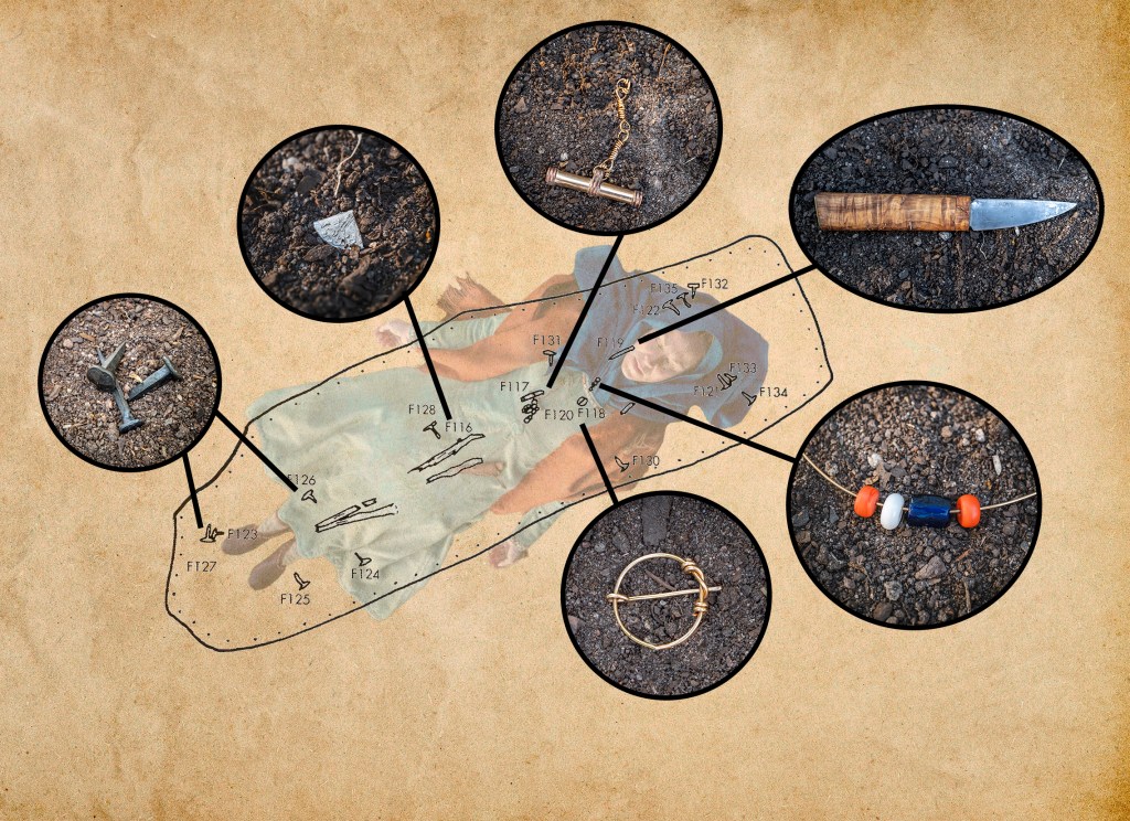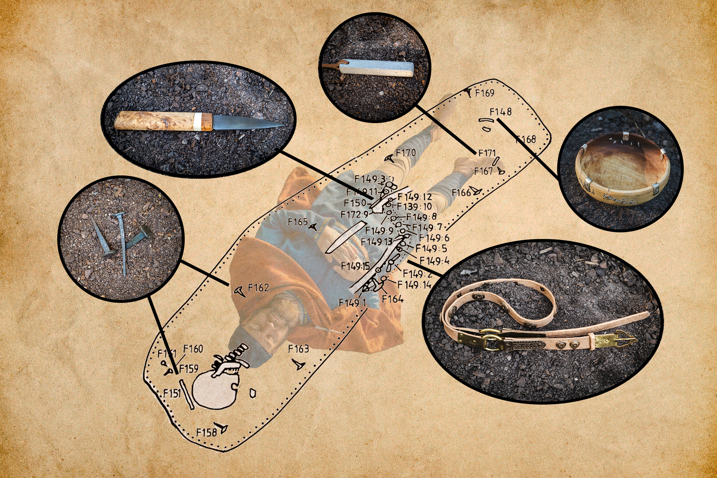 At thigh height lay the belt with bronze fittings. There was also a whetstone, the remains of an iron knife with a wooden handle and fragments of a possible sweepbox/wooden bowl with twisted silver wire.