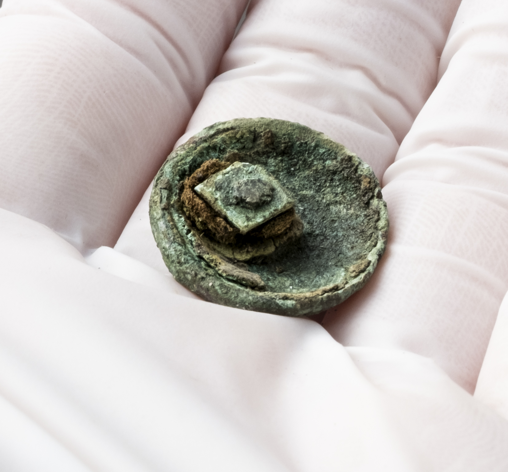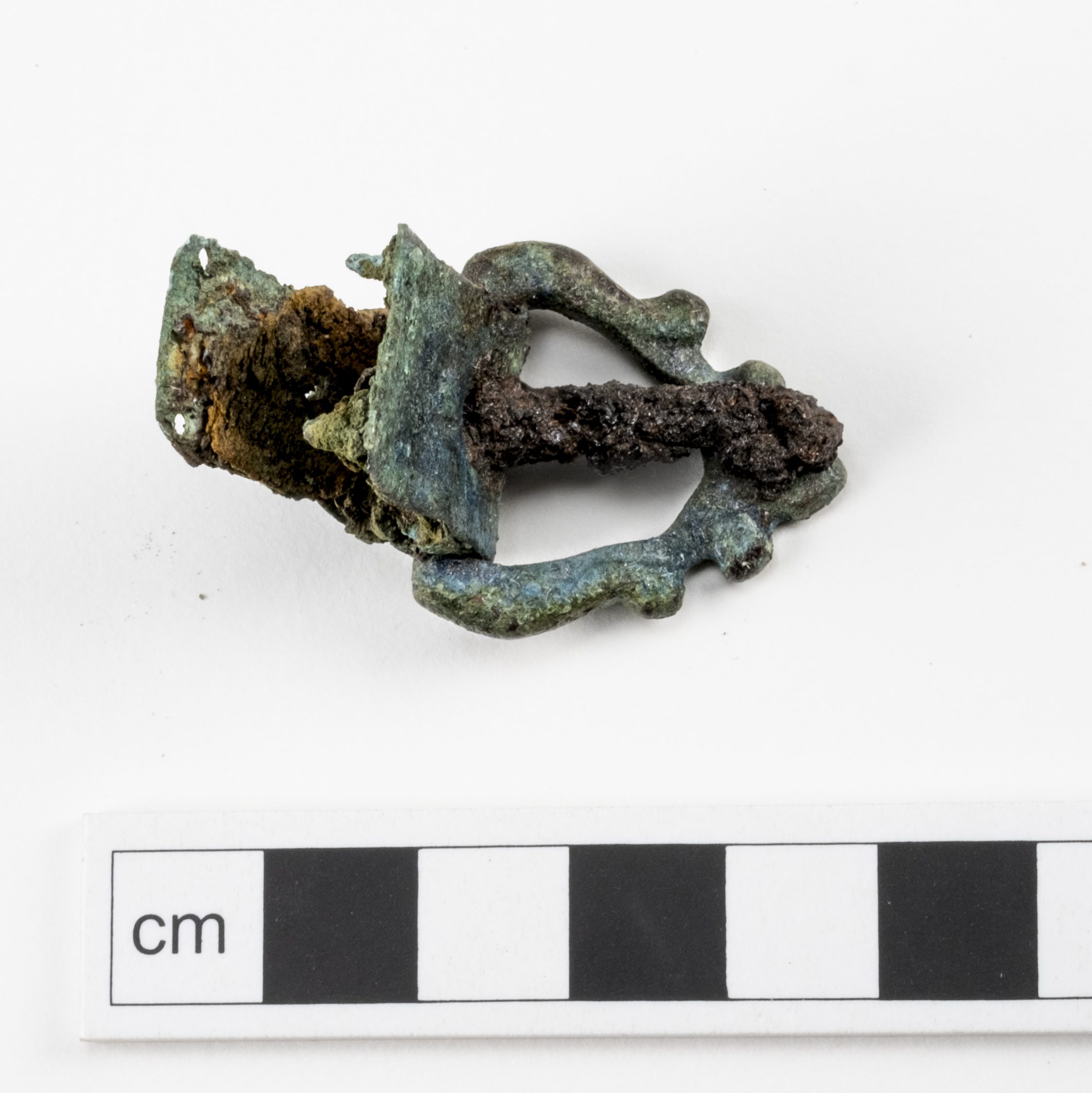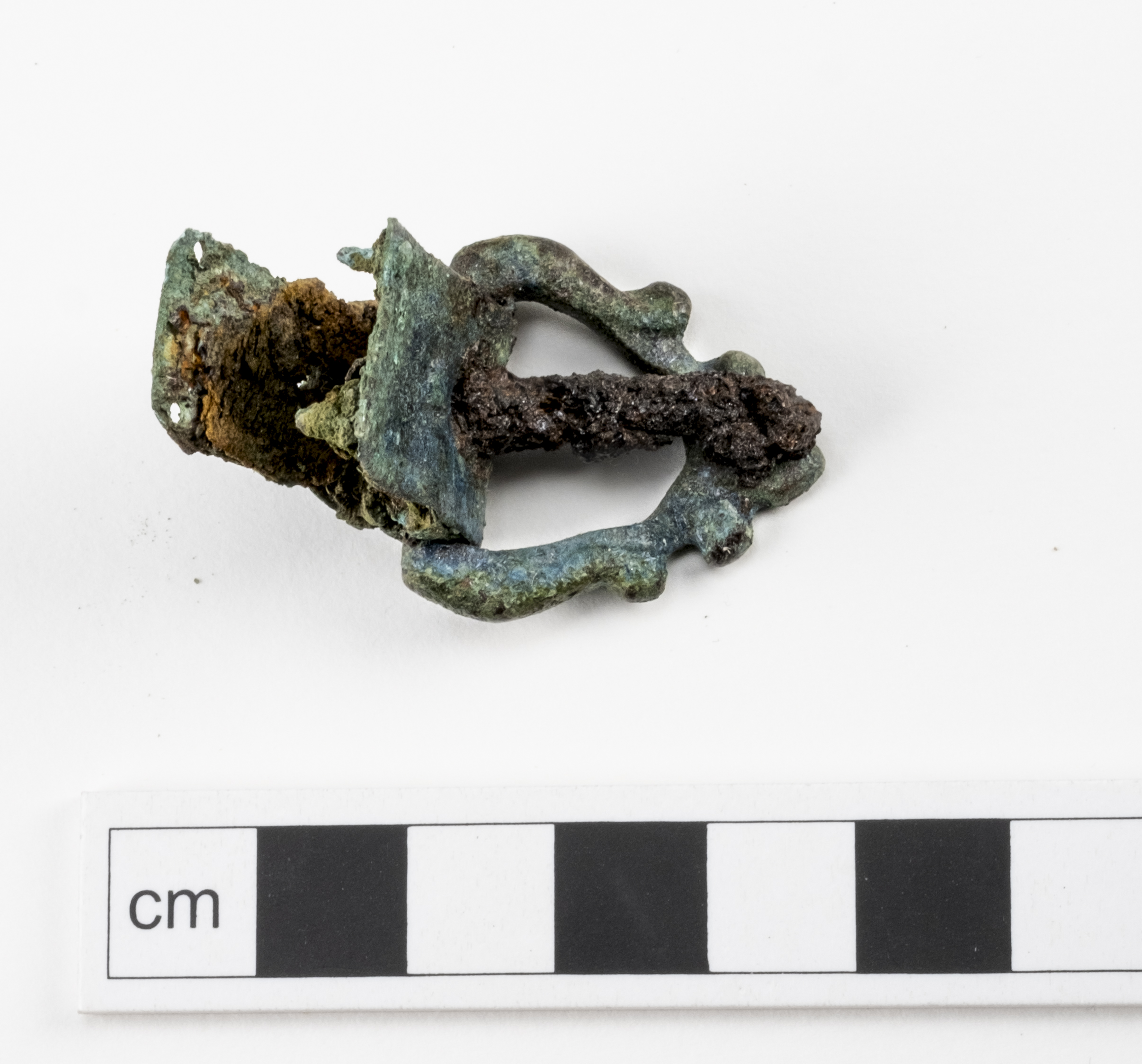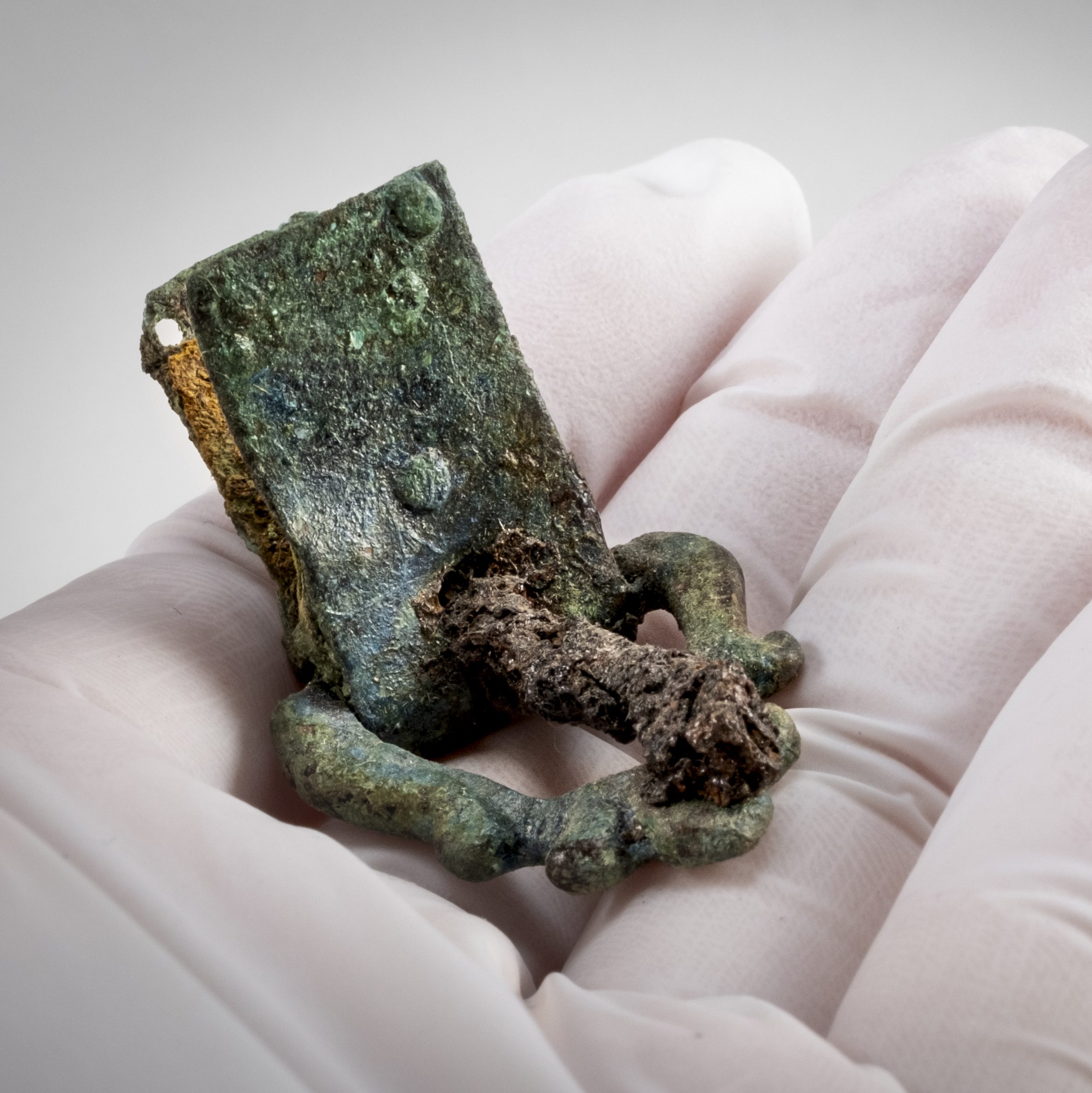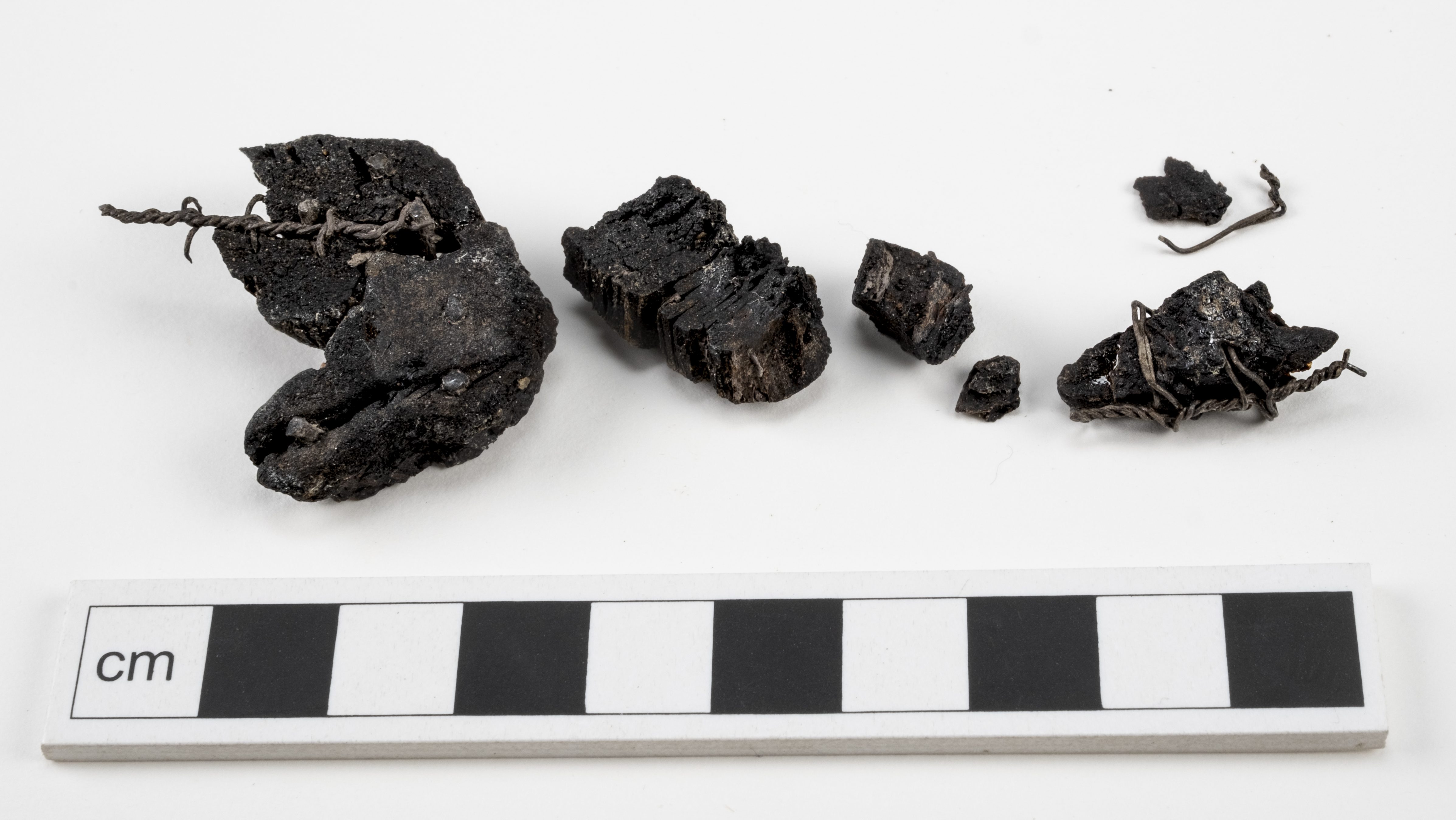 At thigh height lay the belt with bronze fittings. There was also a whetstone, the remains of an iron knife with a wooden handle and fragments of a possible sweepbox/wooden bowl with twisted silver wire.