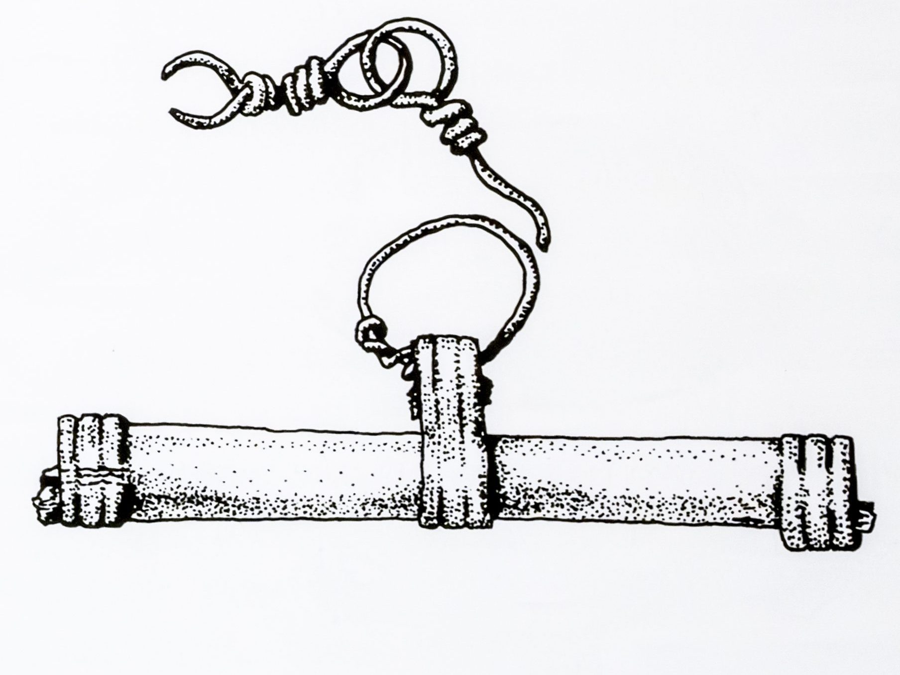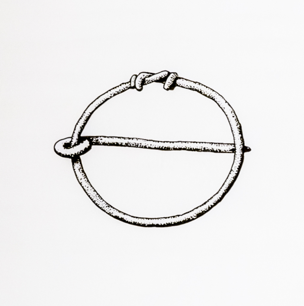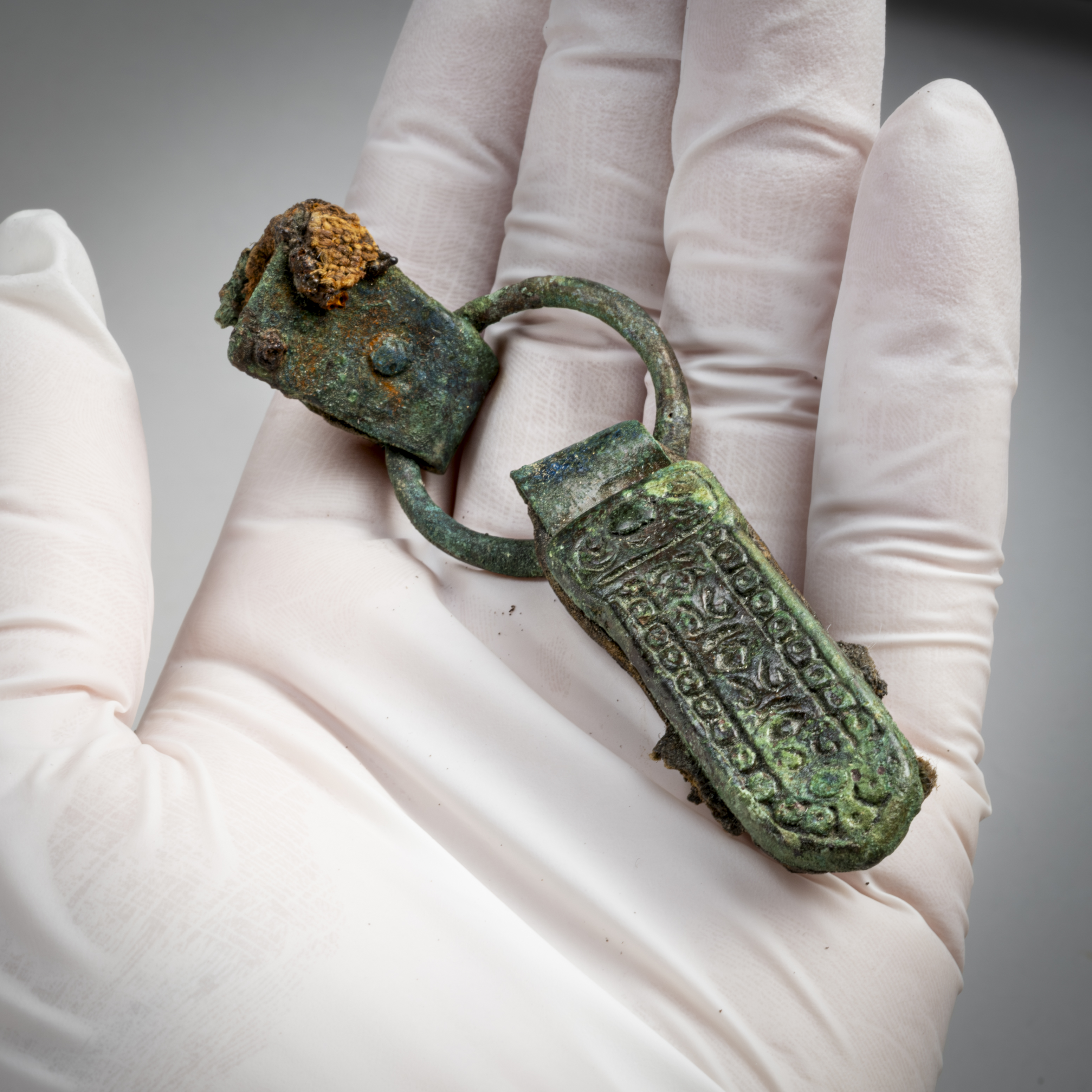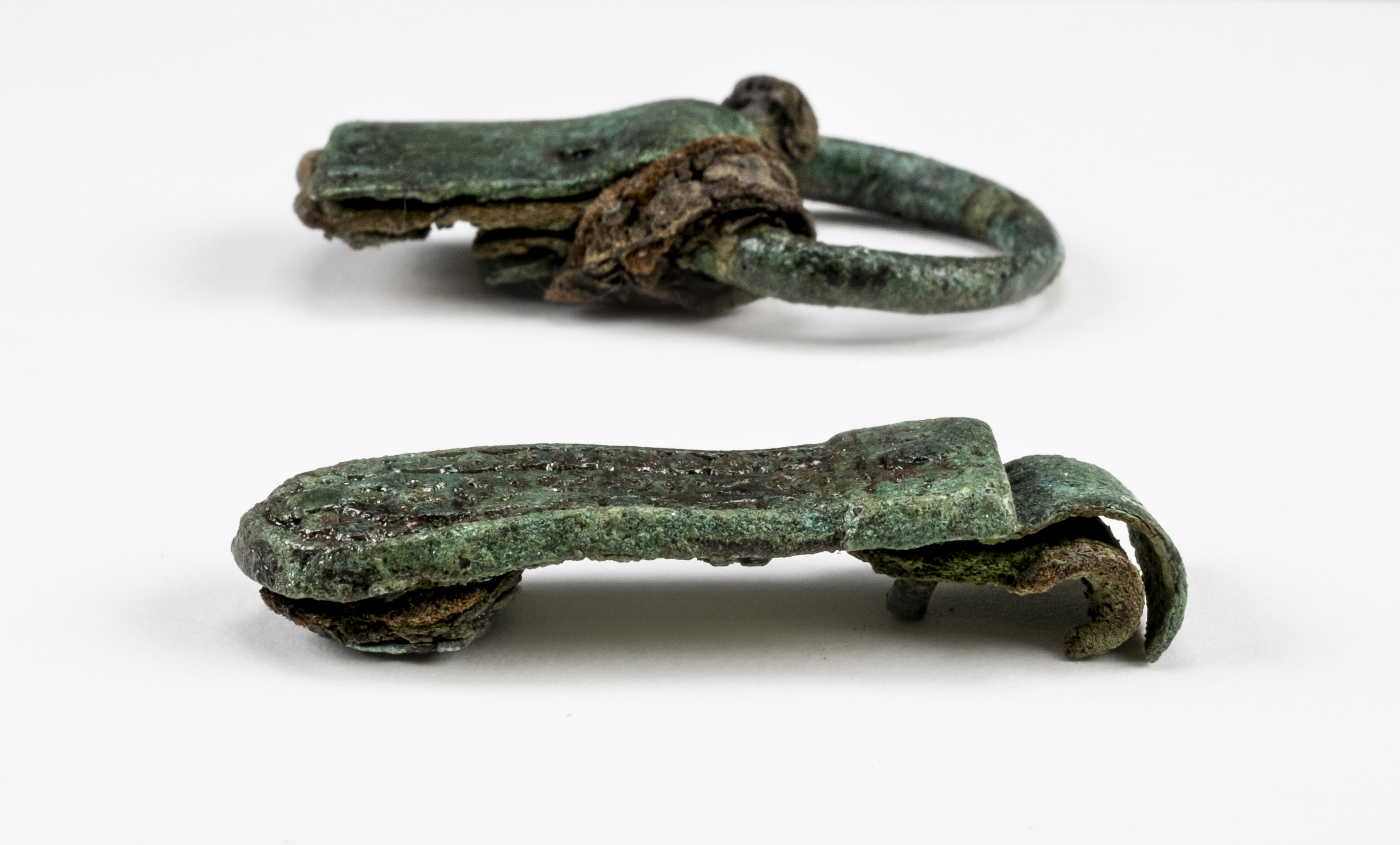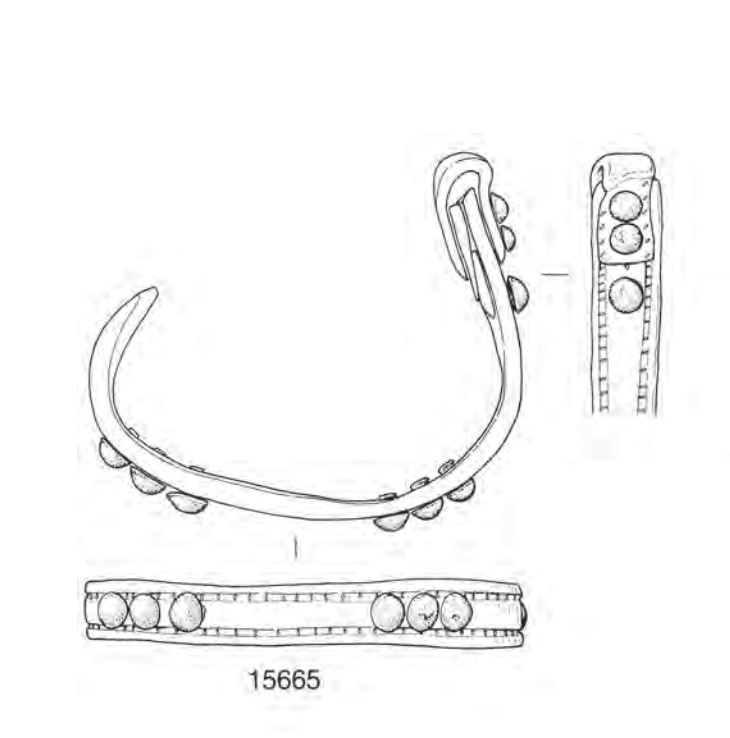 At thigh height lay the belt with bronze fittings. There was also a whetstone, the remains of an iron knife with a wooden handle and fragments of a possible sweepbox/wooden bowl with twisted silver wire.