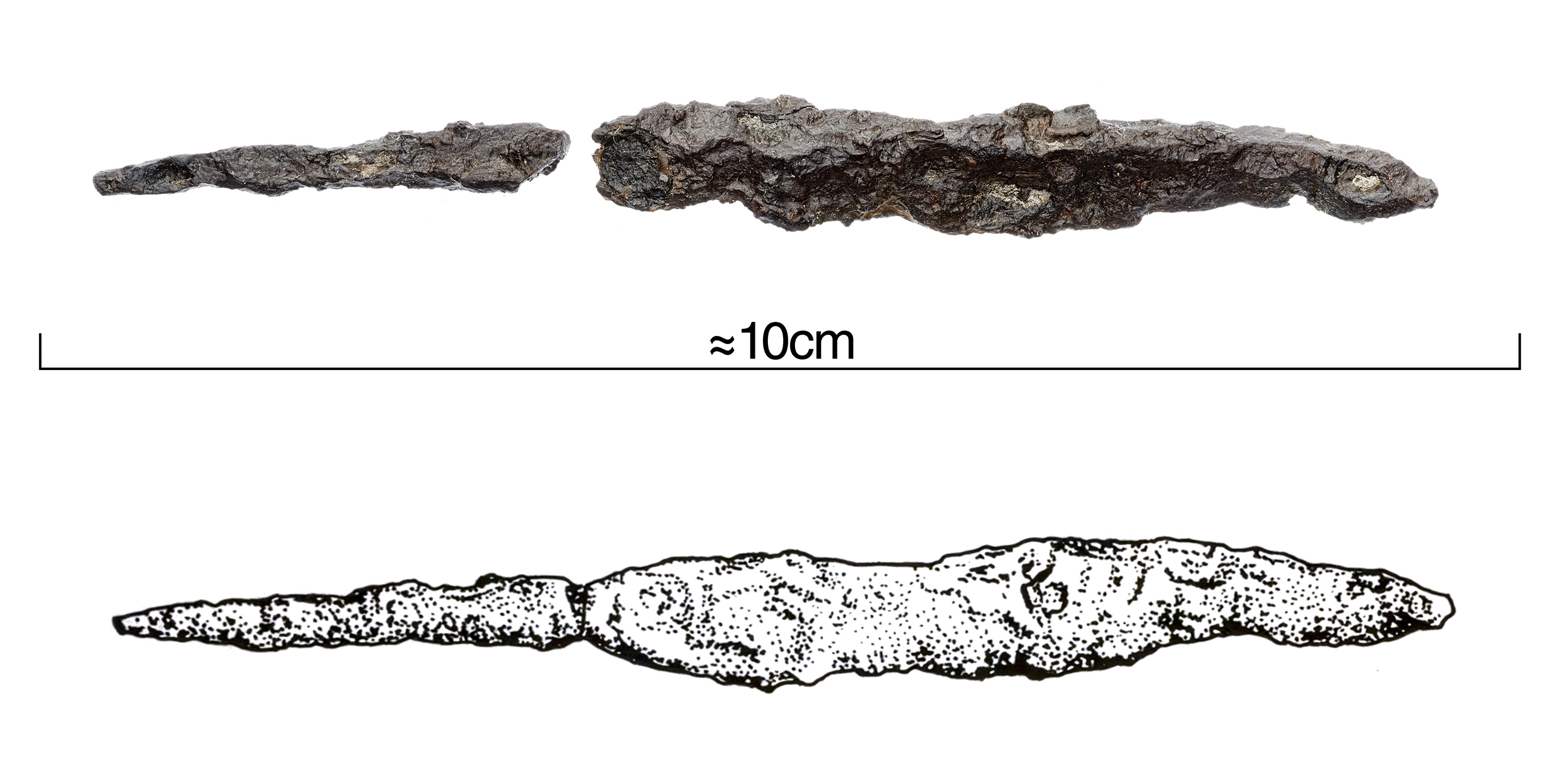 Both grave A11 and A28 contained a knife. Trying to recreate these two knives was both fun and challenging. Both were in poor condition when I looked at them in the Historical Museum’s archives, but the knife in A11 is described and drawn with wooden remains from the handle, and the knife in A28 had most of the tang remaining even though it had broken off. Both knives were around 9-12 cm long.