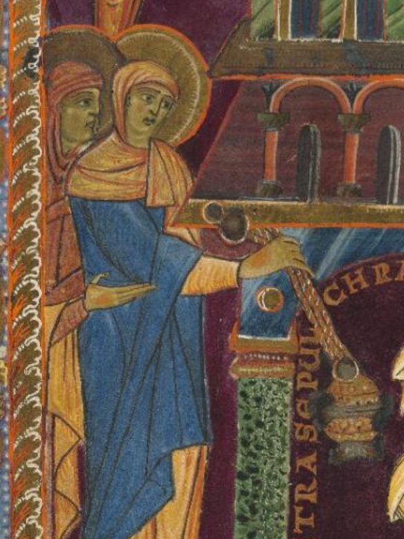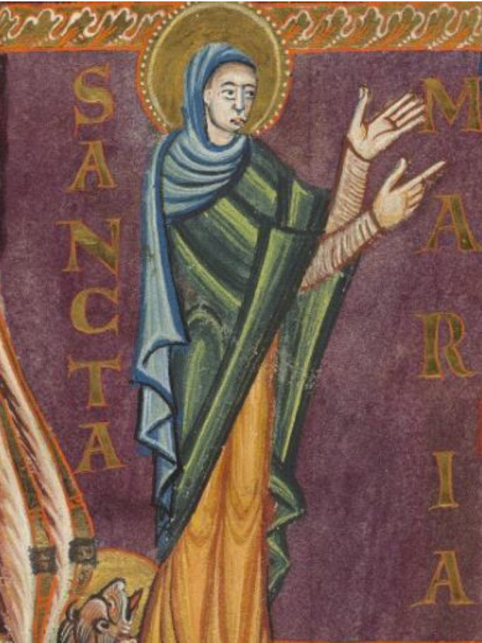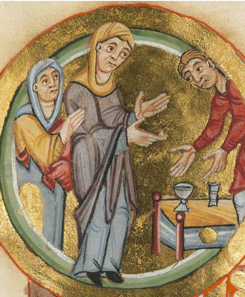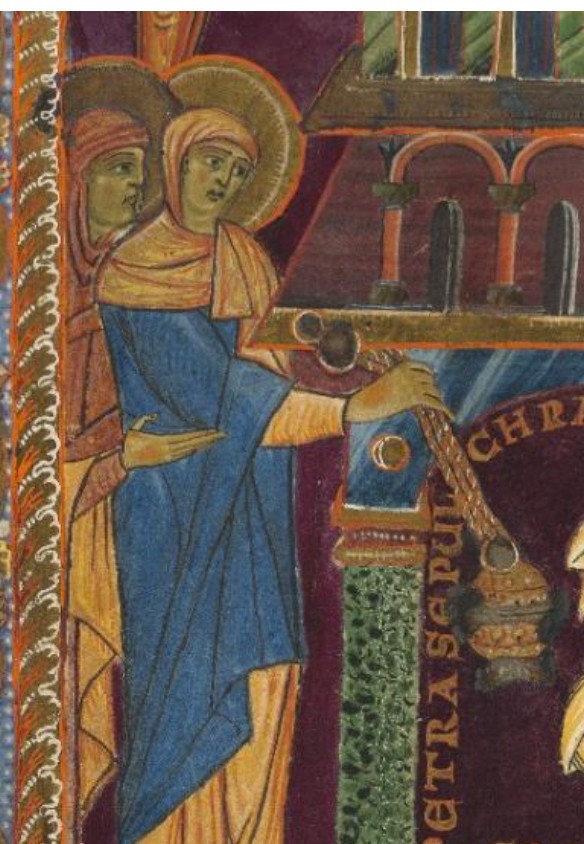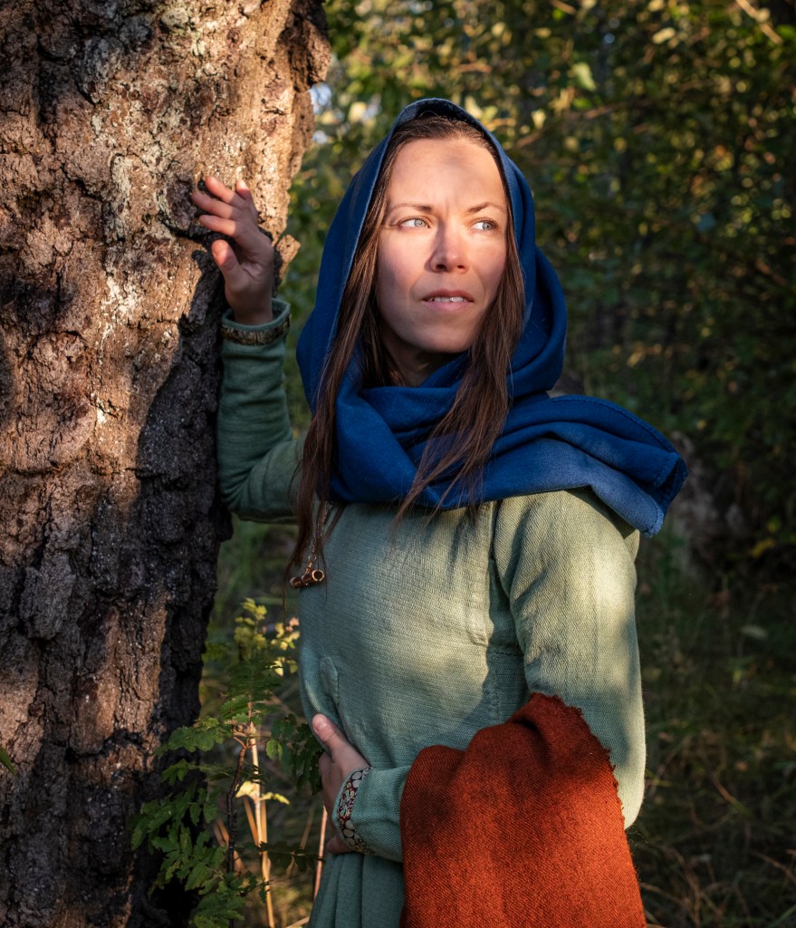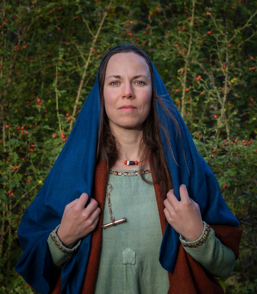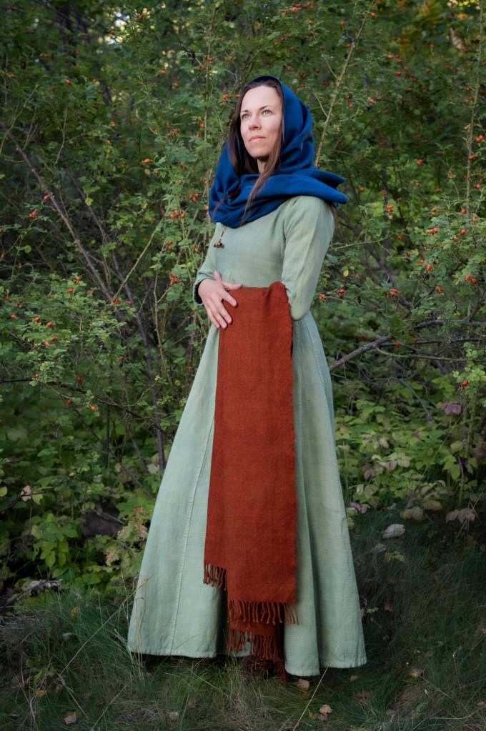 I have also chosen to sew a smaller shawl/veil in a thin natural-colored wool twill that I have dyed blue in a strong dyebath with vejde. You can see in many manuscript images from northern Europe around the 11th century that women have a shawl in bright colors around their heads. These are images in a very Christian context, but since the woman in grave A28 has a Christian skeleton burial and lived in the 11th century, I chose to sew a long rectangular head shawl. After all, this is a time of change between older and new traditions, clothing fashion and religion.
