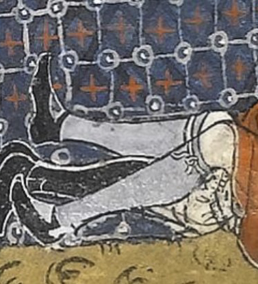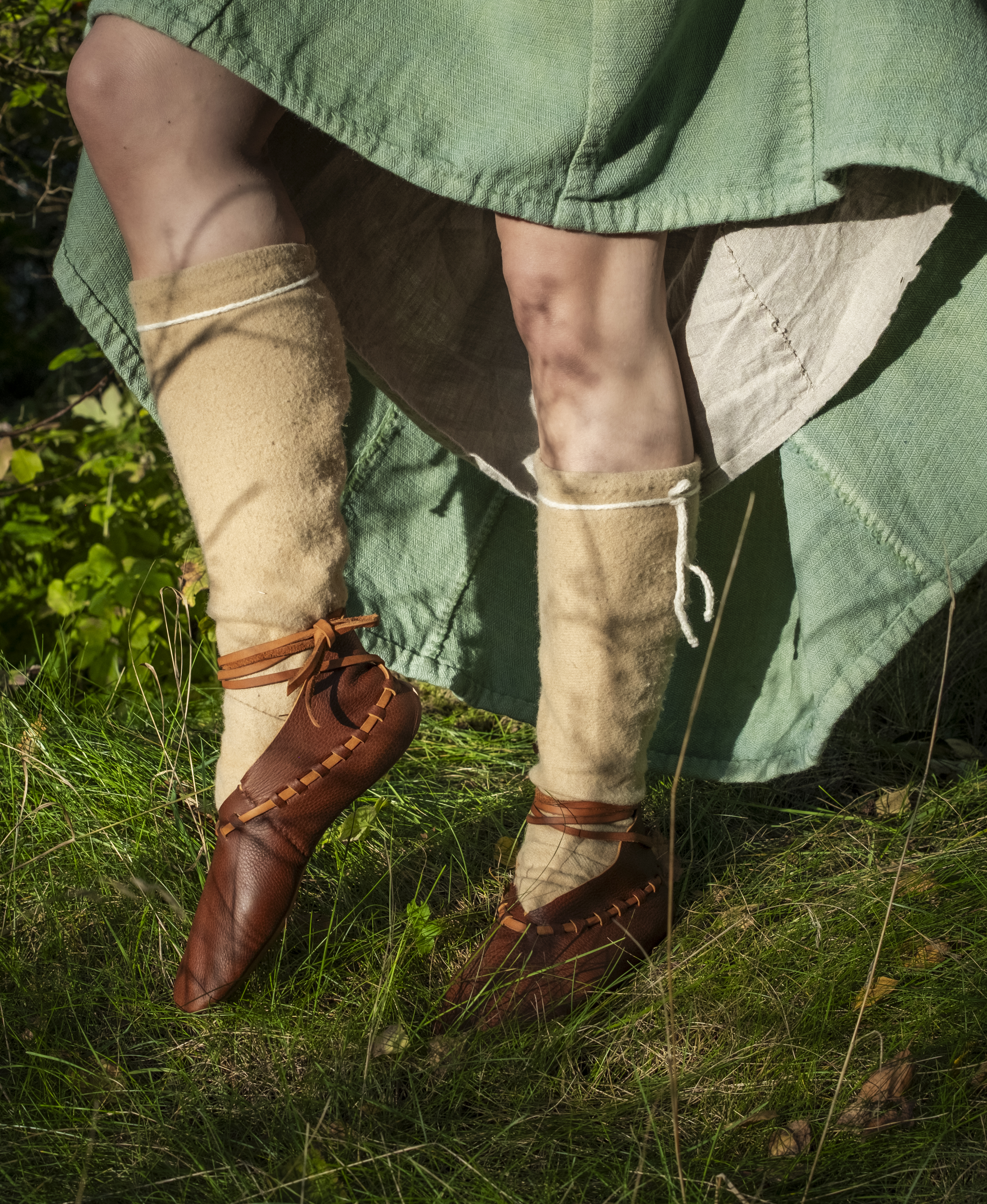 To keep my feet warm, I have chosen to hand-sewn a pair of knee-high hose in undyed, white wool, 2/2 twill. I have then dyed them light brown with walnut leaves because it is a more practical color for hose than white. The sources for Viking Age women’s legwear are largely non-existent, so I have chosen to be inspired by the hose from Thorsberg and Hedeby, as well as looking at many medieval manuscripts from Europe. In other words, I have very little to back up these garments except that they are practical and common among women in the Middle Ages.