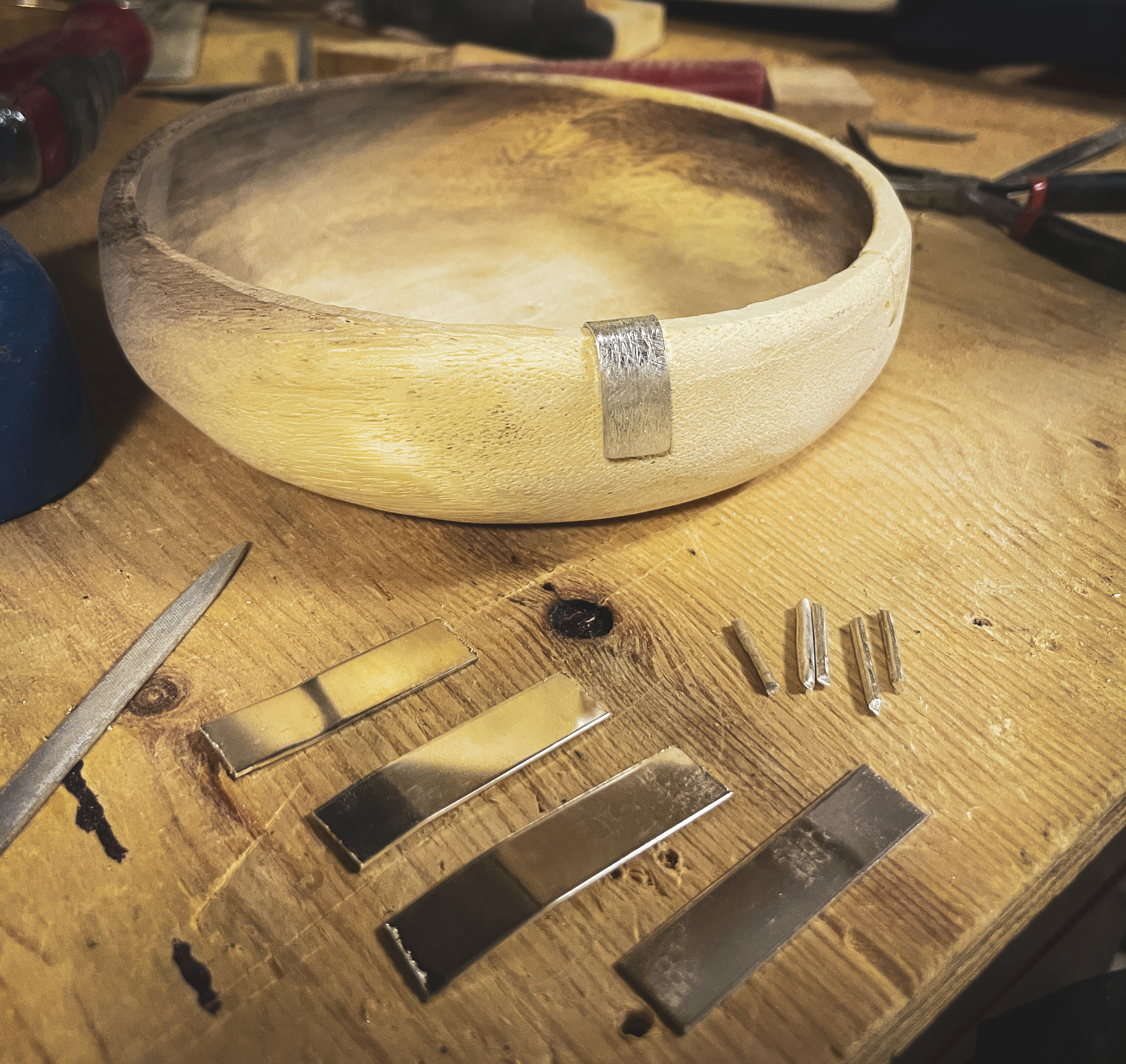 By chance I had a wooden bowl that was cracked and repairing the crack with silver wire worked surprisingly well. When I hammered in my handmade silver rivets to attach the silver fittings, I accidentally cracked the bowl in a new place but then I just had to get more silver wire and repair it the same way again. Experimental archaeology.