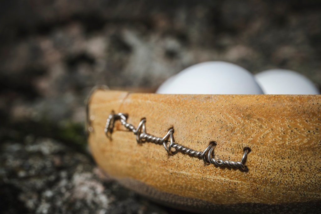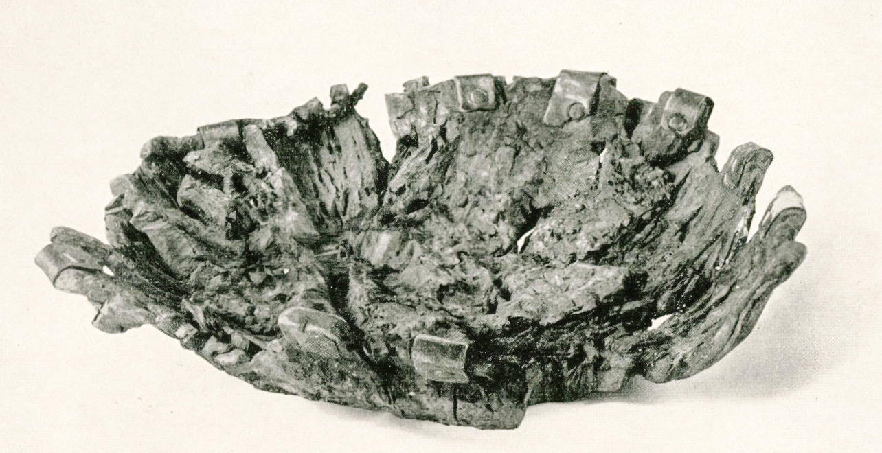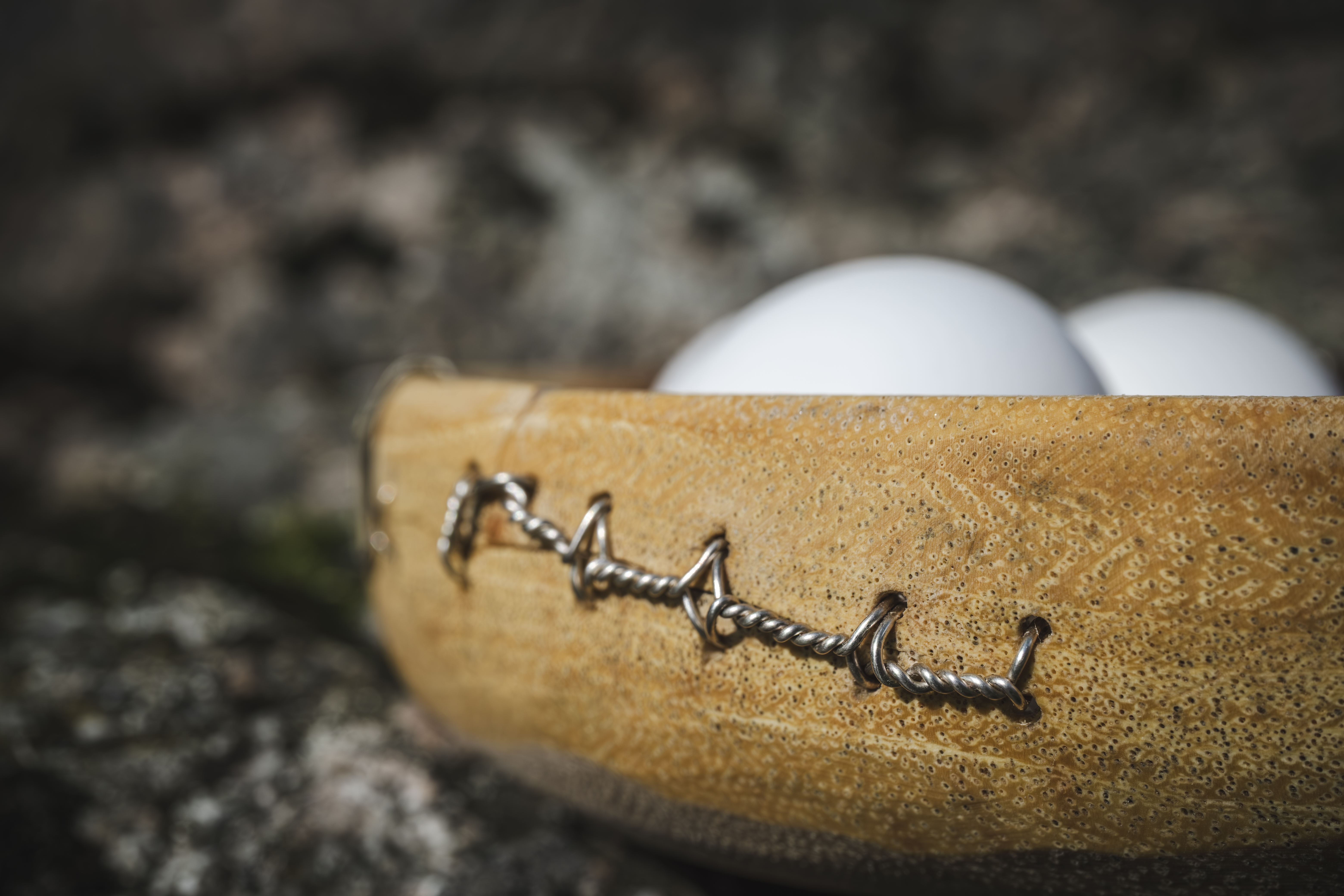 I bought a hand-made bentwood box and cracked the lid to be able to recreate the repaired object. But to learn something, you have to be open to questioning your own interpretations and changing your mind, and I didn’t think the small rounding on one of the wooden fragments was right. Especially not in combination with the silver rivets. So I looked further for other references and found a very good collection article on the Project Forlog website about various European finds of wooden bowls repaired with twisted silver wire and decorated with small silver fittings along the edge. The silver fittings are of course riveted, which could be an explanation for the rivets in the object in grave A11. In addition, the rounding and fiber direction in the wood are better suited to a bowl than to a lid for a bentwood box. However, the report from grave A11 does not mention any remains of silver fittings.