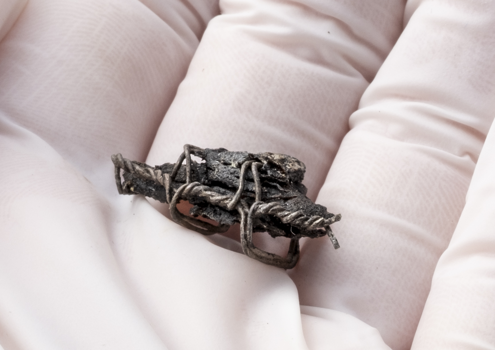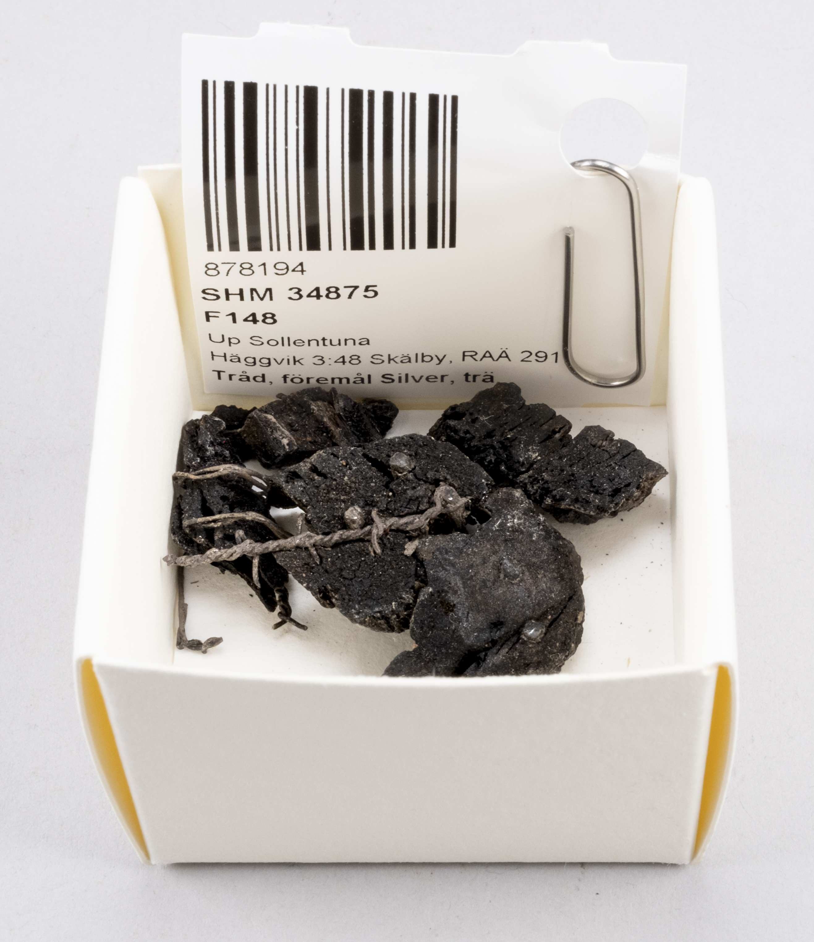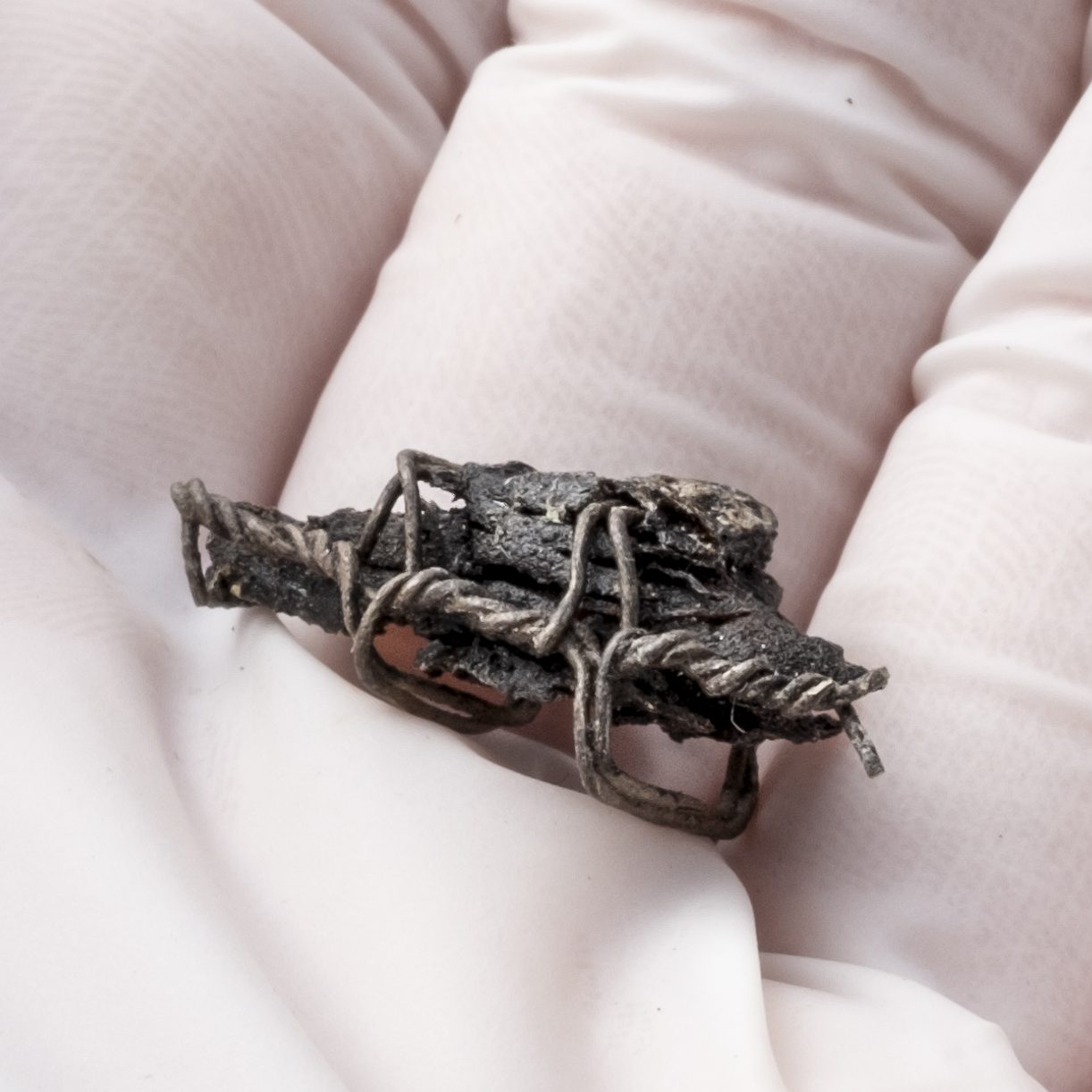 At the foot of grave A11, the archaeologists found something that the report describes as “an unidentified object made of wood and twisted silver wire. From a small box or chest?” It also says that “the heavily decomposed remains of the object were found in an approximately 15 cm round imprint in the soil.” The report also includes a nice drawing of the object. I found this very exciting and made an appointment at the Historical Museum to examine and photograph the original.