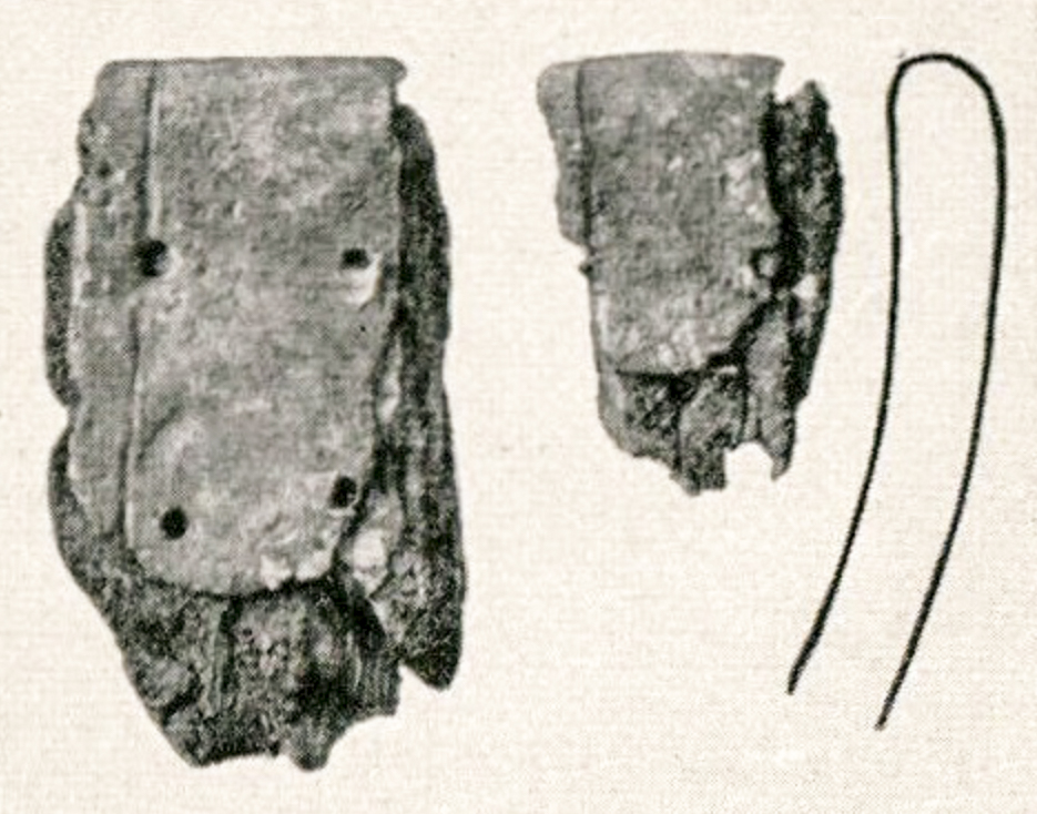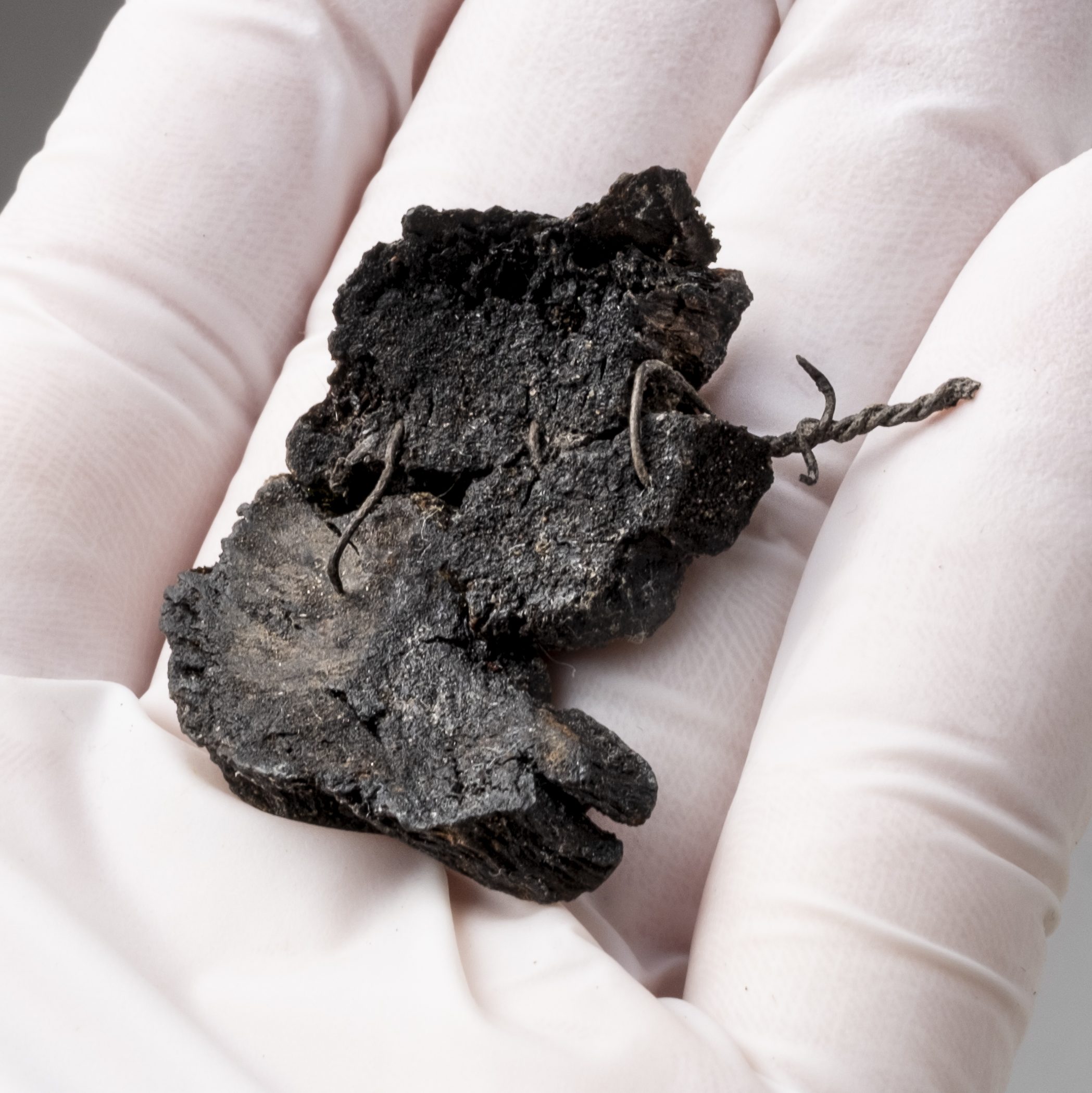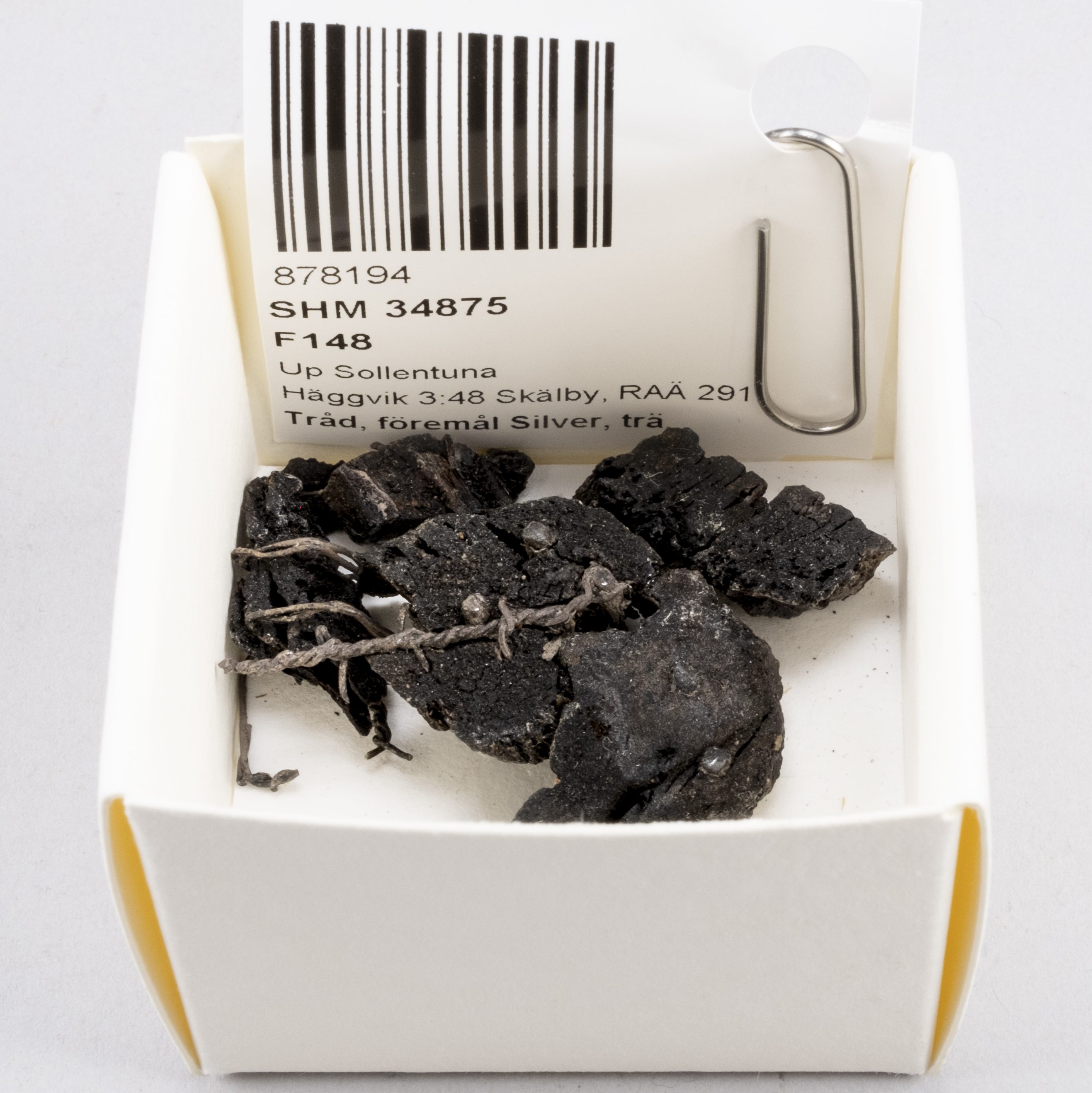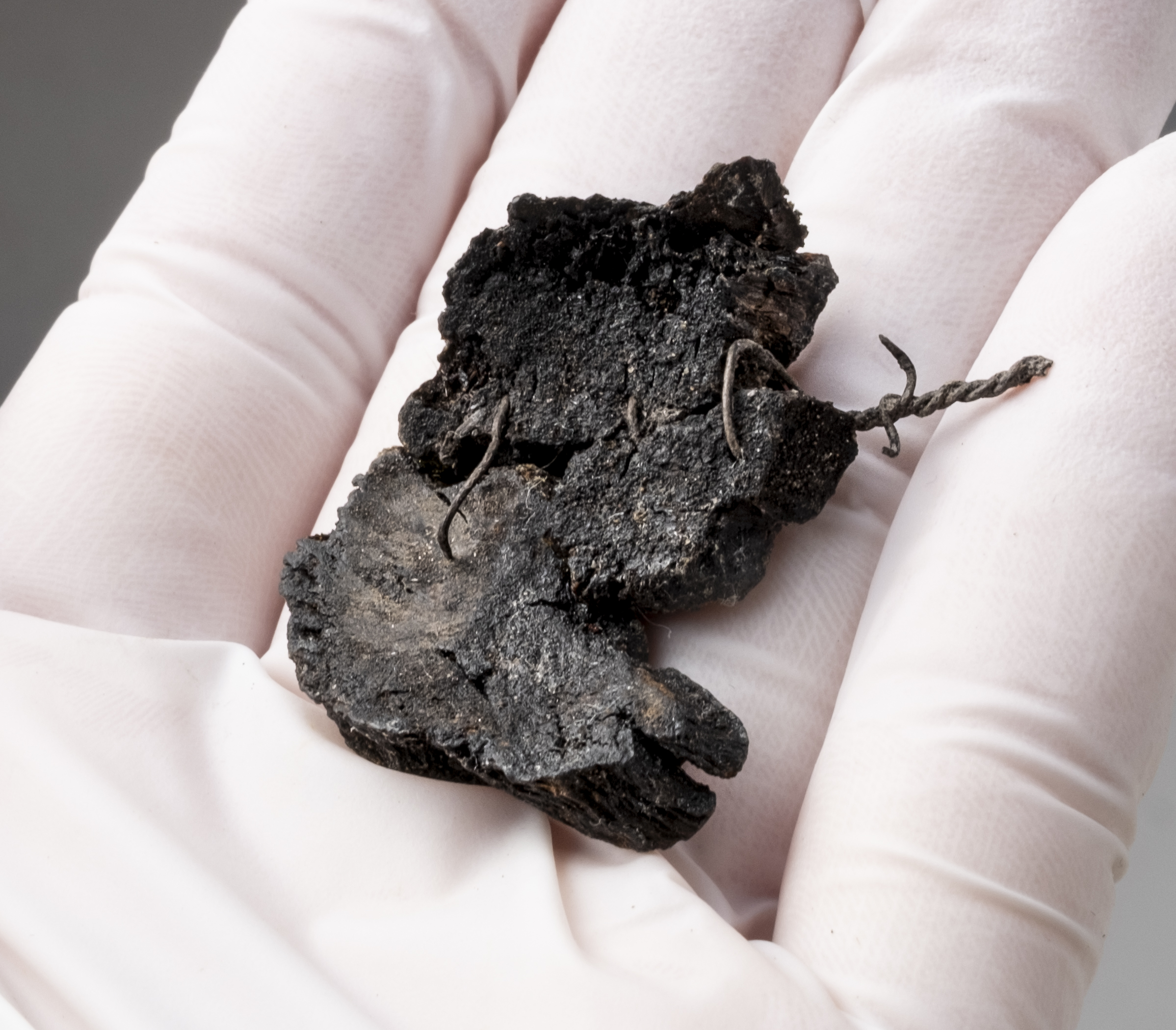 At the foot of grave A11, the archaeologists found something that the report describes as “an unidentified object made of wood and twisted silver wire. From a small box or chest?” It also says that “the heavily decomposed remains of the object were found in an approximately 15 cm round imprint in the soil.” The report also includes a nice drawing of the object. I found this very exciting and made an appointment at the Historical Museum to examine and photograph the original.