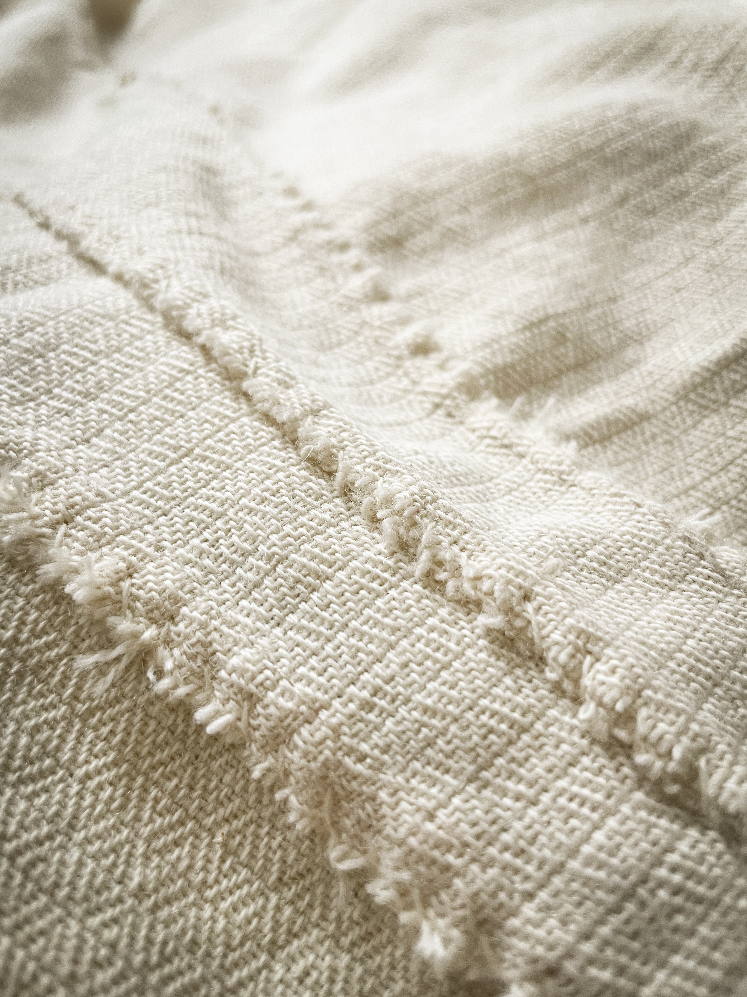 I have chosen to have the shawl finished on both sides with fringes that I twisted from the warp threads. Fringes are a practical way of fixating the fabric without hemming the edges and there are both archaeological finds and depictions that indicate shawls with fringes. One example is the very well-preserved wool shawl from Huldremosse in Denmark. However, it is dated to the Roman Iron Age. In Denmark there is also a Viking Age find of a small pendant with a female figure that has been interpreted as having fringes on the shawl. (Mannering 2017, p. 114) There are also several shawl fragments from graves in Finland, dated to the Finnish Late Iron Age (800-1055/1300 AD). These shawls were decorated with spirals of copper alloy that often preserved the shawls’ fringed edges. (Hägg 1971, pp. 141-142).