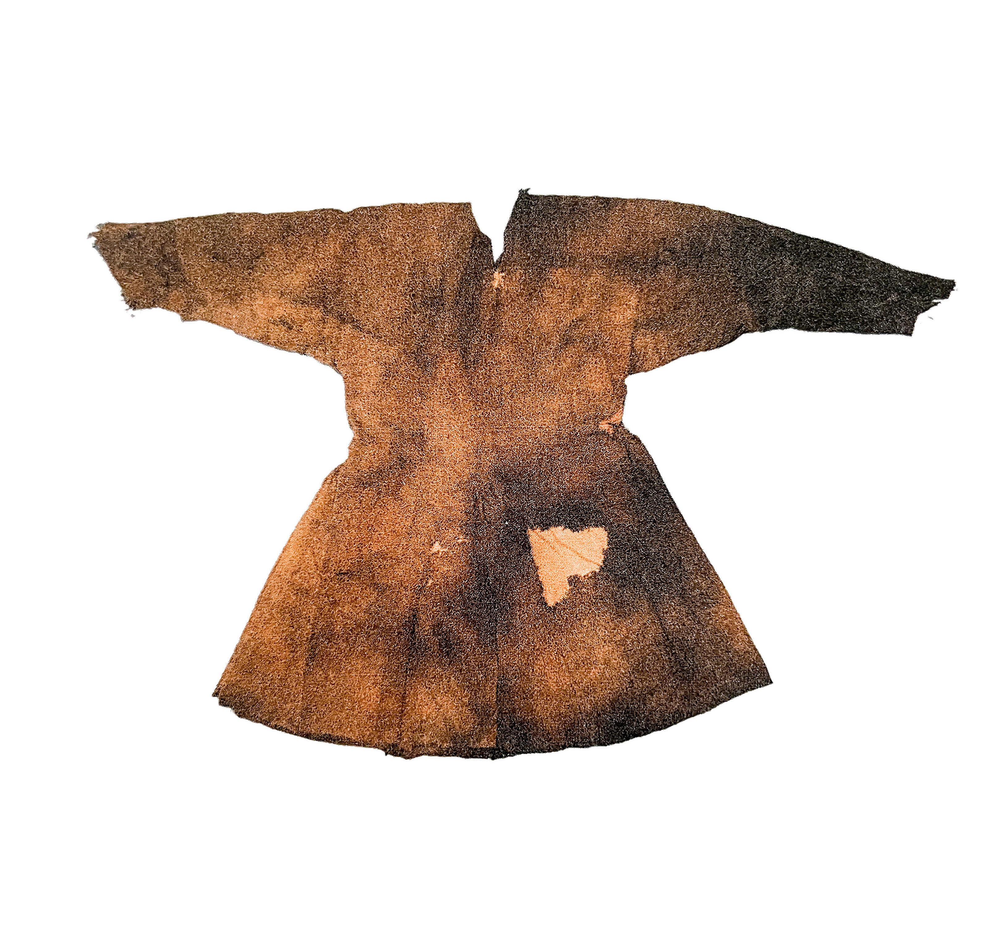 The lack of fabric fragments in grave A11 means that the over tunic is also an interpretation from several different archaeological finds and depictions from Viking Age Scandinavia. Regarding the choice of material, I have assumed that the man comes from the upper class of society and should therefore be buried with a woolen tunic in strong colors and fine quality. So I have chosen to hand-sewn the tunic in a tightly woven plain weave, and then plant-dyed it with indigo. People probably plant-dyed blue with vejde in Scandinavia in the 11th century, but there may have been imported indigo and both plants have the same active ingredient. Finally, I have decorated the tunic with narrow strips of a silk that is a reconstruction of a Byzantine silk from the 10th century. The model is thigh-length and has two gussets in the sides. I base my interpretation on several different finds dated to the beginning of the 11th century, mainly from Denmark.