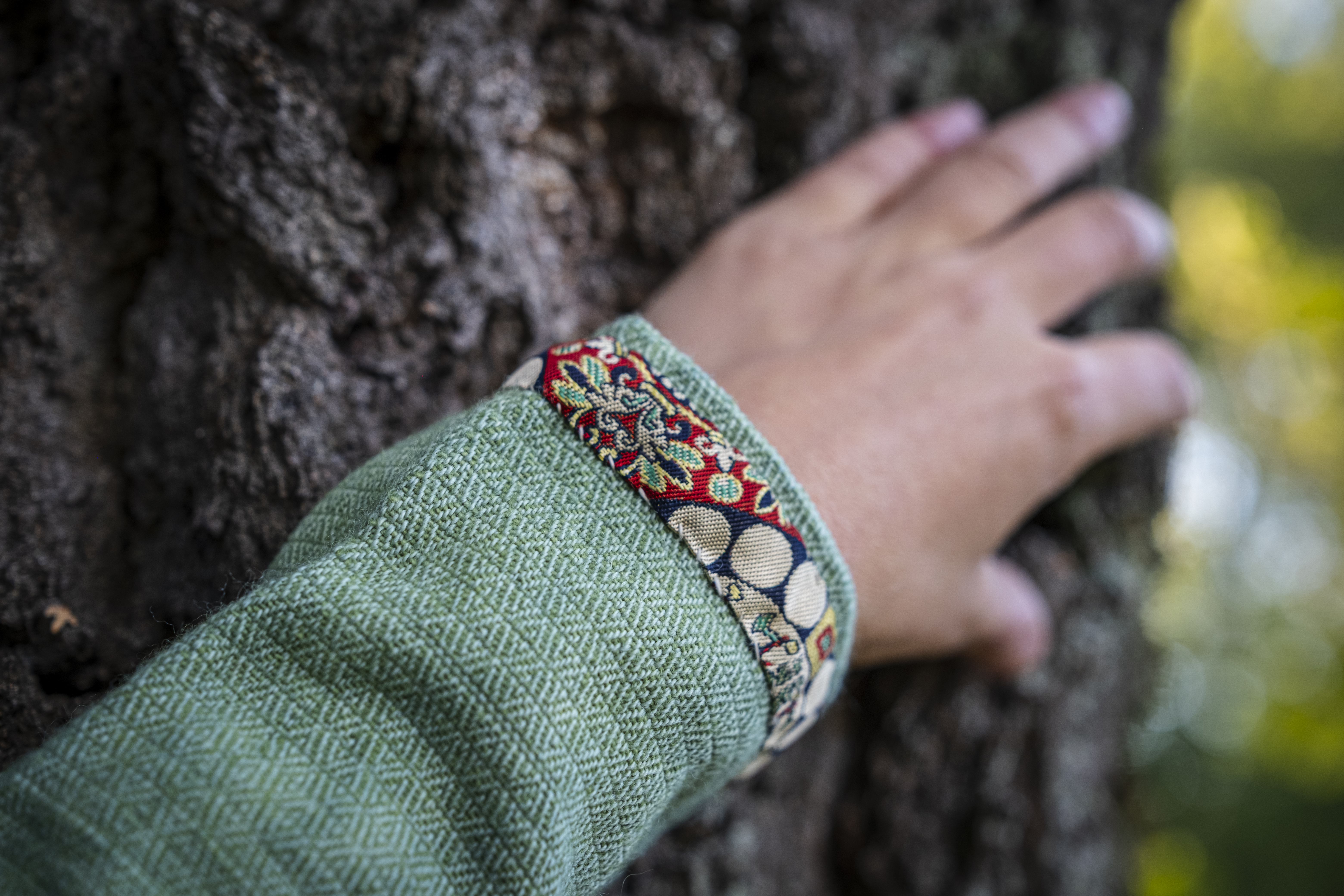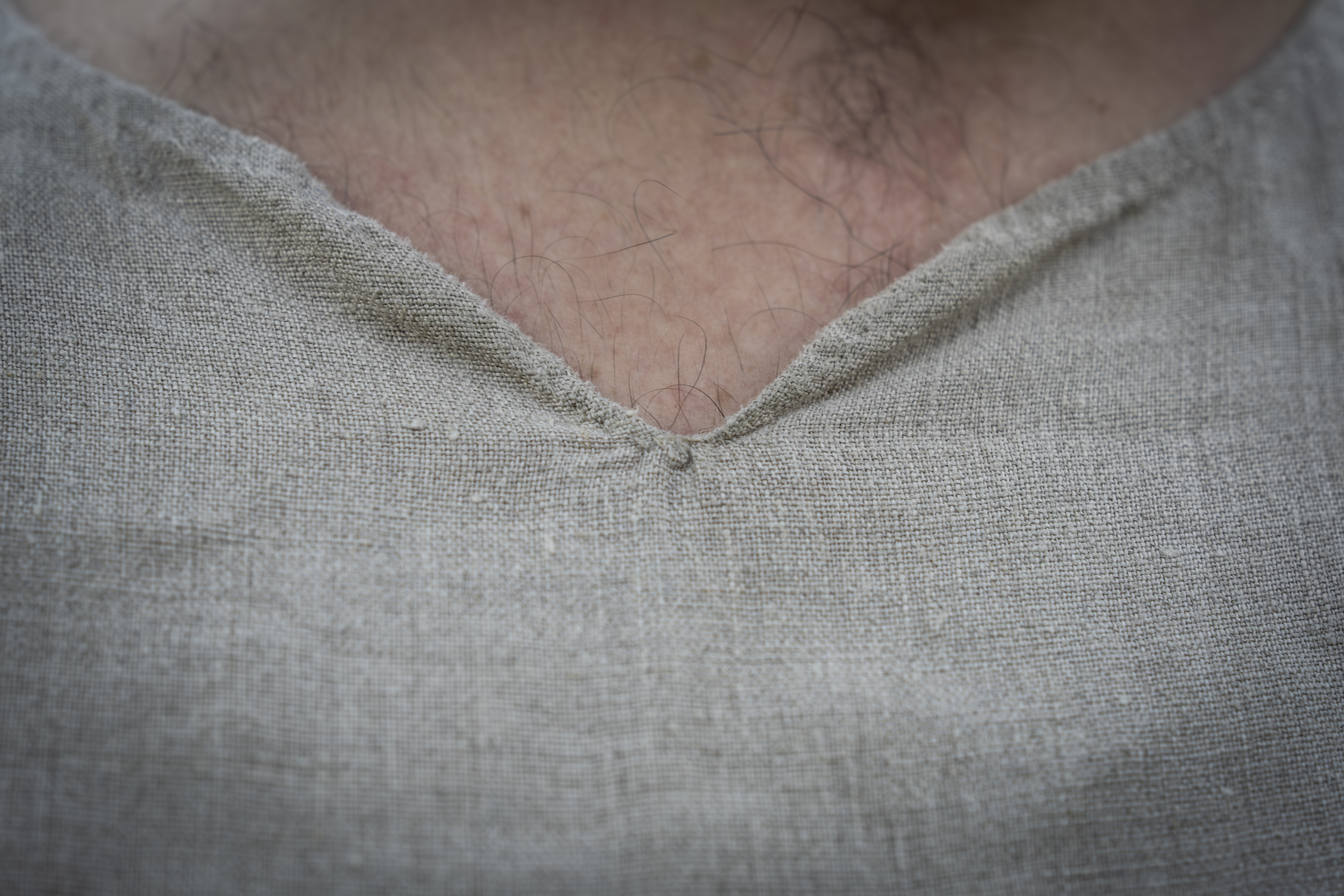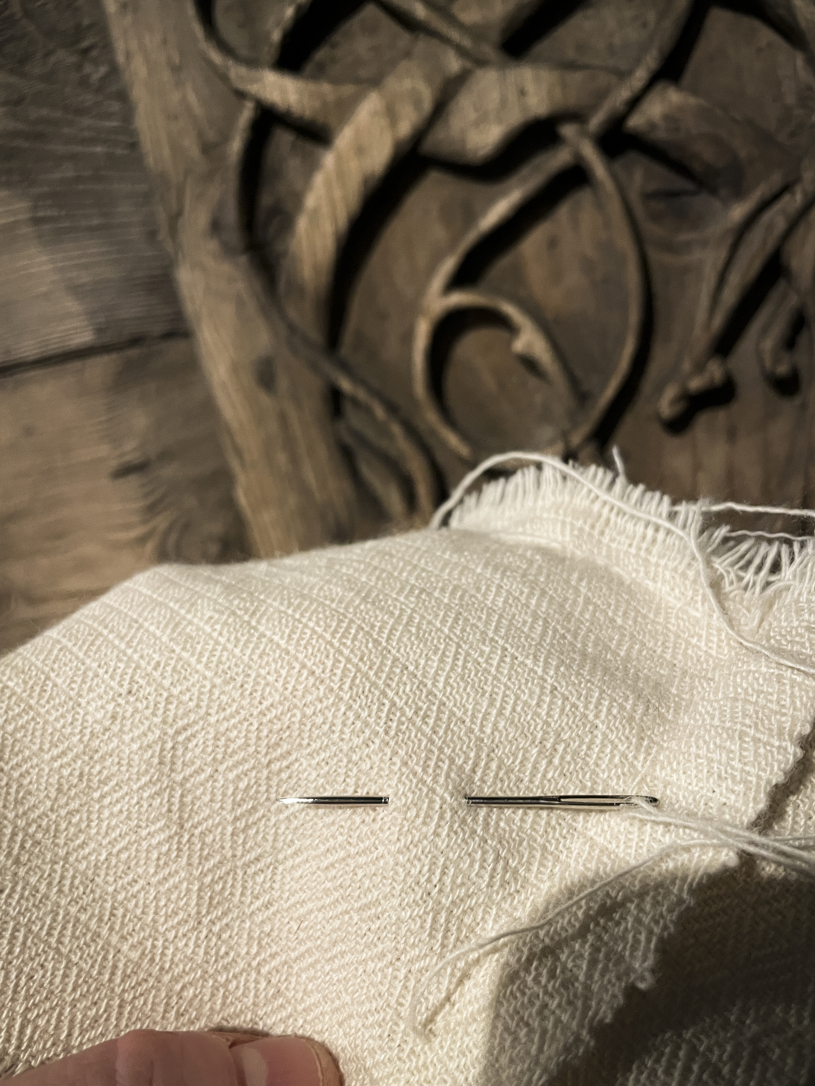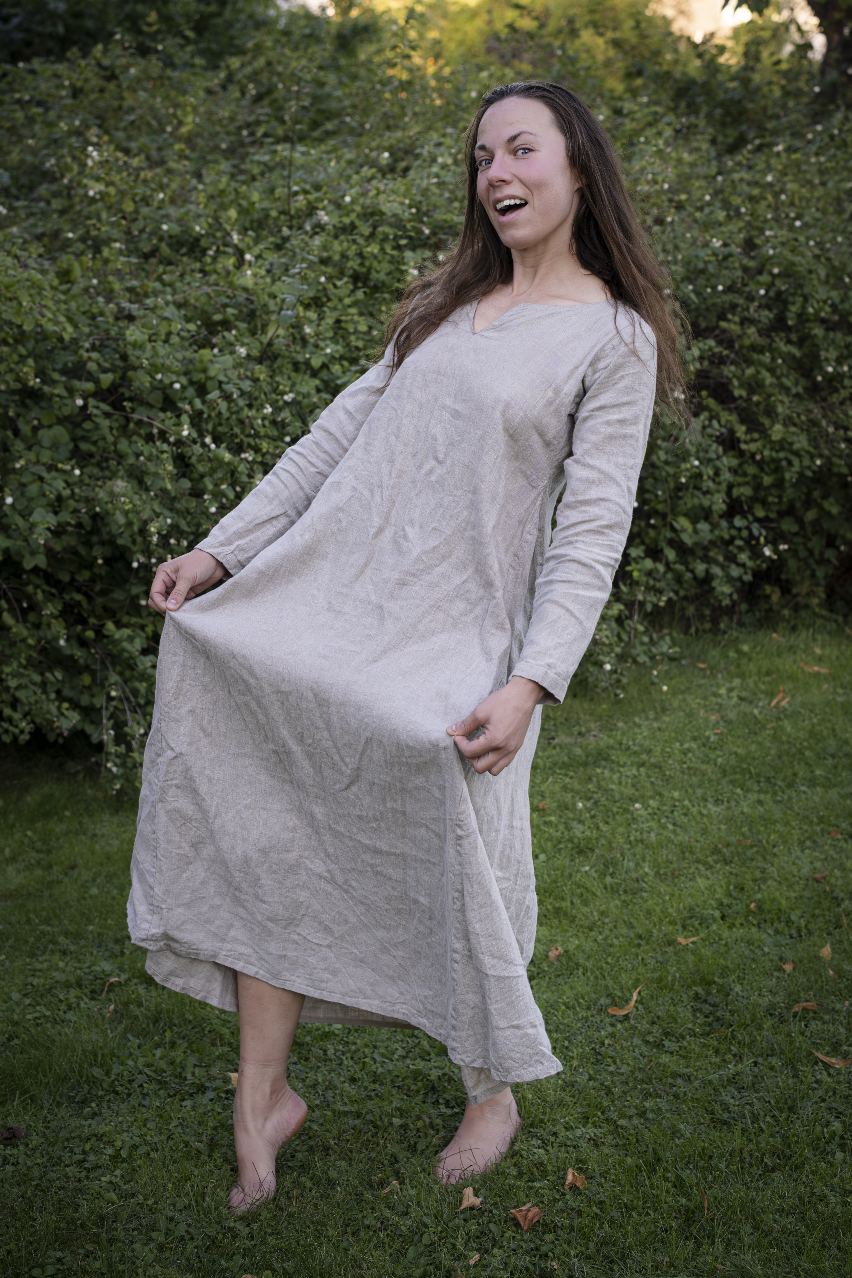 Unfortunately, no textile fragments were found in grave A28 except for the silk threads, but I chose to sew an under tunic in undyed linen based on Inga Hägg’s interpretations of textile fragments in graves at Birka and Hedeby. The under tunic is hand-sewn with waxed linen thread in rectangular pieces with wedges in the sides and a slit at the neck. I chose to sew it calf-length so that the linen does not absorb moisture and dirt from the ground. Having a linen under tunic closest to the body is practical as it is easy to wash. I sewed it wide enough to be used even during pregnancy and breastfeeding.