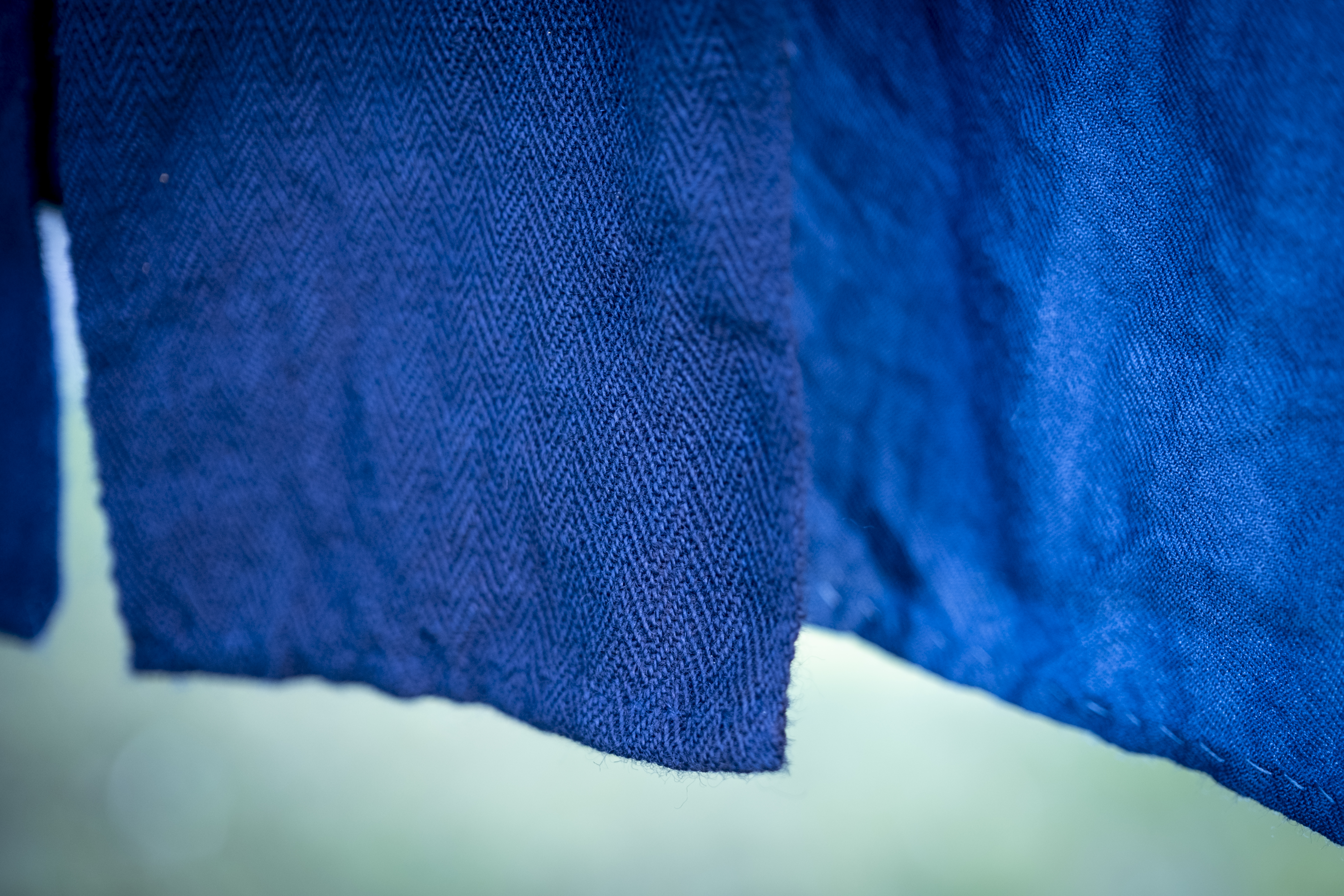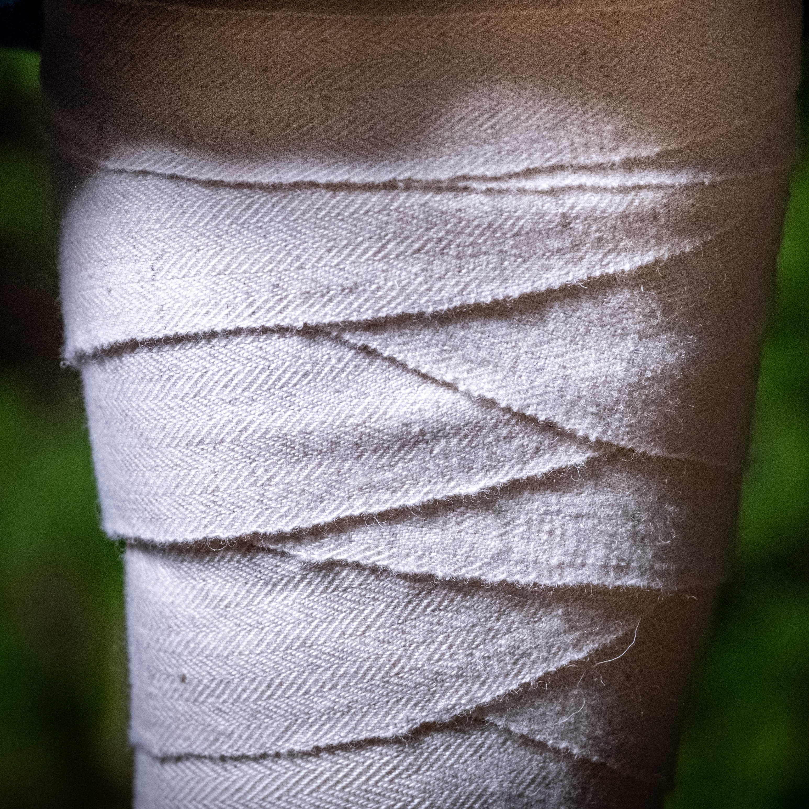 In Hedeby, archaeologists have found about five fabric fragments that have been interpreted as legwraps and Inga Hägg writes in “Textilfunde aus dem Hafen von Haithabu” that all the wool fragments are woven in herringbone twill. They are not sewn but woven as long wraps, about 10 cm wide. The weave is very dense and sturdy, that is, not very stretchy. With the help of Amica Sundström, I wove 8 meters of leg wraps based on the archaeological fragments. The weave is very thread-tight with 24 threads per cm in the warp and the legwraps became 11 cm wide. Then I plantdyed them blue with an extra strong vejde.