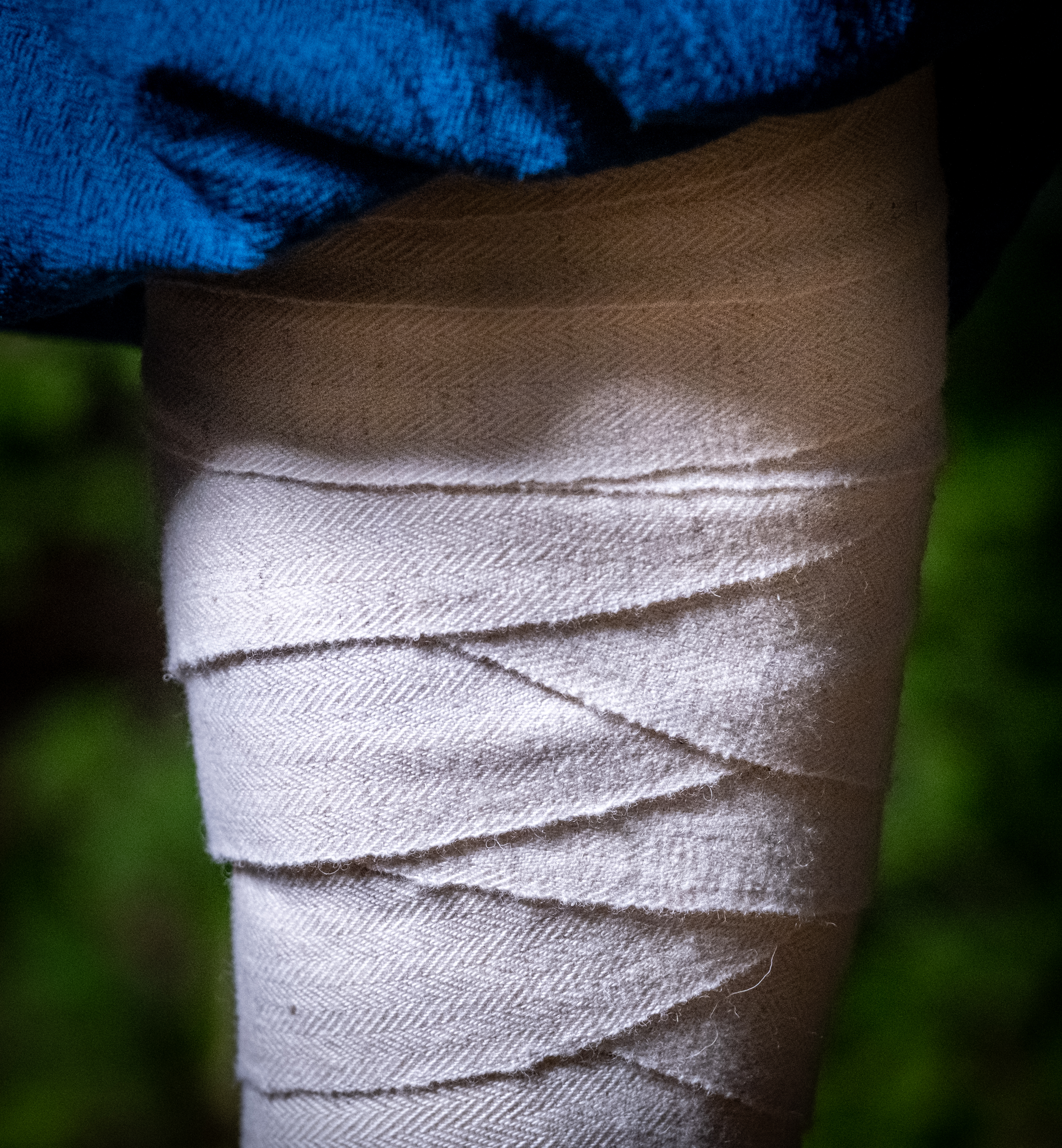 In several images from the Vendel and Viking eras, both in European art and on gold figures, you can see that many men have cloth wrapped over their trousers/hose from the knee down to the foot. The legwraps may have had many functions, protection against cold and sharp vegetation, abrasion protection when riding and like many other things, it probably became a fashion statement.