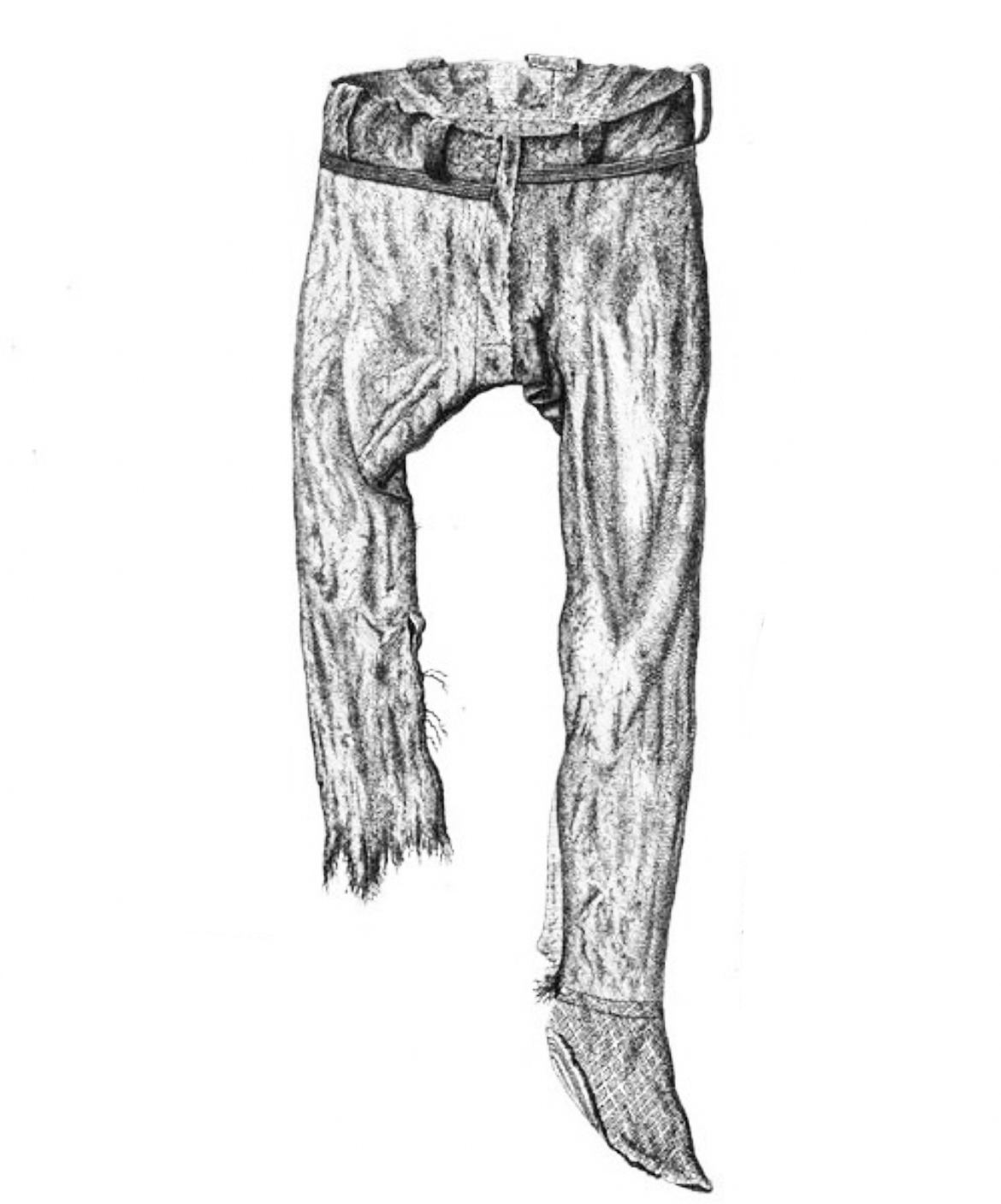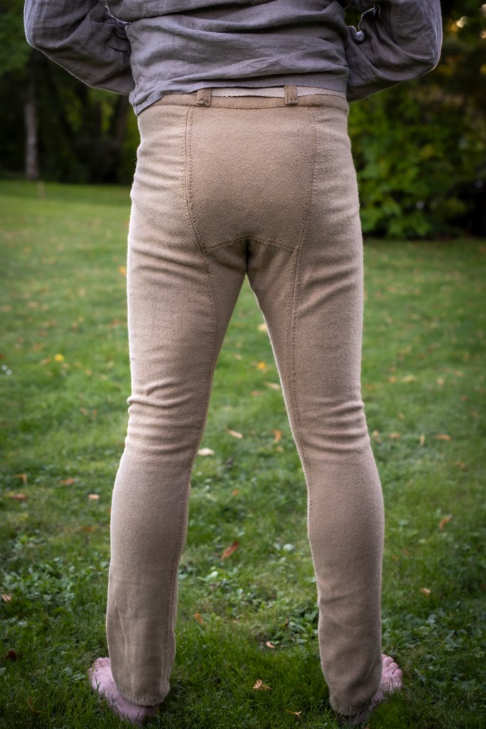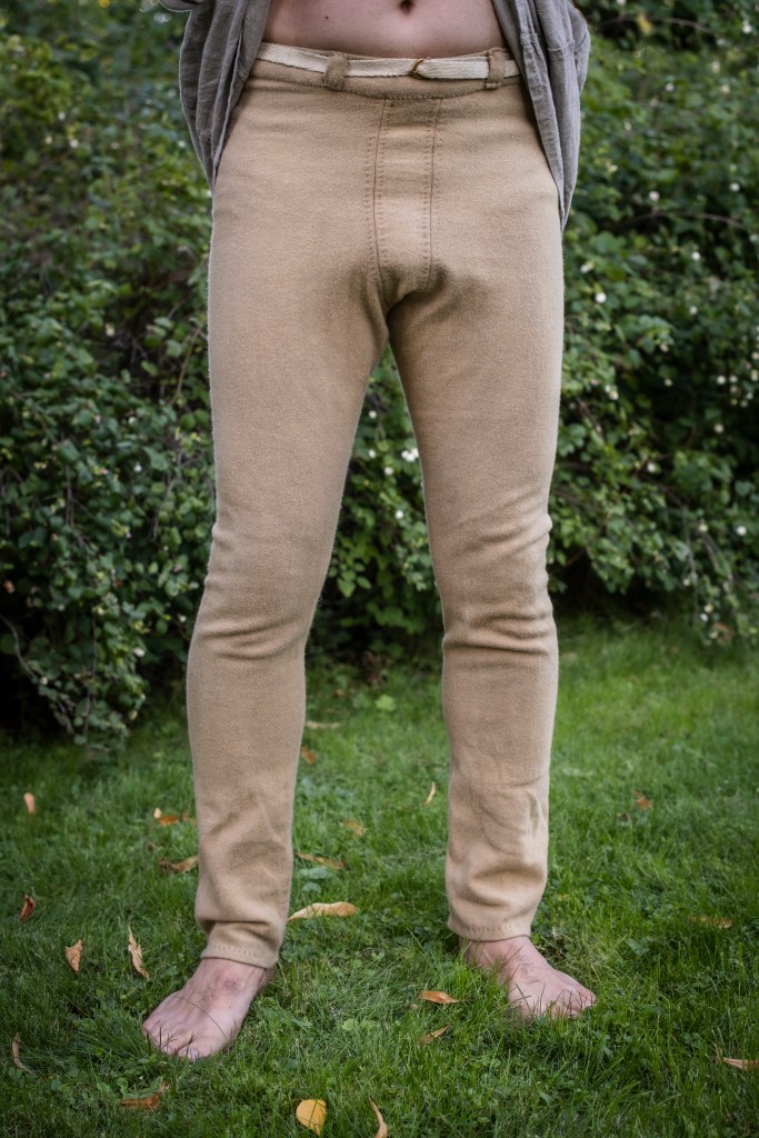 Depictions from the Viking Age indicate that there were both very wide, pleated trousers (so-called baggy trousers), hose with breeches and straight trousers in this model both with and without feet. For the time period of grave A11, I should choose hose and breeches. However, since my partner doesn’t like wearing hose and I think it’s an exciting challenge to sew a pair of Thorsbjerg trousers with a good fit, I choose that. I hand-sewn the trousers in undyed 2/2 wool twill and then dyed them light brown with walnut shells. The find in Thorsbjerg was mostly sewn in diamond twill, but several different fabric qualities were present and, according to Inga Hägg, they were dyed brown with walnut shells.