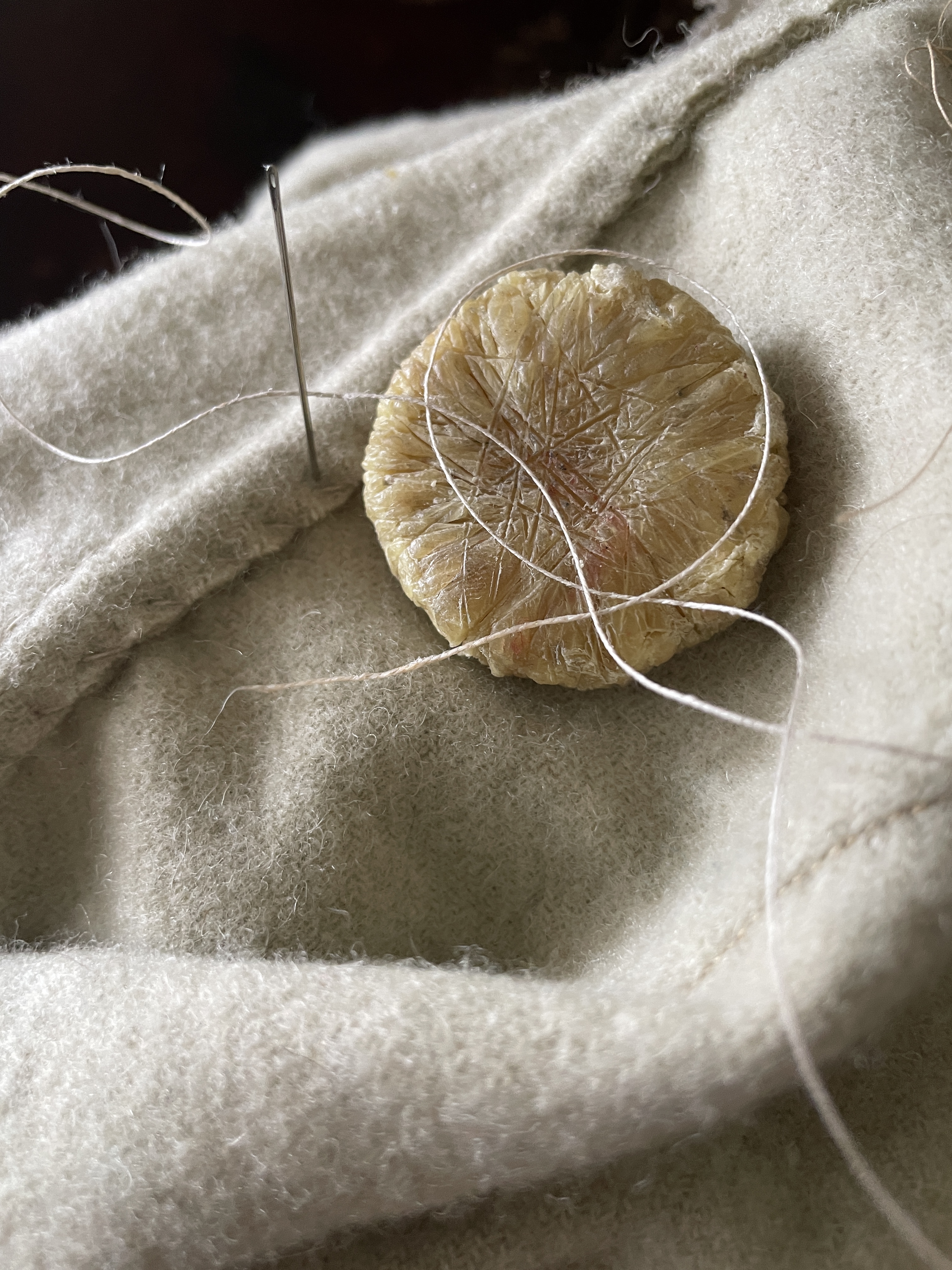 On to the decorative wool seams which also serve as reinforcement. They are sewn directly onto the hat and reminds me of tablet weaving but are sewn with a needle instead. Time-consuming but fun. I chose to sew them on in a natural grey wool yarn to give a contrasting shade. Finally I plantdyed the hat blue with indigo.