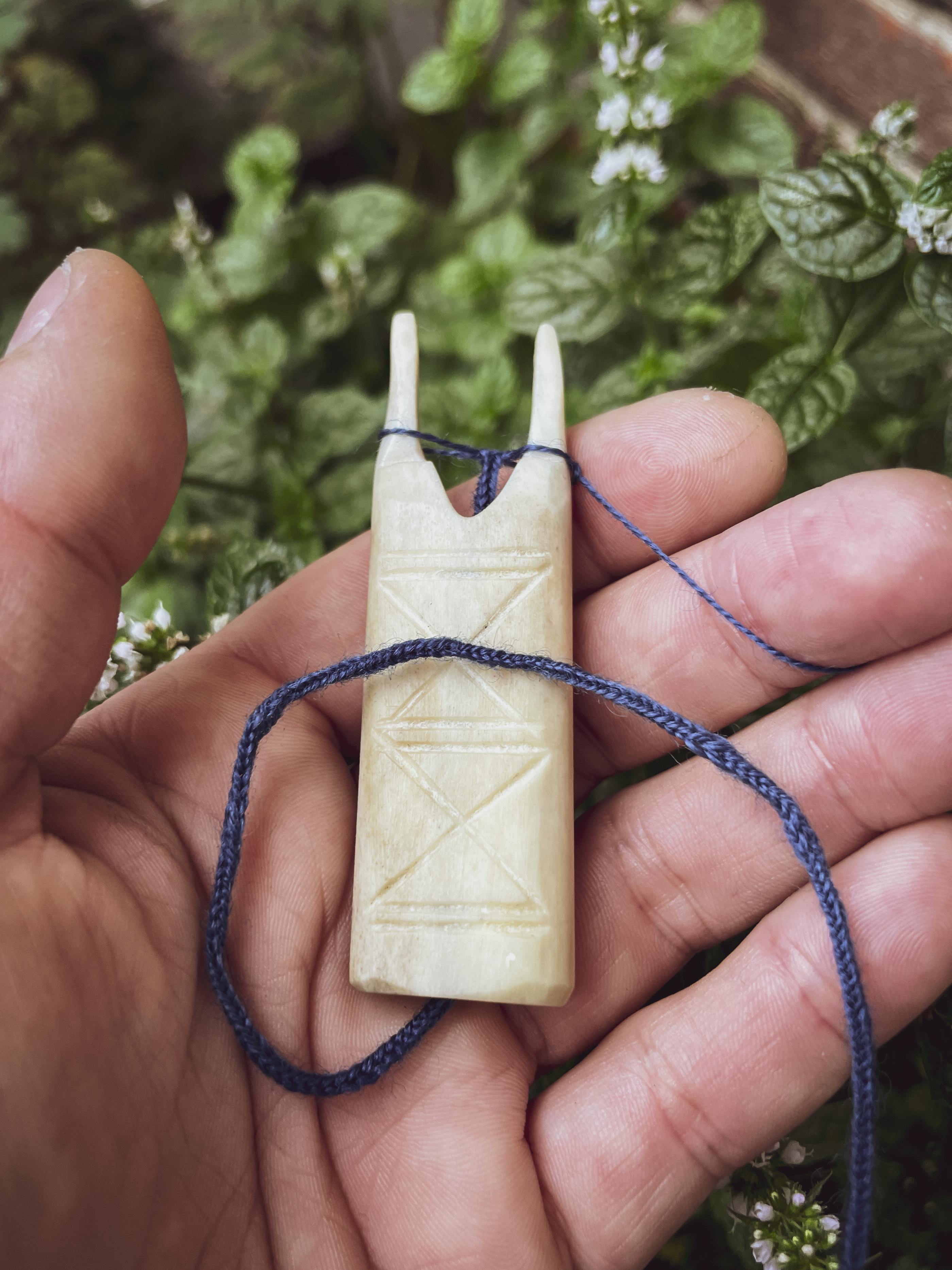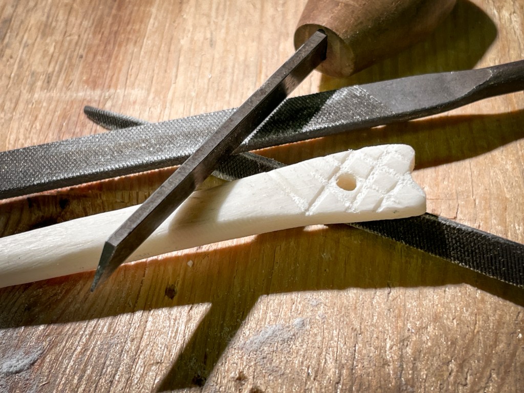 The man in grave A11 had not been cremated, but much of the man’s bone material had decomposed, and it is possible that a wooden or bone coat pin had decomposed in the grave over the course of 1000 years. A coat brooch in iron, bronze or silver should have remained, however. So I have chosen to make a coat pin based on a model from an archaeological find in Sigtuna. The bone pin I have chosen is dated to 1050-1100, contemporary with grave A11, and was found in house A61 together with several similar bone pins. It is about 13 cm long and decorated with a checkered pattern. I made my coat pin from cow bone and it was unexpectedly easy and fun to carve out the shape and decoration. My pin is not an exact copy of the original, but similar enough to be a likely design in Uppland at this time period. To secure the cloak with the pin, I made a woolen cord on my replica of a Viking Age lucet from Sigtuna.