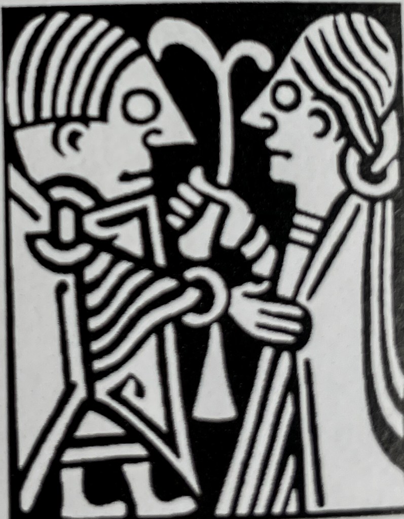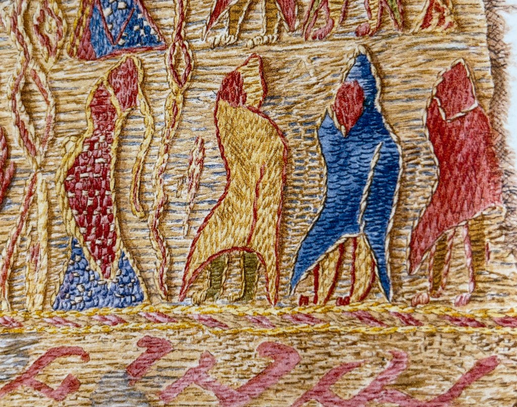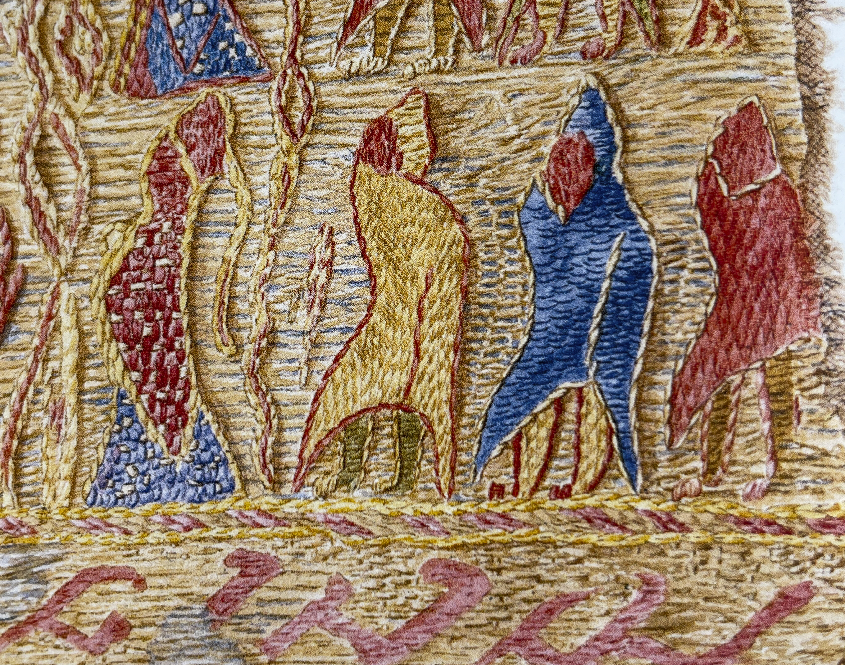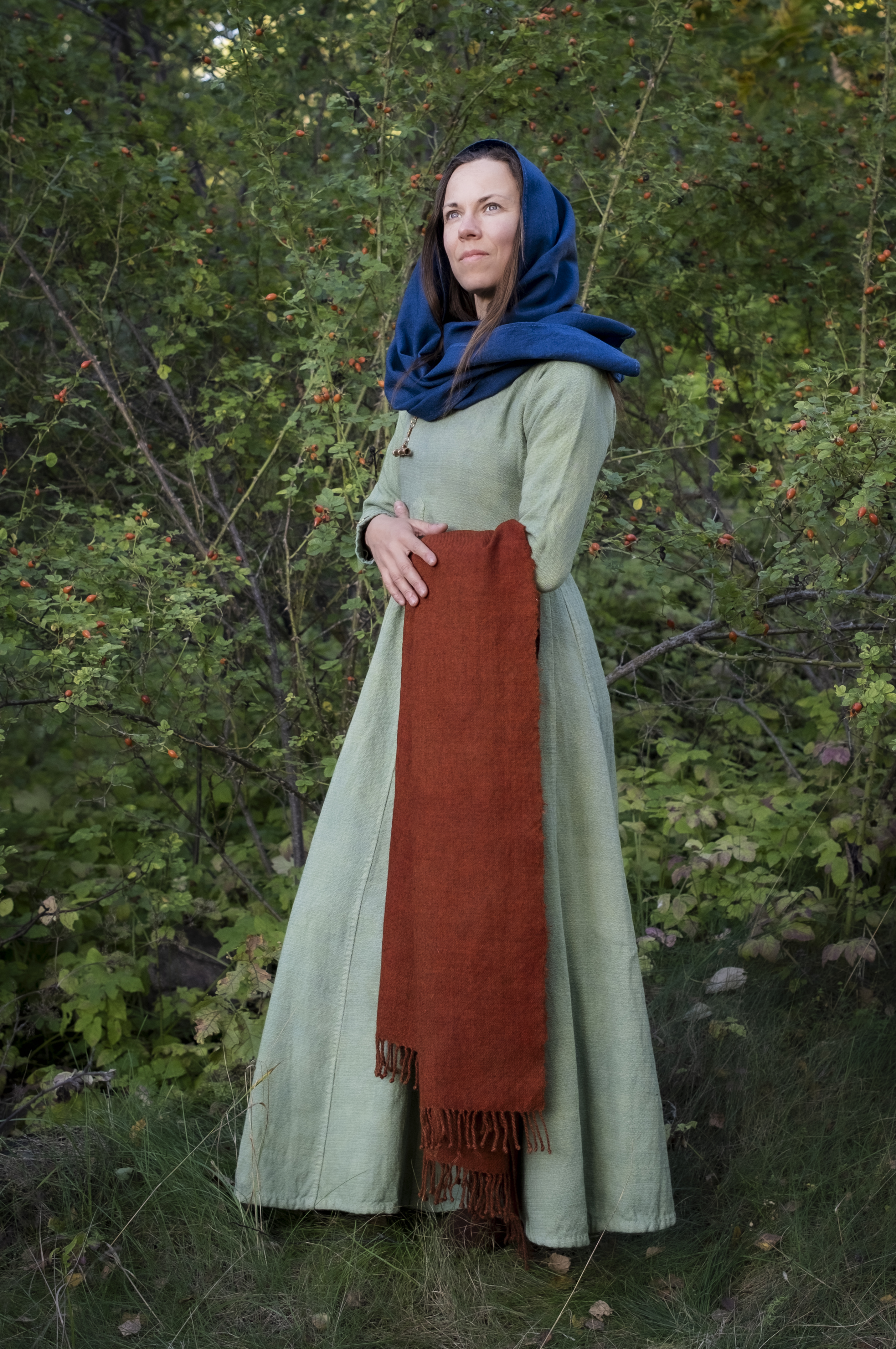 I base the rectangular shape and size on various Viking Age depictions such as the “Valkyrie pendant” from Botkyrka, a pendant from Tuna in Uppland, the Oseberg tapestry from Norway, and others. There are also many fine depictions of women with shawls on all the “Gold foil figure” that have been excavated. However, these are dated to the Vendel period or early Viking Age. All of these archaeological finds depict women with a rectangular shawl that either hangs straight down or is folded double like a triangle over the shoulders.
