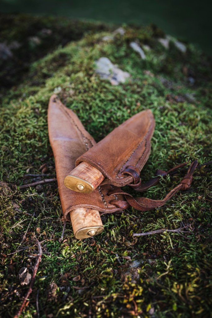 Once home I started working on the handles and it was easier said than done. I managed to crack two nice pieces of wood before I got it right. Because of my failures I ran out of material and had to tinker a bit but in the end I was still satisfied. One knife has a handle of birch root and elk antler. The other has a handle of what I thought was birch root but when I rubbed some oil on the wood it changed color and I think it may be rowan. Finally my friend Faravid sewed two nice leather sheaths for the knives in hand-tanned leather.