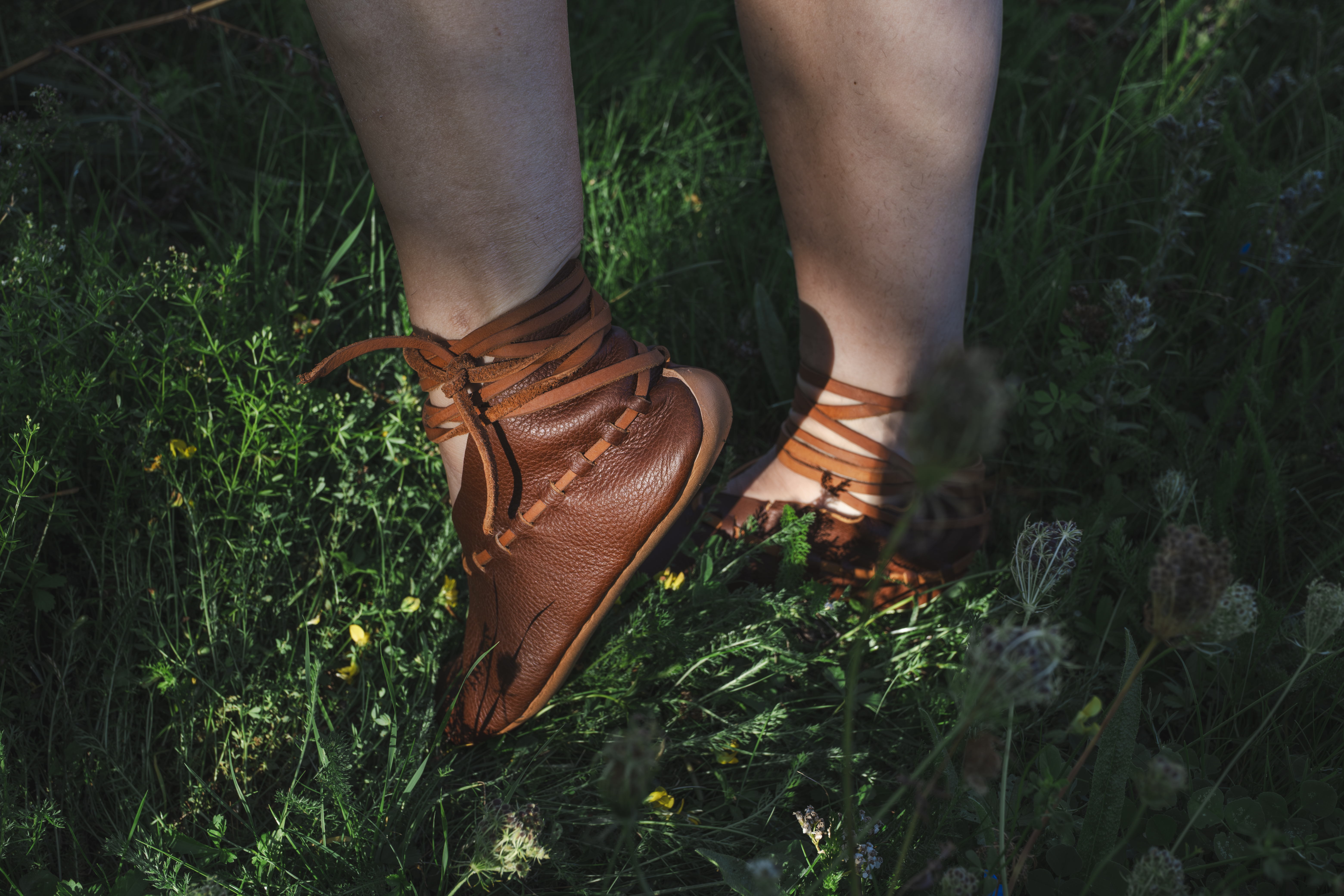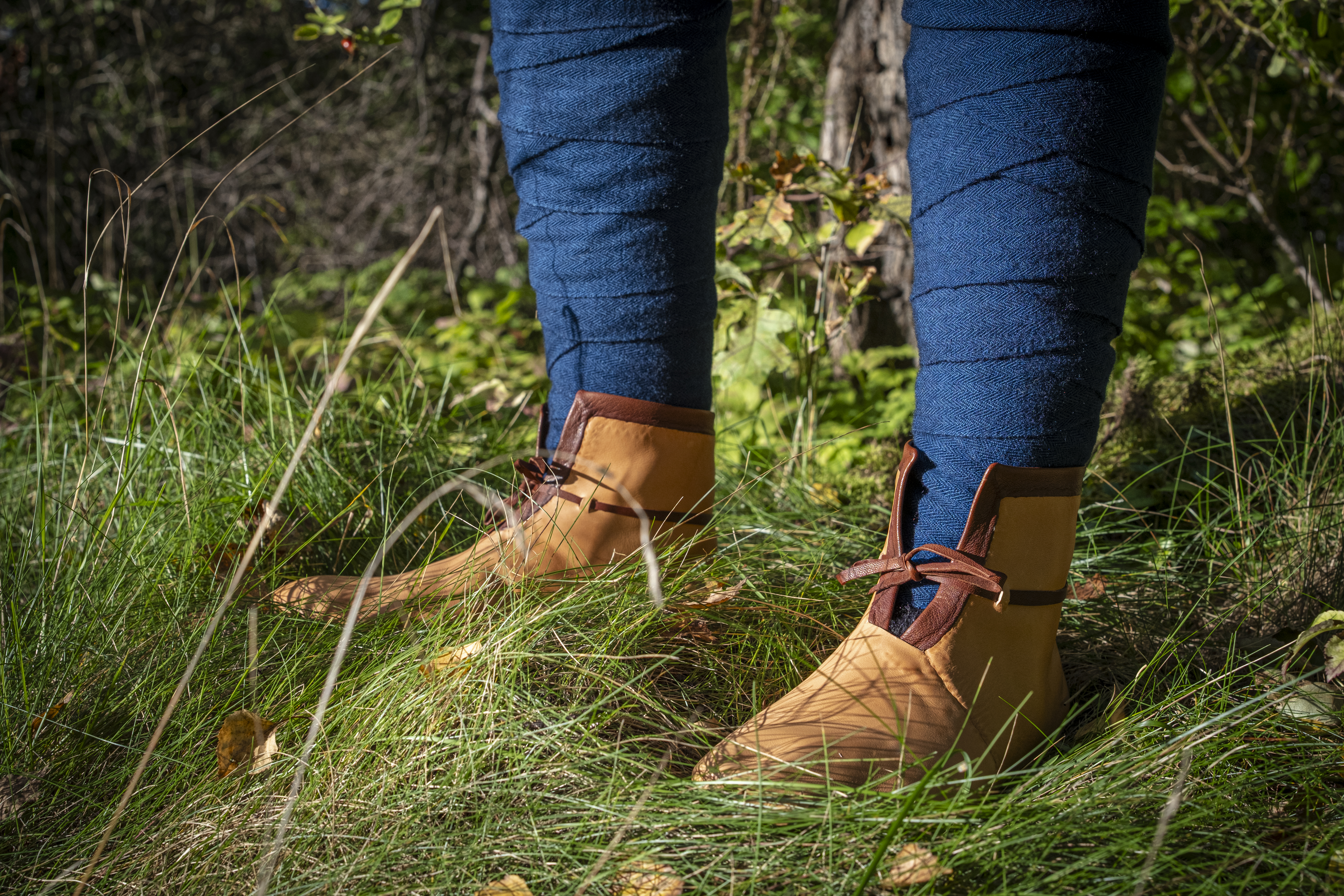 I wanted to recreate a shoe model that was found as close in time and geography as possible and after talking to experts Sofia Berg and Henrik Summanen I fell in love with an archaeological find from Sigtuna. It is a rather strange high-heeled strap shoe. As far as I know, it has never been recreated before and it fits well both geographically and temporally with grave A28. To my great delight Sofia agreed to sew me a pair. The shoes are turned-sewn on a last with boar bristles. It turned out that the strange high heel provides practical protection against chafing on the achilles tendon from the straps. These shoes are an interpretation of the find in Sigtuna and fit me perfectly. Many thanks Sofia Berg.