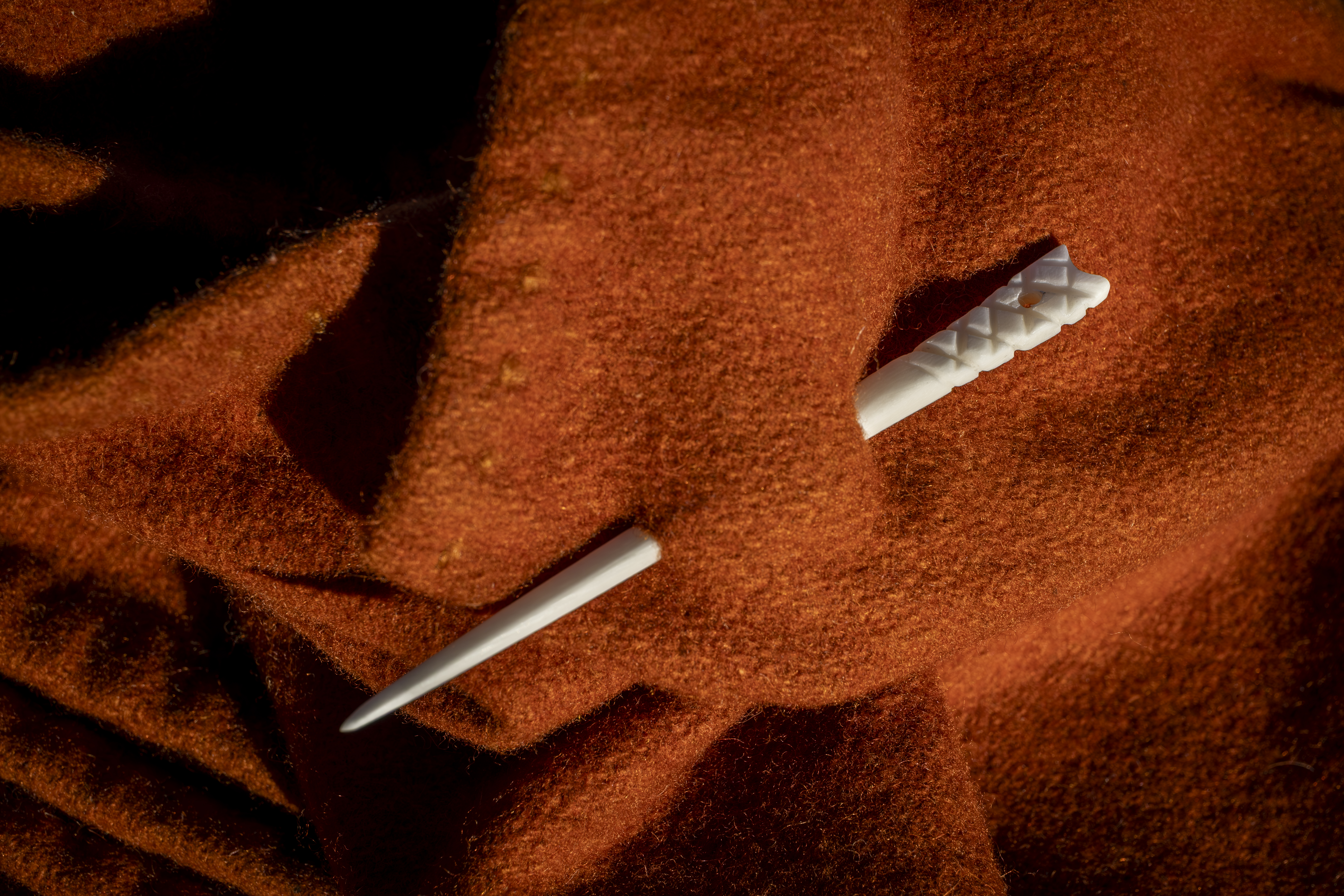 Viking Age bone/antler/wood pins are relatively common archaeological finds. They may have had several different uses, holding together cloaks/shawls or hairstyles. It is likely that bone and wooden pins were more common in the Viking Age than precious metal buckles, but many of these have decayed or been burned in connection with cremations.