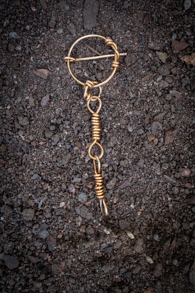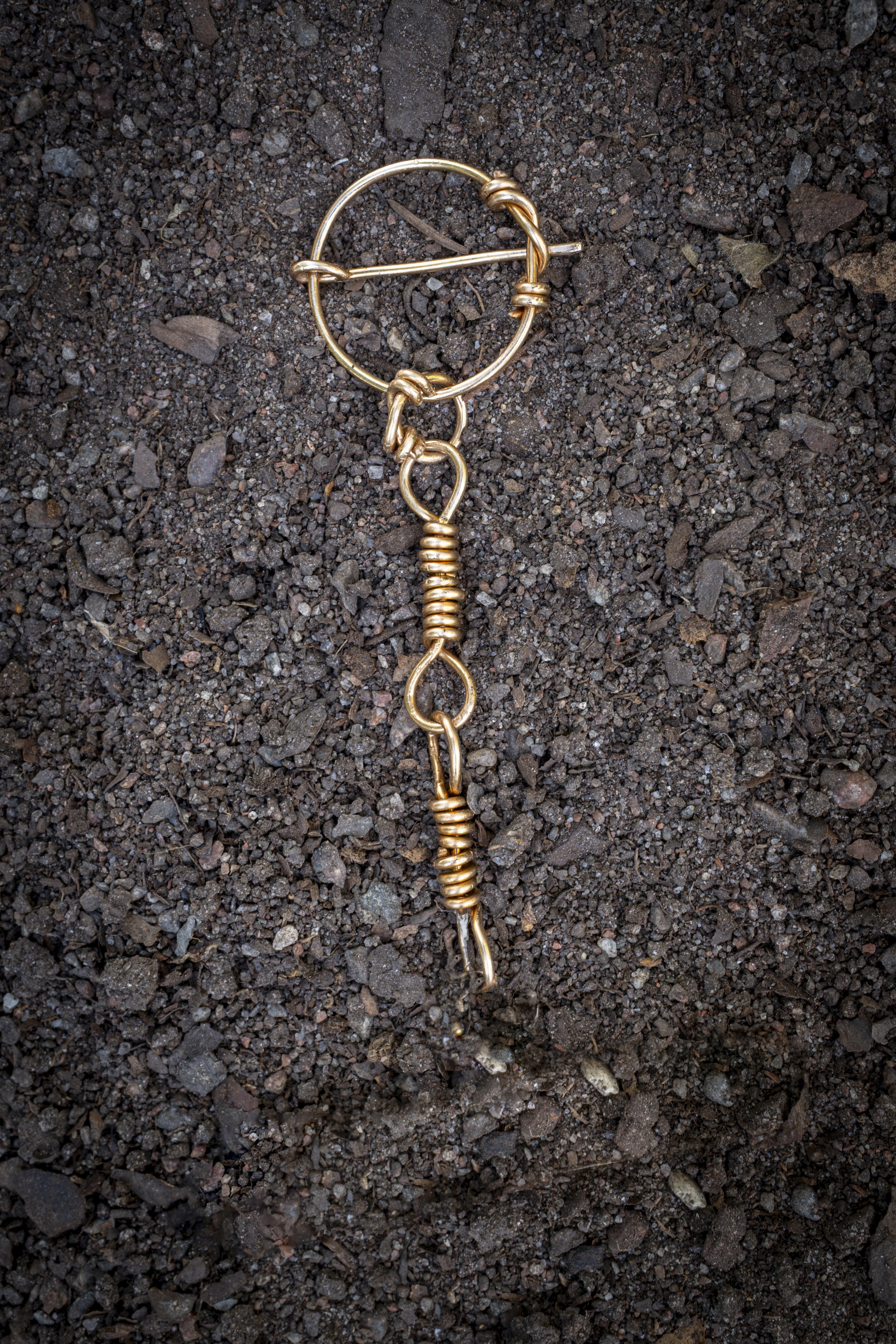 I bought a replica of the needle case from Historical textiles and made the ring brooch, the chain links and the needle case ring from 1 mm thick bronze wire. It was tricky as the dimensions are so small but after a few tries I got an ok result. In a time when pockets had not yet been invented, this is a solution for having your needle case close at hand.