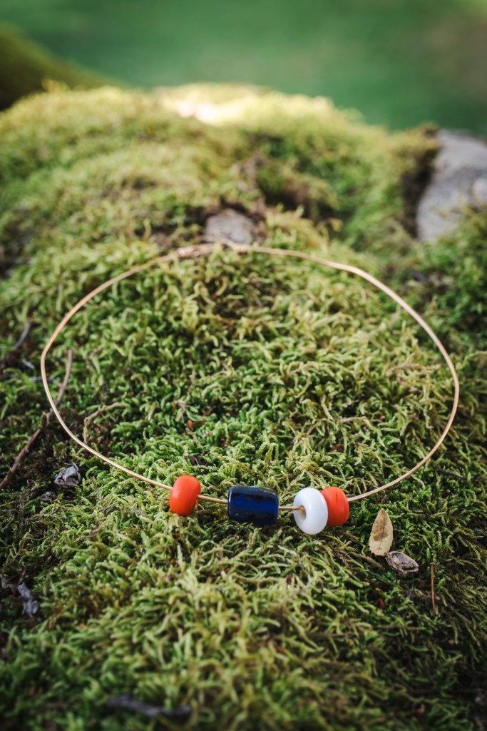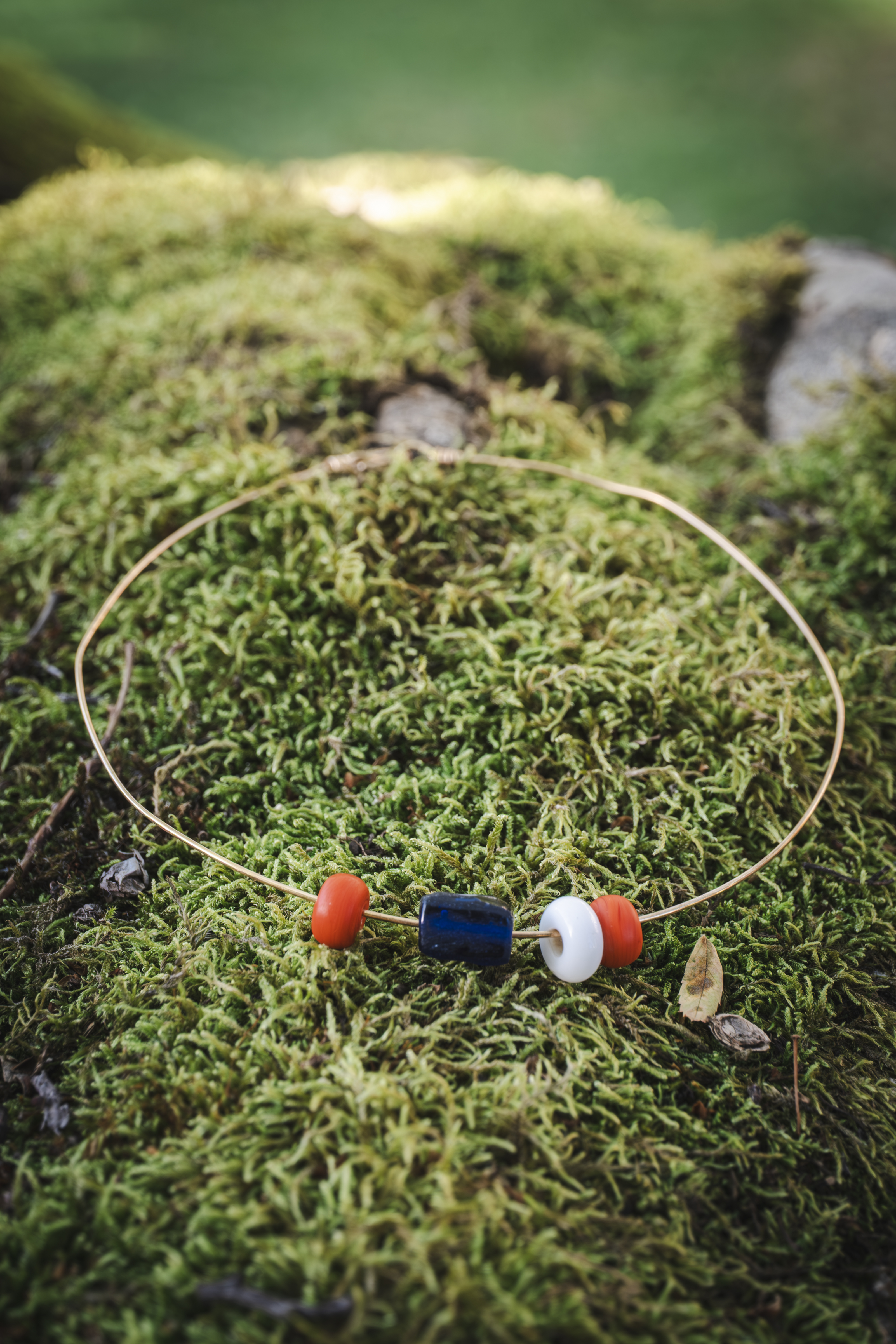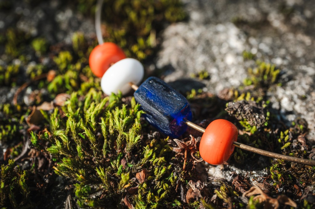 In grave A28 there were two red opaque glass beads, one white opaque glass bead and one blue faceted glass bead. As the grave lacked dubble brooches and is dated to the late Viking Age when the fashion for dubble brooches and apron dresses was beginning to go out of style, my interpretation is that the beads were worn as a necklace. I chose to thread the beads onto a bronze wire of the same thickness as the bronze chain in the grave. The inspiration for that interpretation comes from a bead necklace in Birka, but it is a speculative interpretation on my part. The beads could just as easily have been worn on a textile or leather string. I bought the glass beads from Linda Wålander after examining and measuring the original beads at the Historical Museum.
