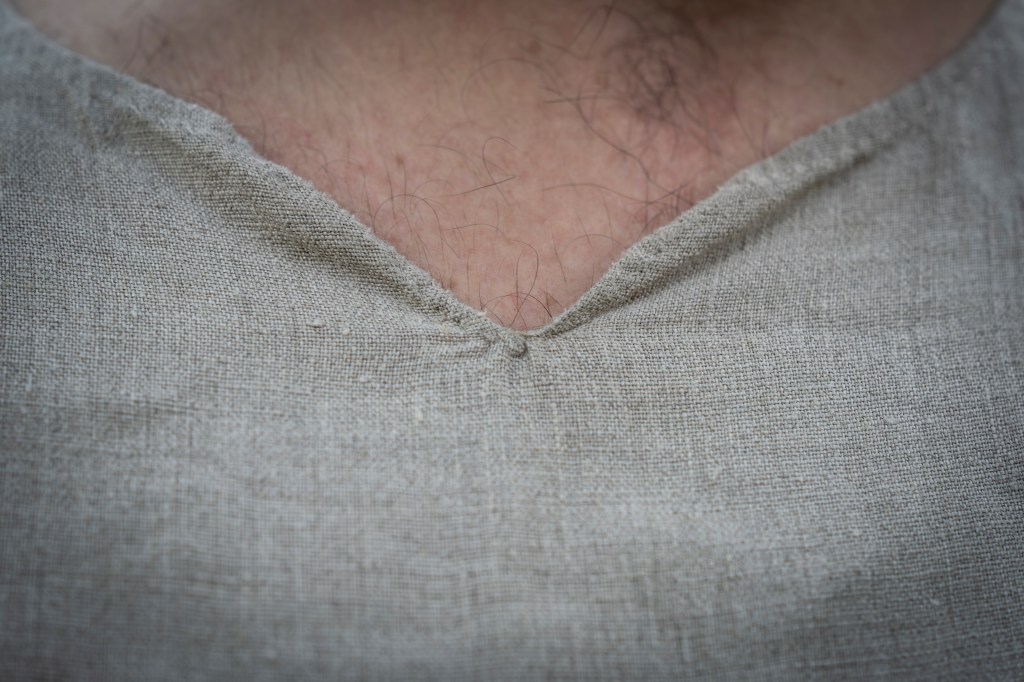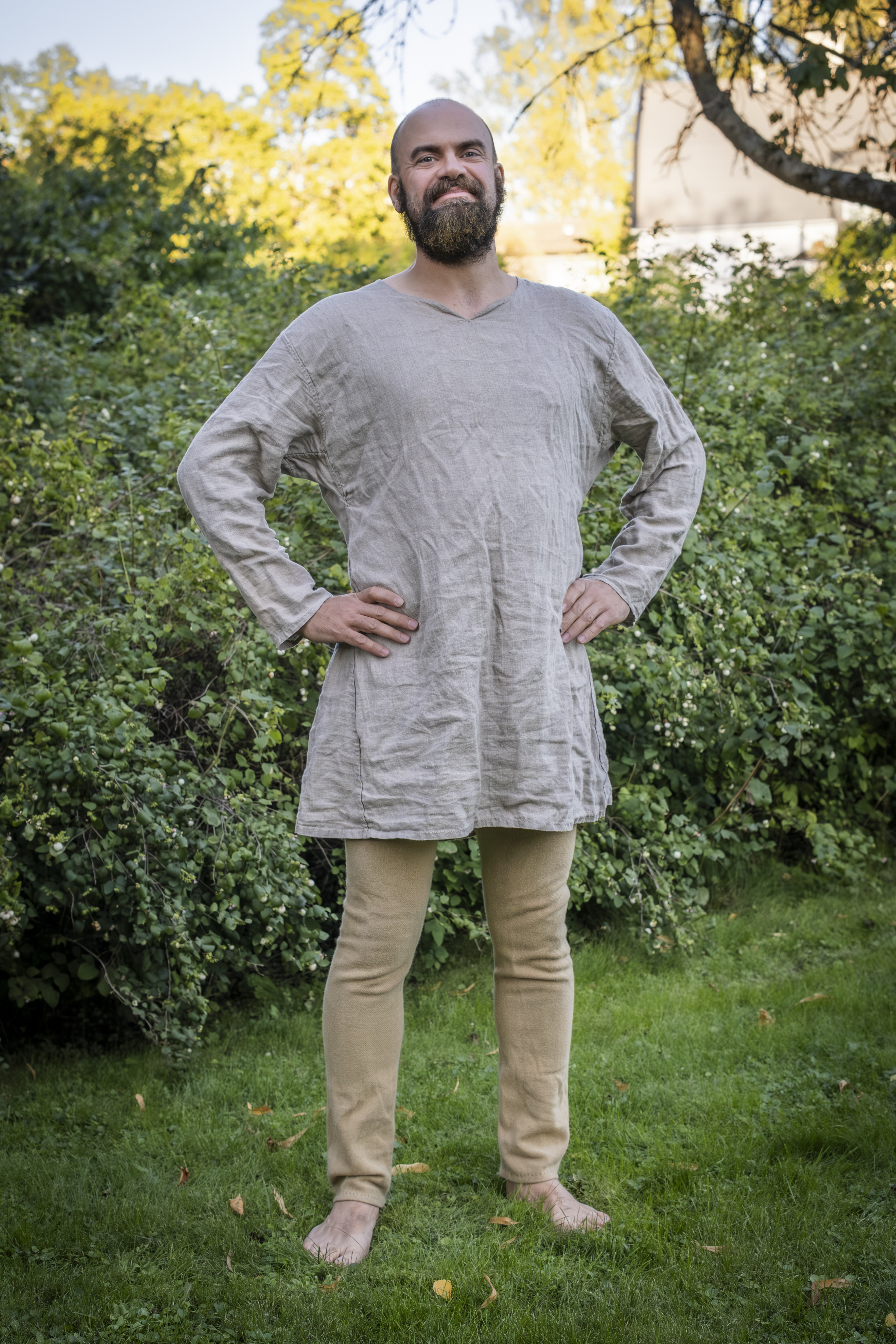 In the archaeological report, Andersson writes that “on the back of one of the belt straps there were fragments of a linen fabric, woven in plain weave with Z-sunn thread. Andersson further writes that the linen could be fragments of trousers/hose, but I see it as more likely that it is an under tunic that the strap strap had been laying against where a woolen over tunic had slipped up. Unfortunately, the textile fragment is not preserved to be looked at more closely today. My interpretation could of course be wrong, but if you look at grave material from the Viking Age and art such as the Oseberg Tapestry, trousers/hose seem to be mostly made of wool that can be plantdyed, and linen trousers do not seem to occur to the same extent. Furthermore, my interpretation is that a man who was wealthy enough to wear a rich belt would also have a comfortable and washable linen tunic closest to his body. I therefore chose to interpret the linen fragment as a tunic and sew it in undyed linen plain weave. The model is straight, rectangular pieces with wedges.