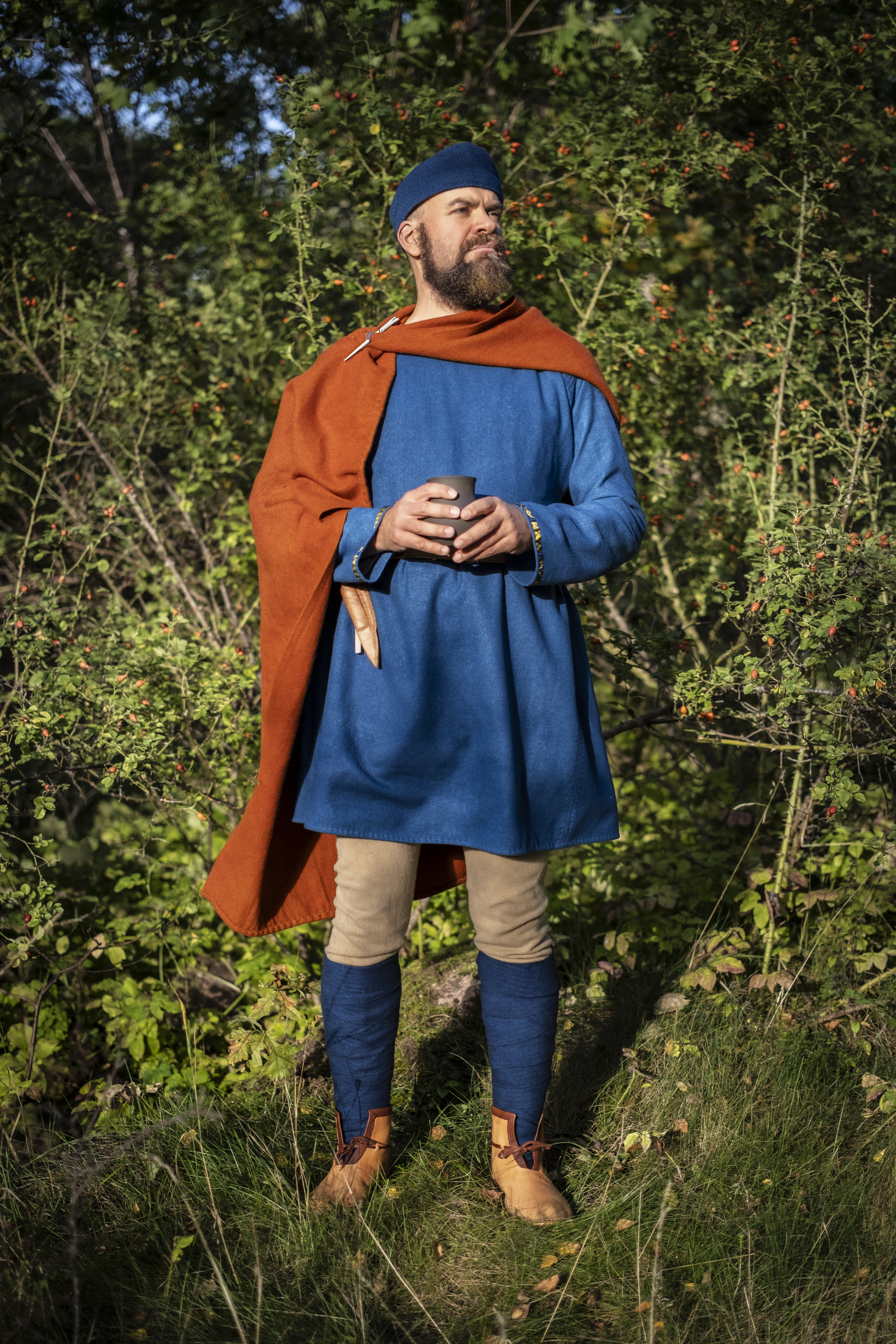 There are no textile remains in grave A11 that can be interpreted as a cloak, but cloaks occur in depictions of Viking Age male figures. Inga Hägg writes about about 10 archaeological textile fragments in graves at Birka that have been interpreted as cloaks and there is at least one find from Hedeby. The majority of these finds have a buckle or garment pin that holds the cloak together over one shoulder. If you look at how many cloak brooches have been found from the Viking Age, it is reasonable to assume that the man in grave A11 had a cloak as part of his clothes. A cloak is both practical protection against the weather and a garment that can show social status with strong colors. I have chosen to make a rectangular cloak in thick wool twill and plantdye it red with madder.